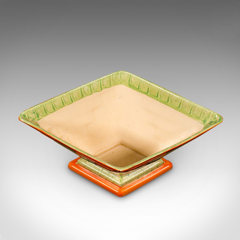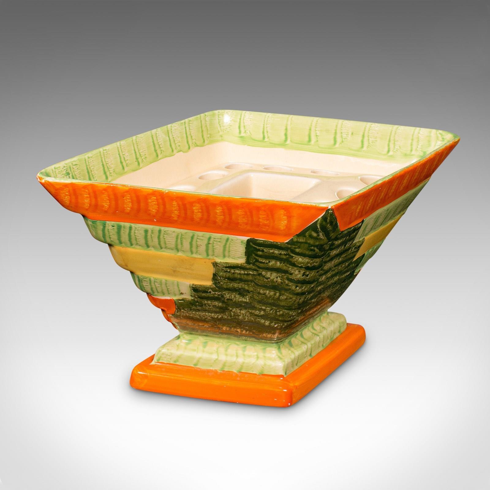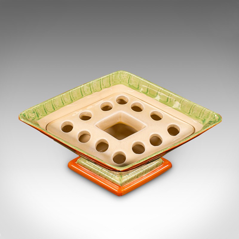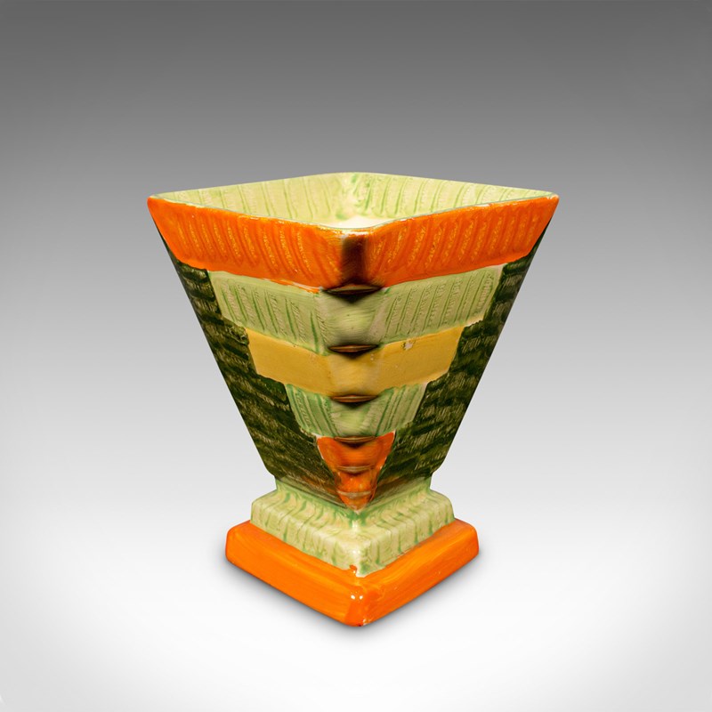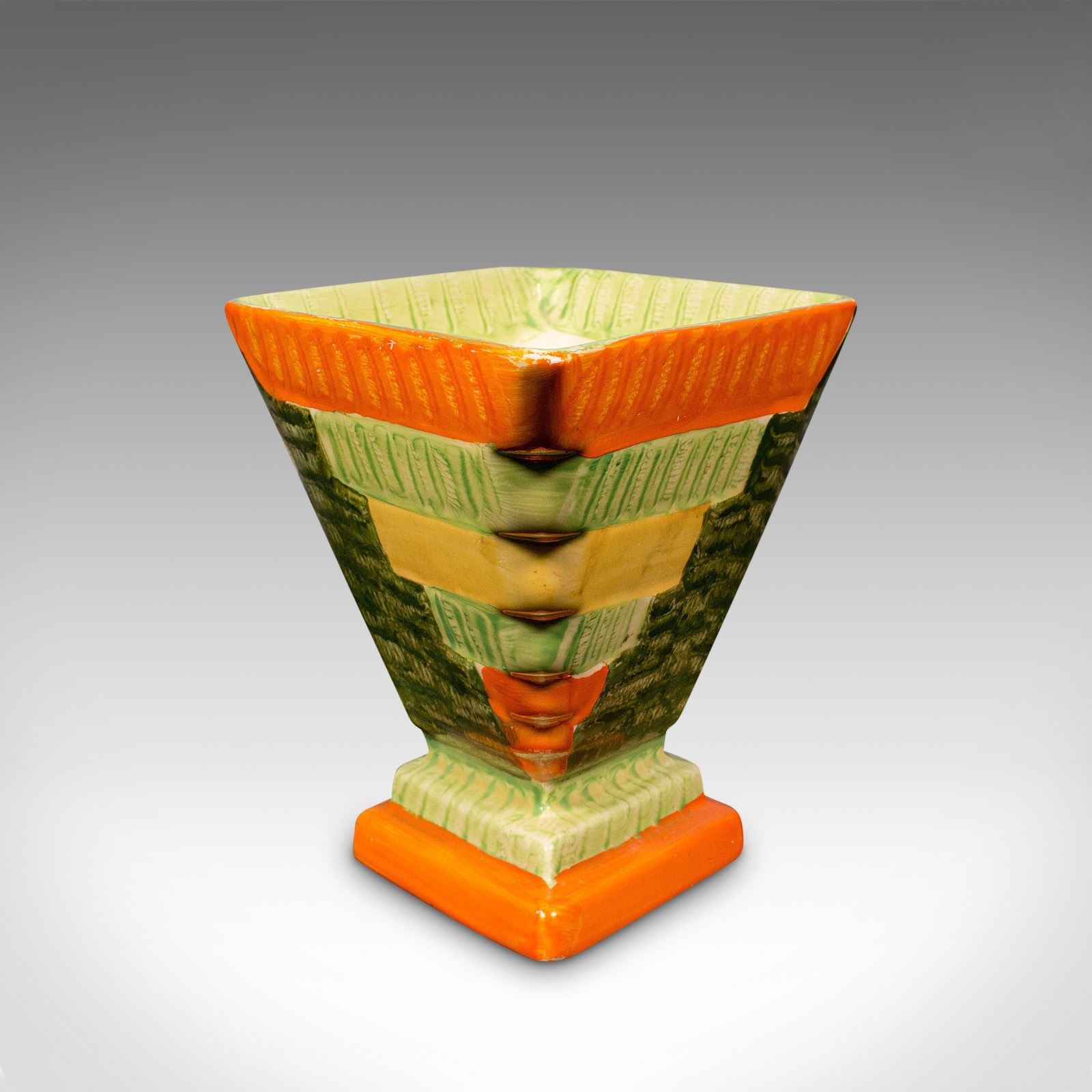 This is a vintage dried flower vase. An English, hand-painted ceramic decorative diamond shaped pot, dating to the Art Deco period, circa 1930.