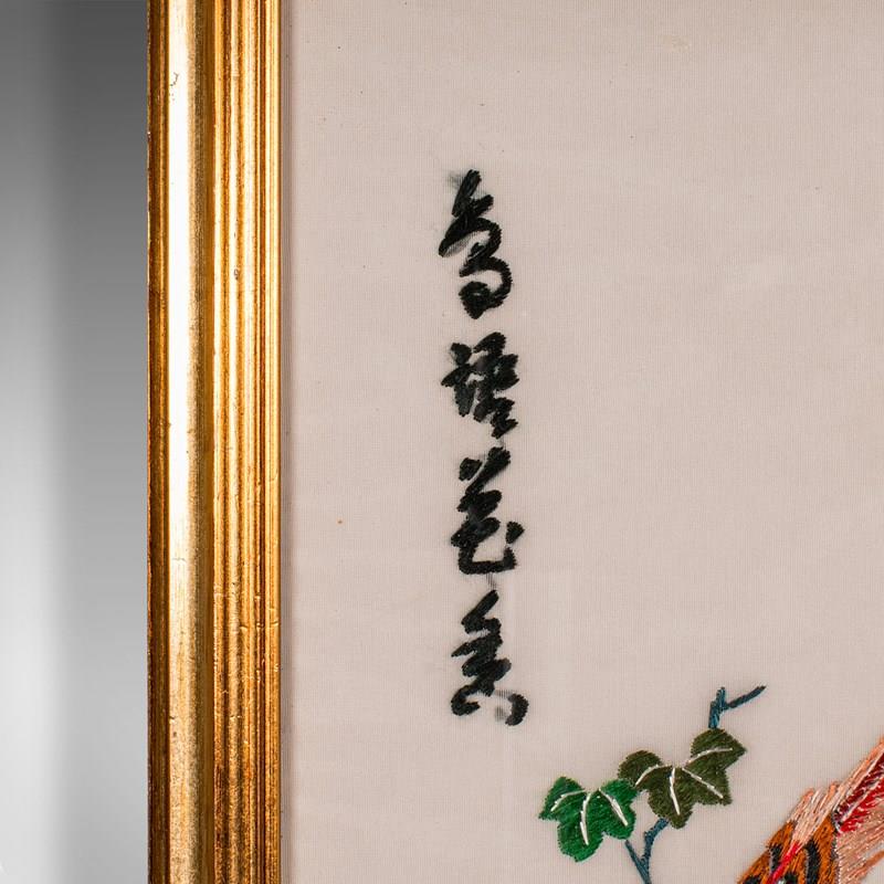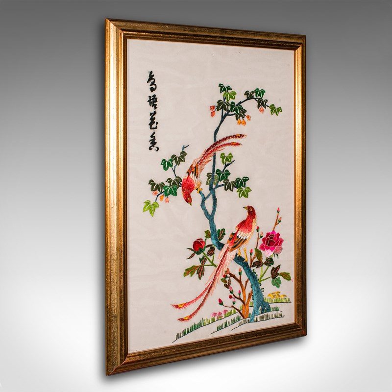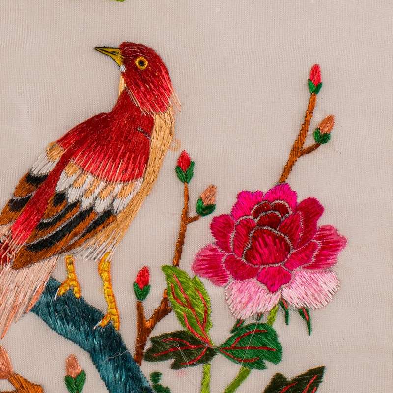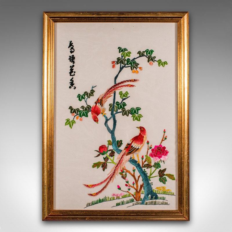 Vintage Embroidered Panel, Korean, Silk Cotton, Embroidery, Bird Motif, Art Deco