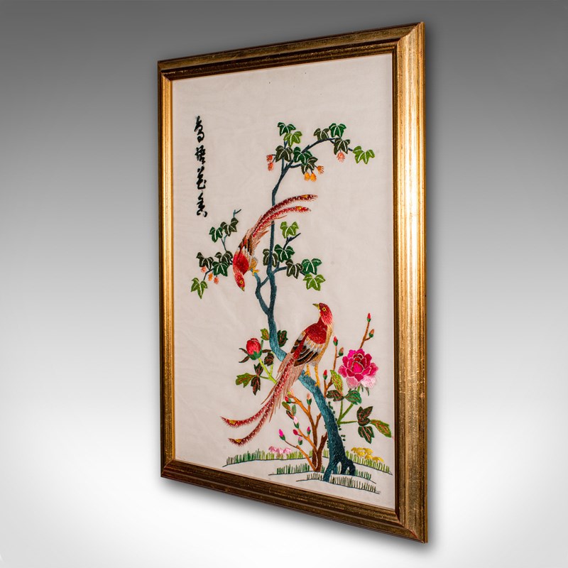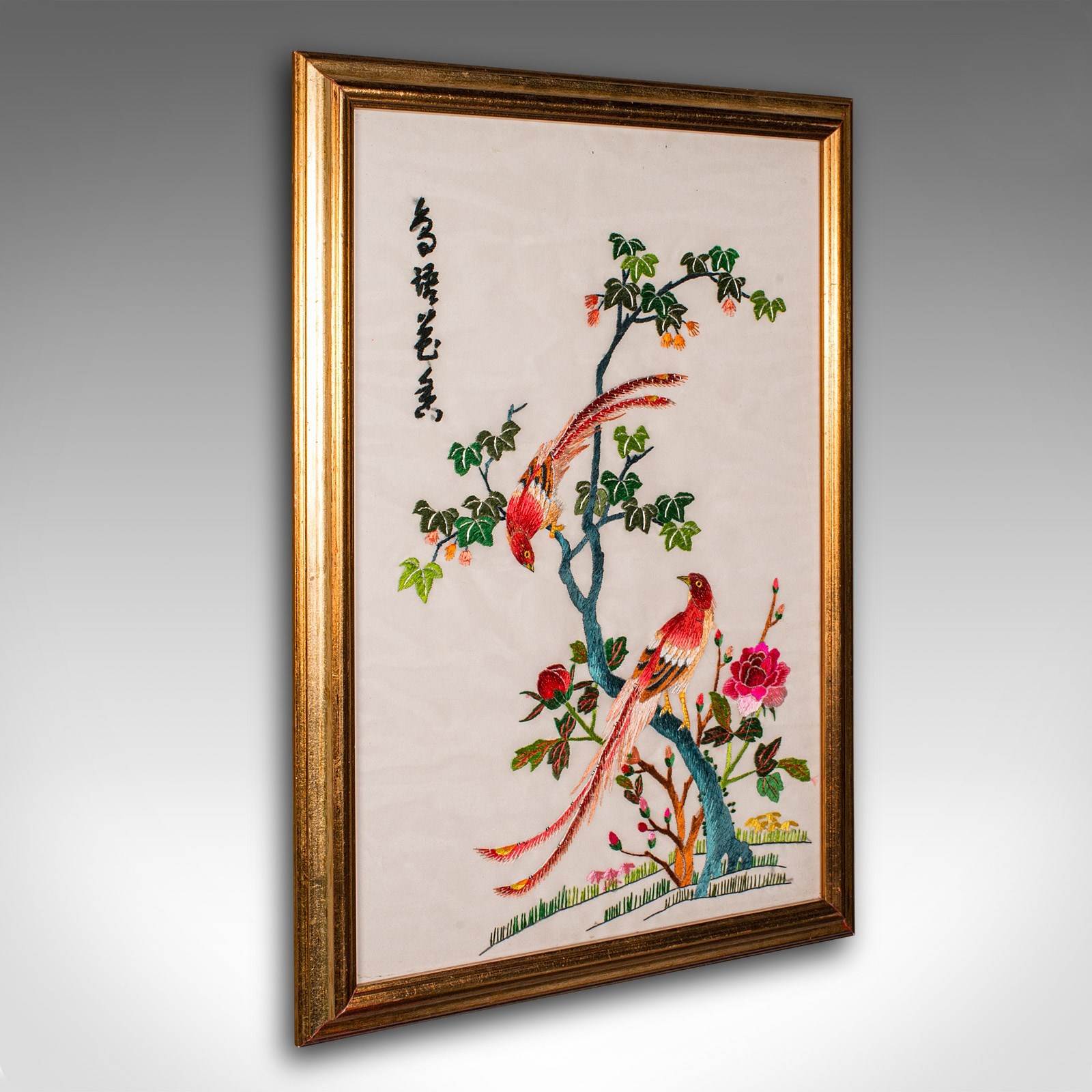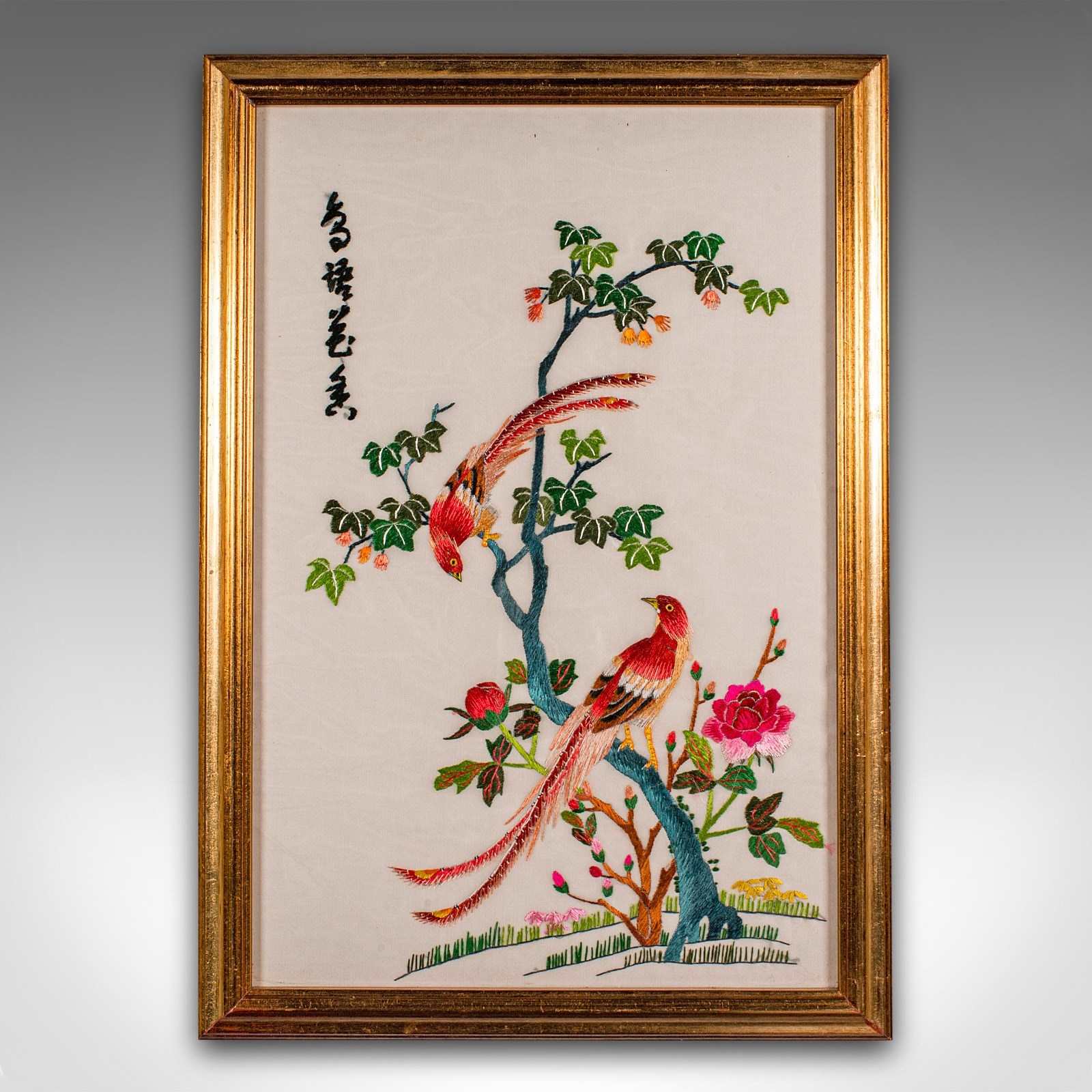 This is a vintage embroidered panel. A Korean, silk cotton embroidery of colourful birds, dating to the Art Deco period, circa 1930.