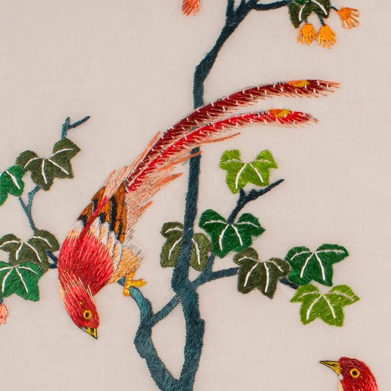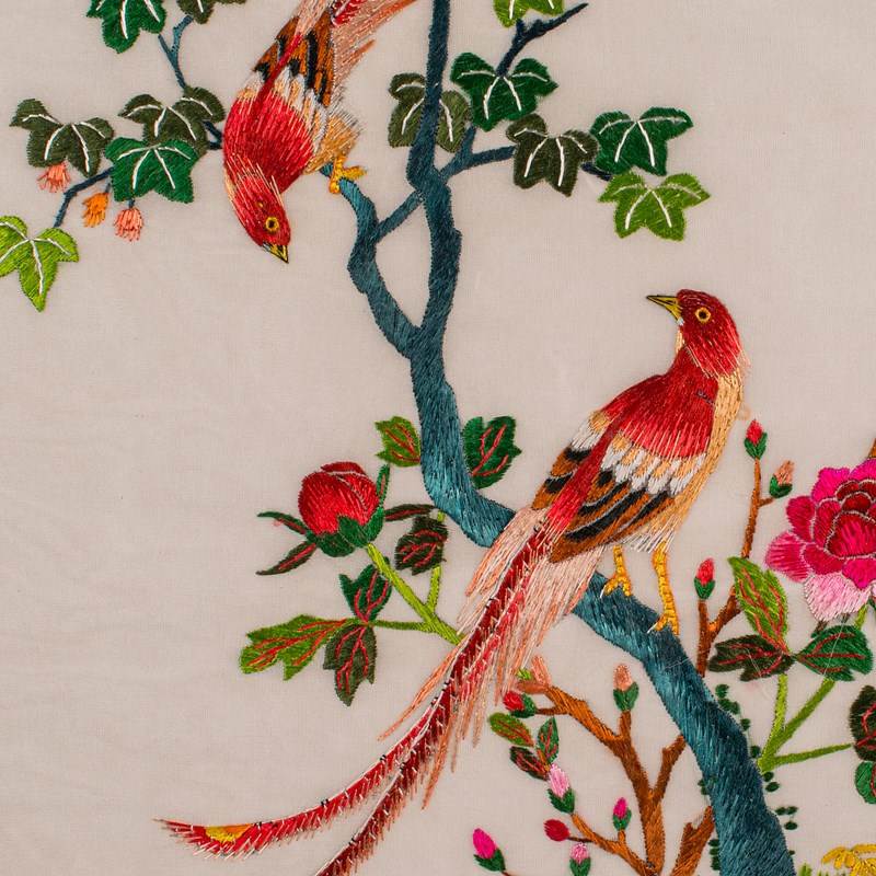 - Presents two colourful birds of paradise within a flowering tree, finished with calligraphy to the upper corner