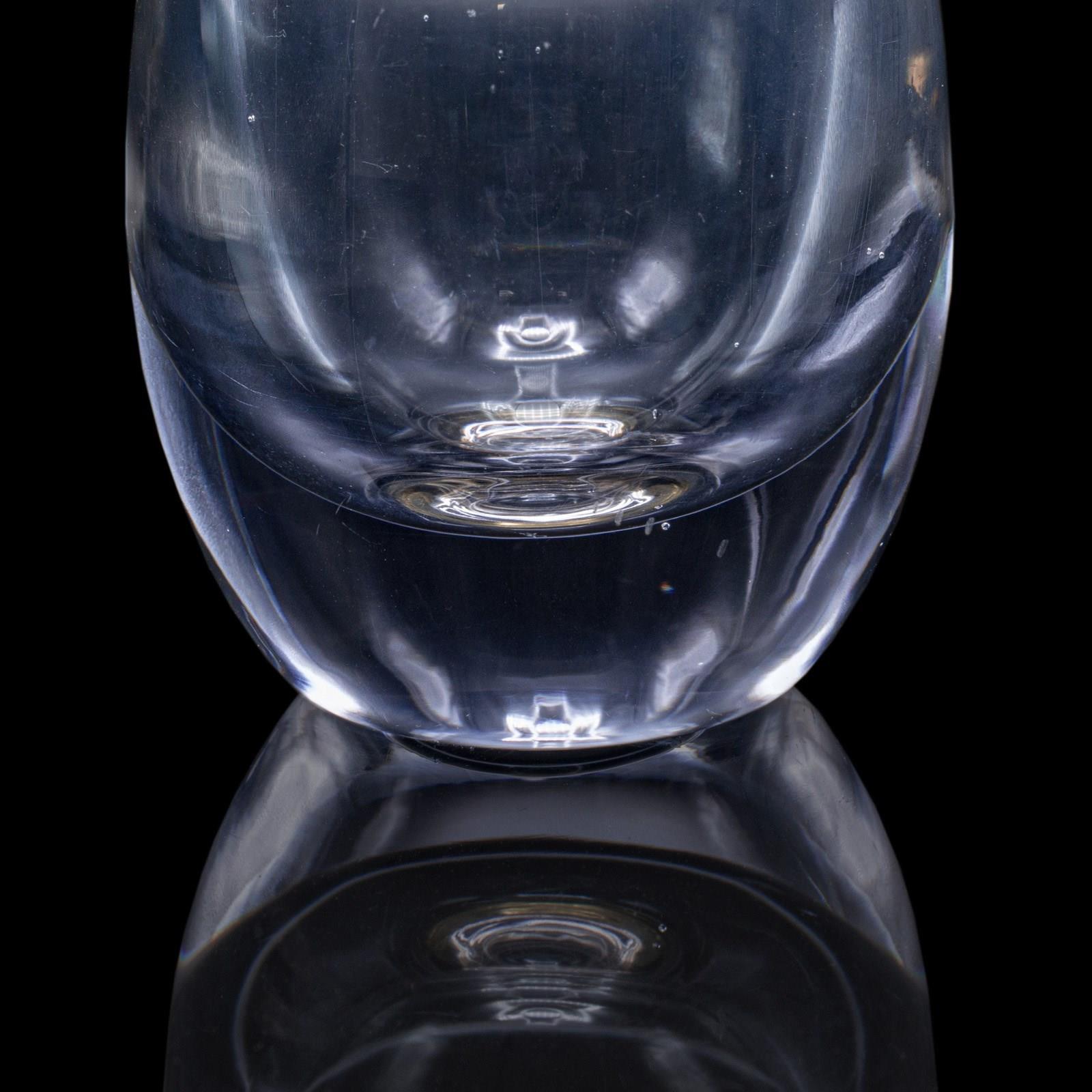 This is a vintage flower sleeve, crafted in England and dating to the late 20th century, circa 1980. This charming art glass display vase presents an ephemeral hint of colour, with delicate tones of violet and indigo adding subtle vibrancy. Compact and versatile, it makes an elegant choice for a single stem or small posy.