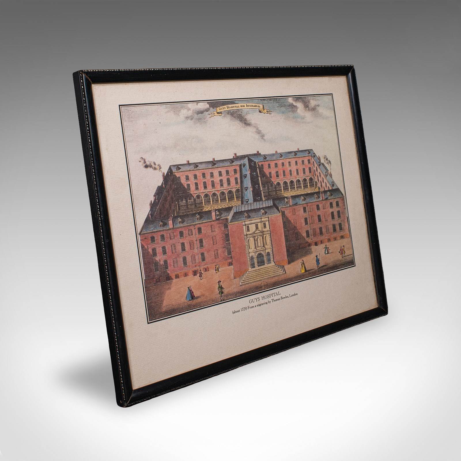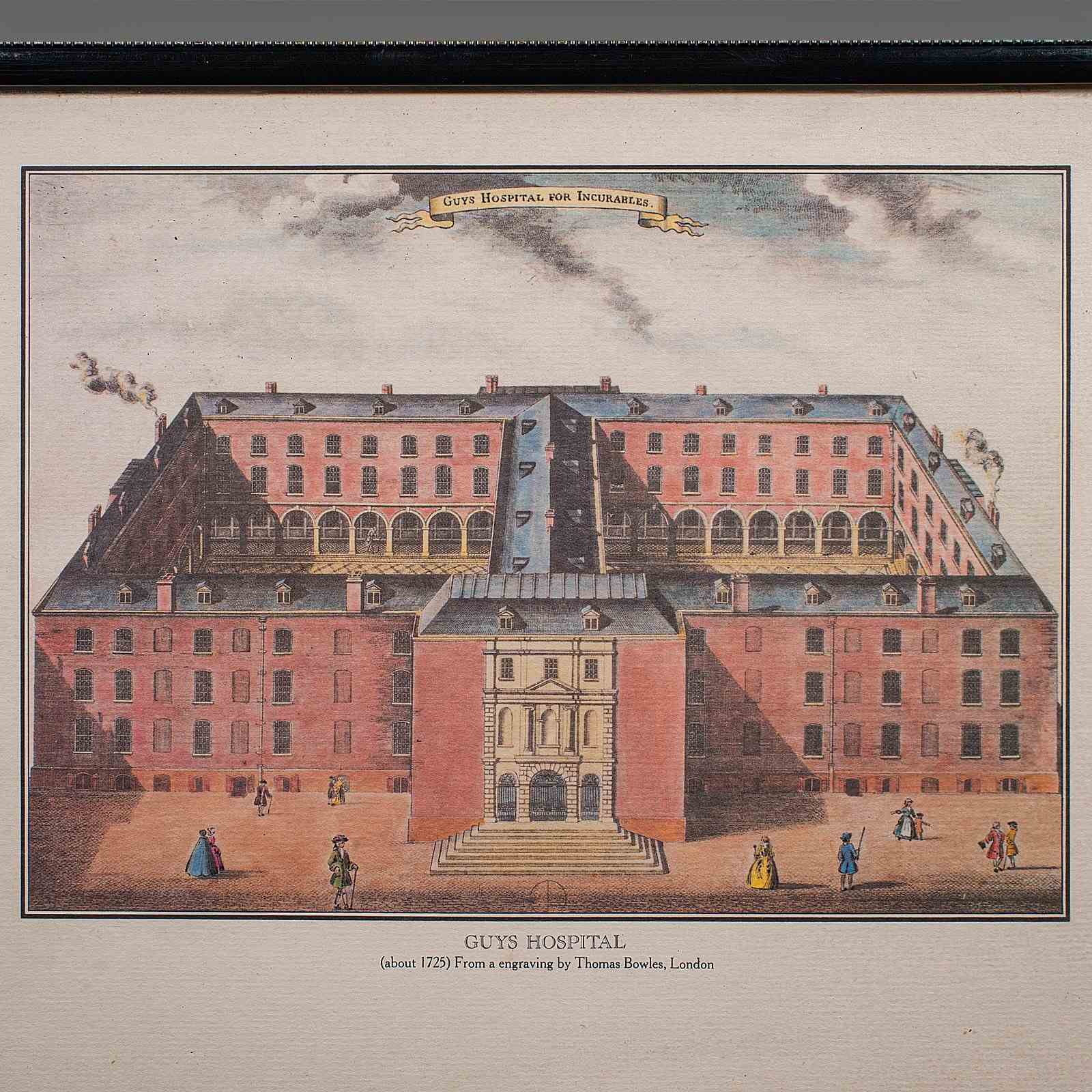 This is a vintage Guy's Hospital desktop picture. An English, framed engraving print after Thomas Bowles, dating to the late 20th century, circa 1980.