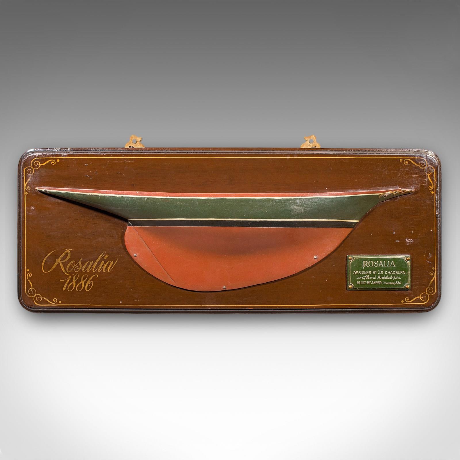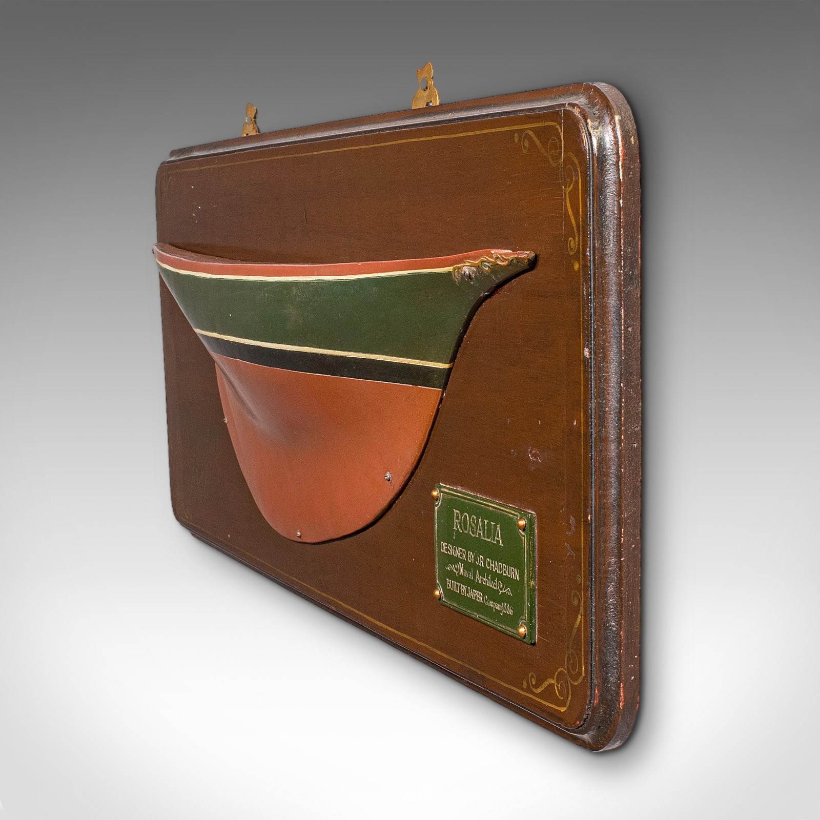 This is a vintage half hull model. An English, pine and composite shipwright’s plaque, dating to the mid 20th century, circa 1960. A fine nautical decorative piece in the Victorian tradition, with charming maritime character.