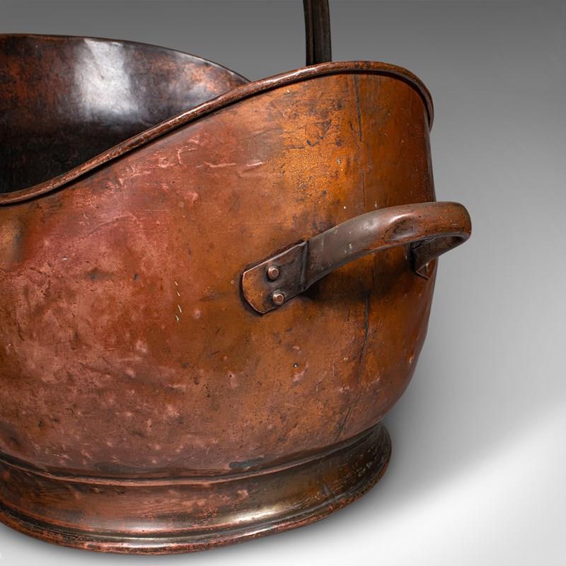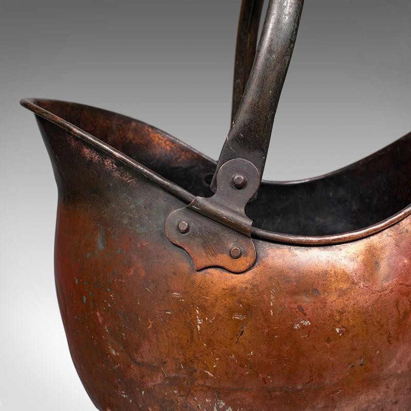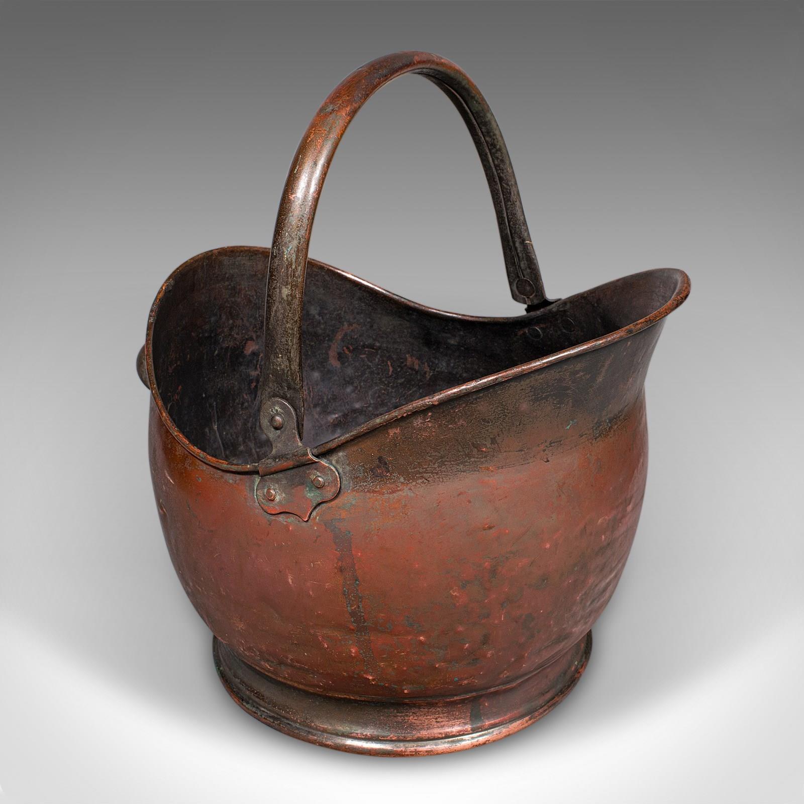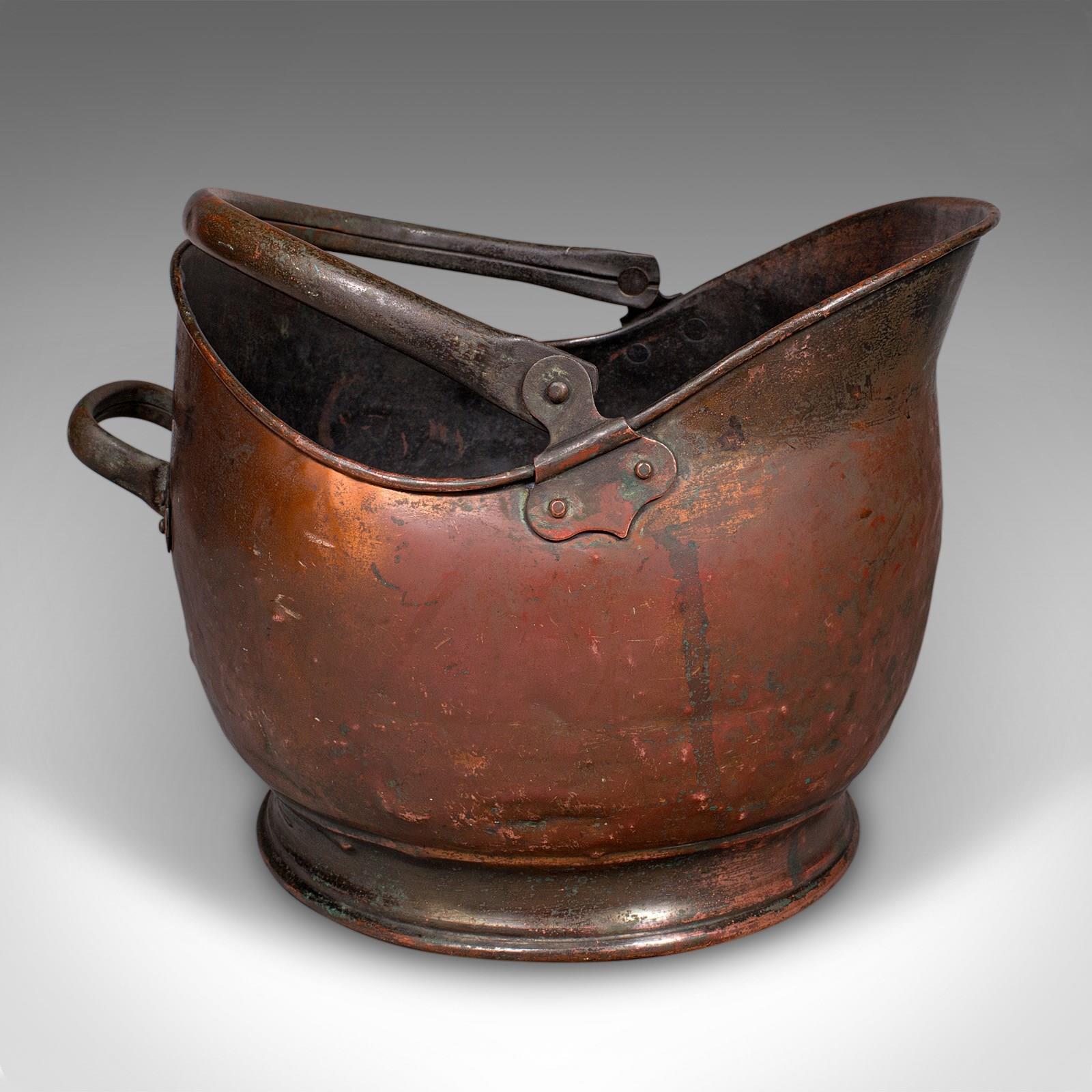 This is a vintage coal scuttle. An English, copper helmet fuel basket in Victorian revival taste, dating to the mid 20th century, circa 1950. A classically styled piece, it brings a touch of Victorian fireplace charm to any home.