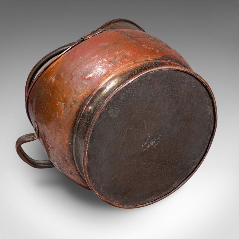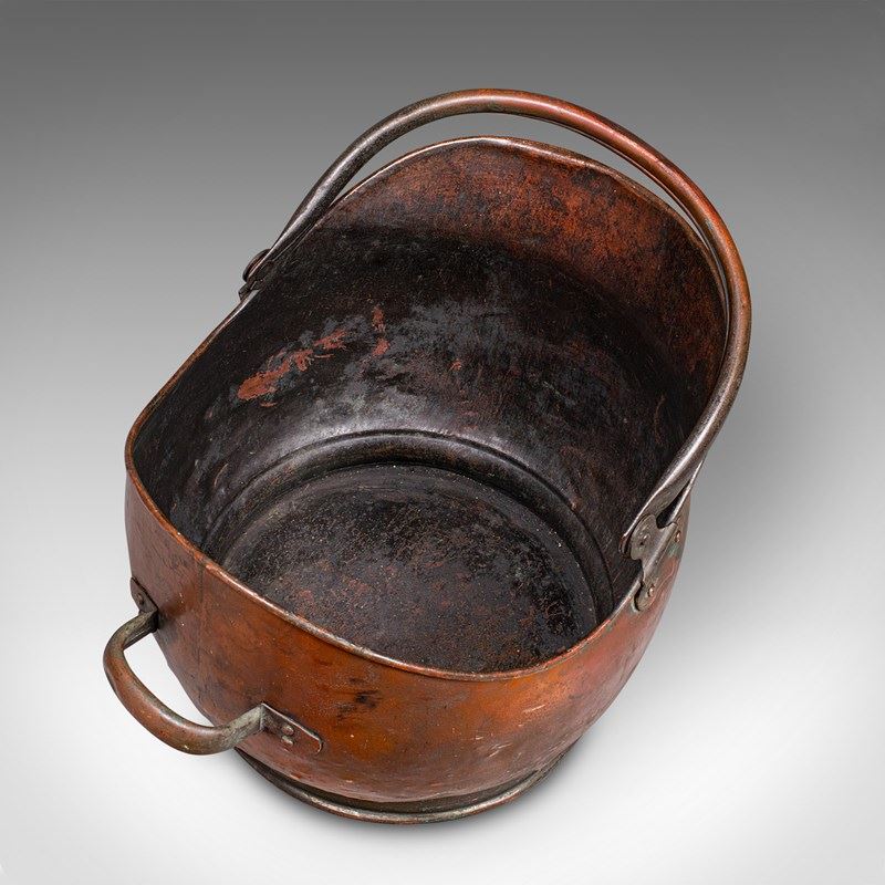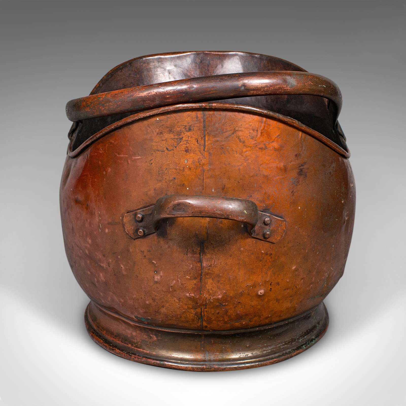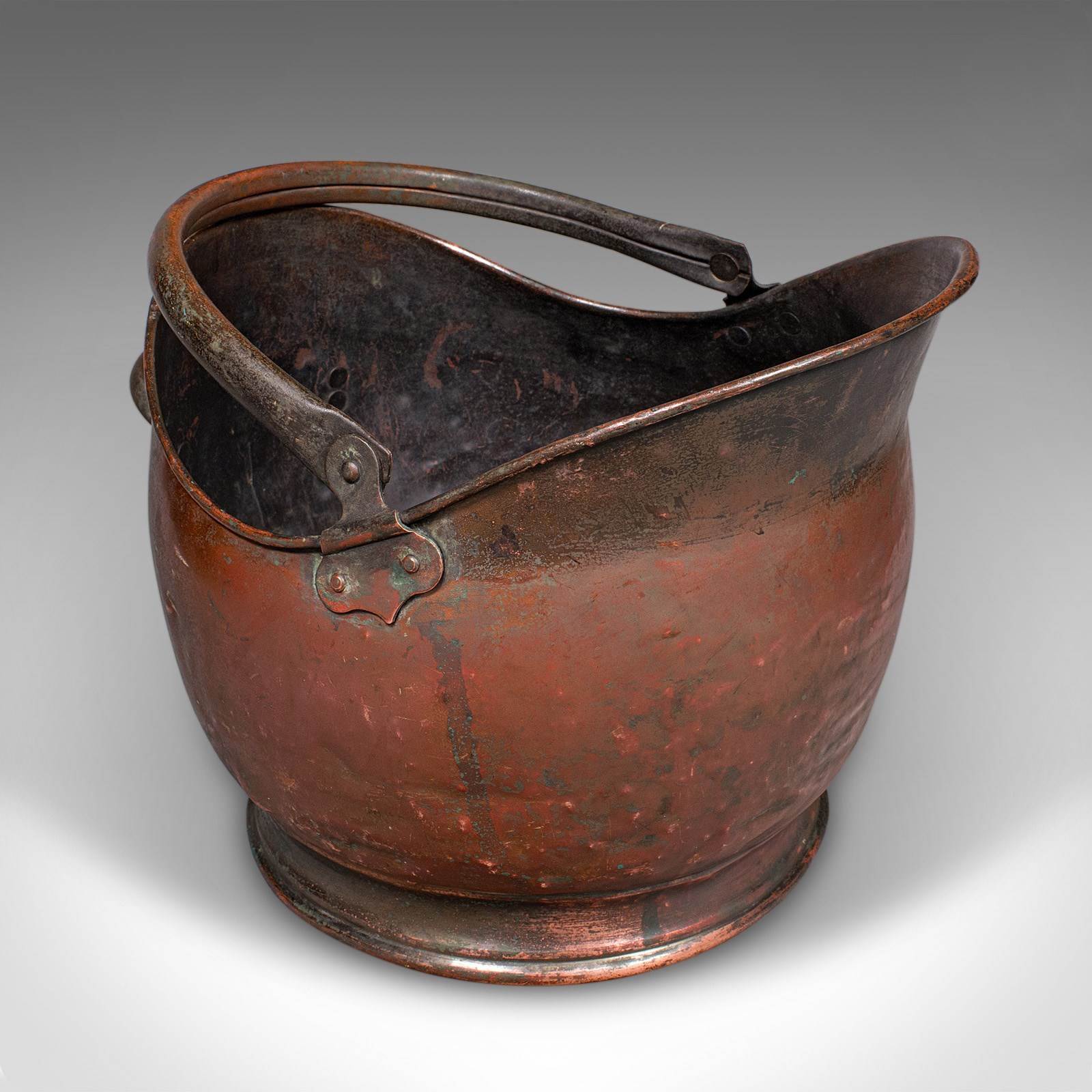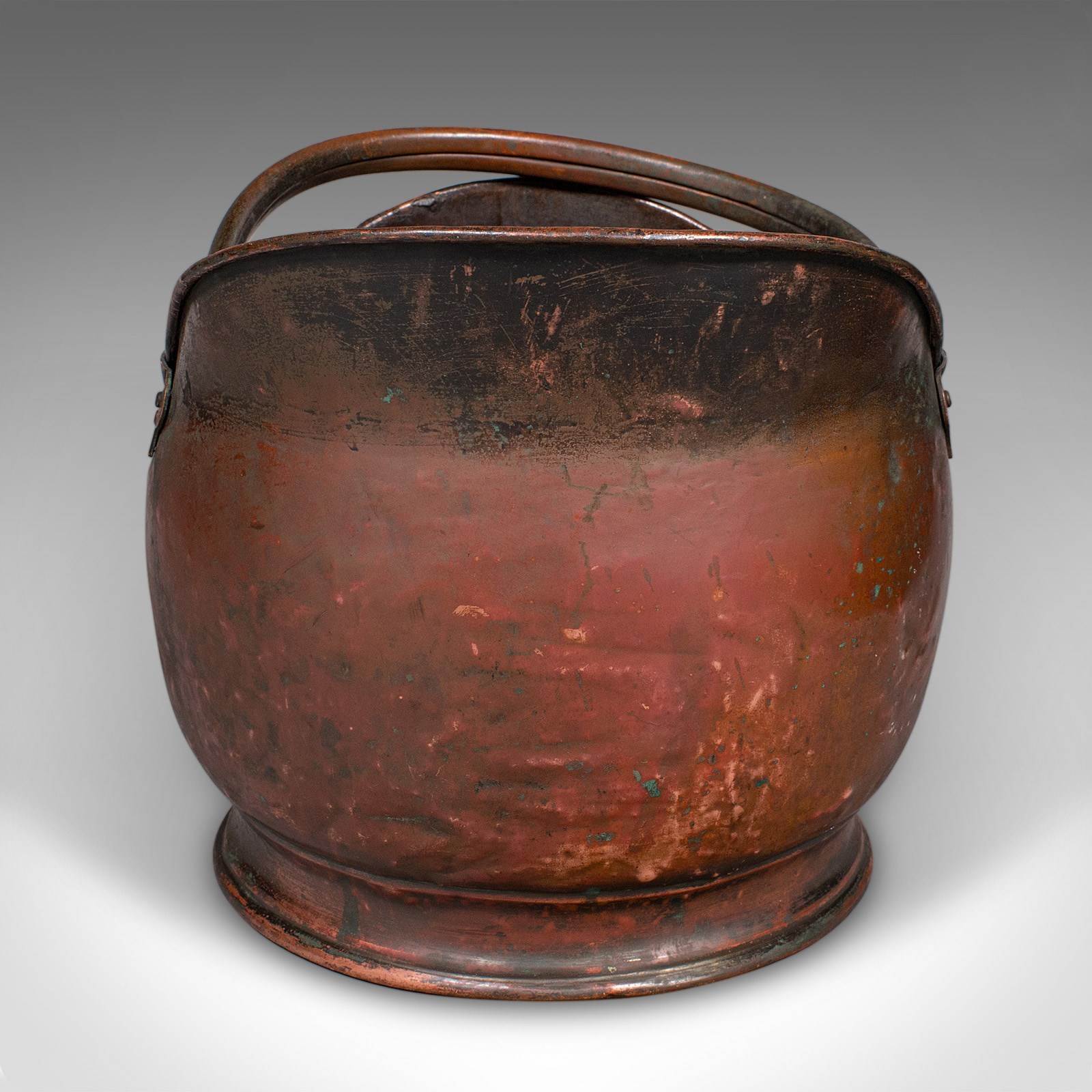 This is a vintage coal scuttle. An English, copper helmet fuel basket in Victorian revival taste, dating to the mid 20th century, circa 1950. A classically styled piece, it brings a touch of Victorian fireplace charm to any home.