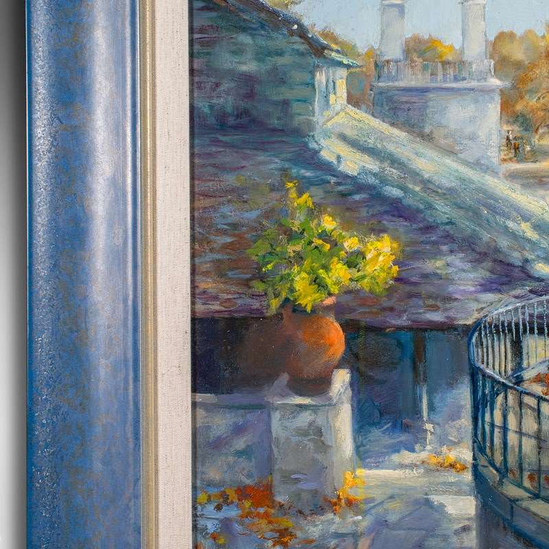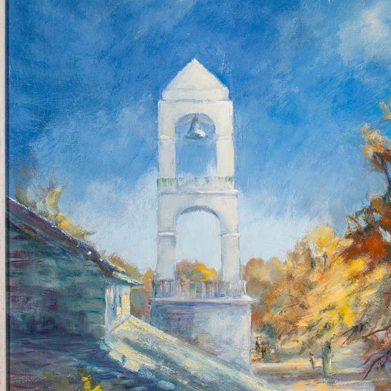 - A rustic Greek courtyard, with the colours of Autumn and a bell tower in the middle distance