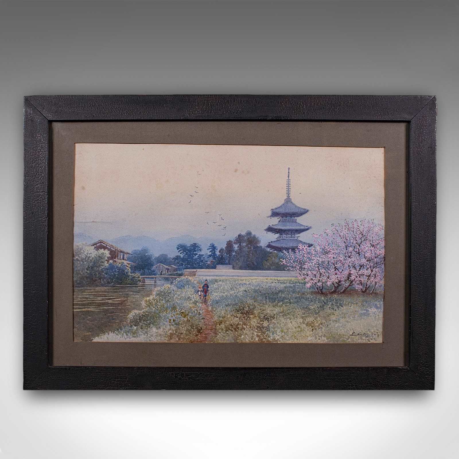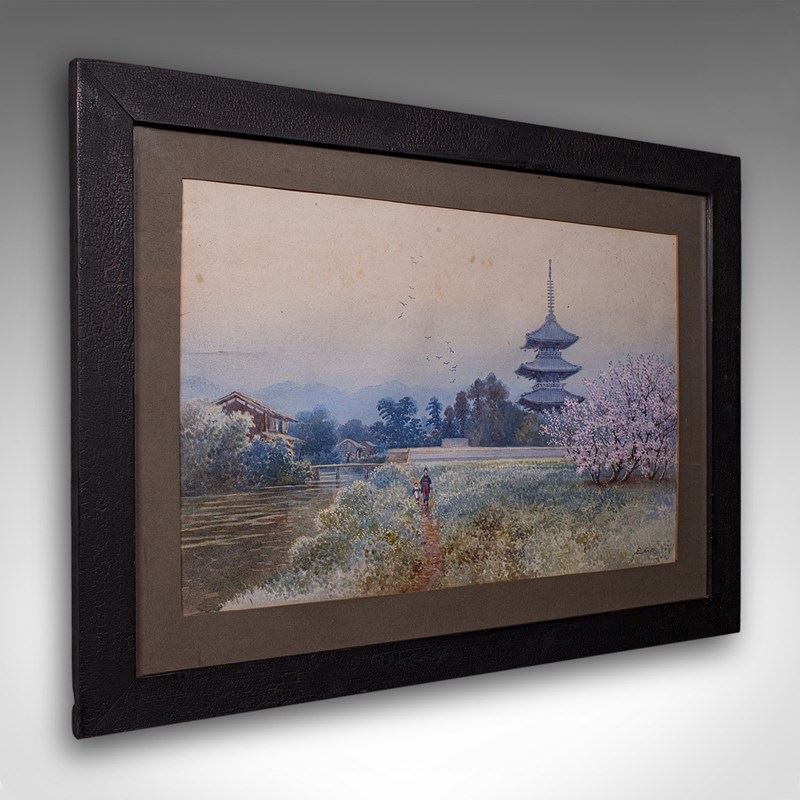 This is a delightful vintage landscape painting, with soft colour and appealing composition to the traditional Japanese scene. Delivered ready to display.