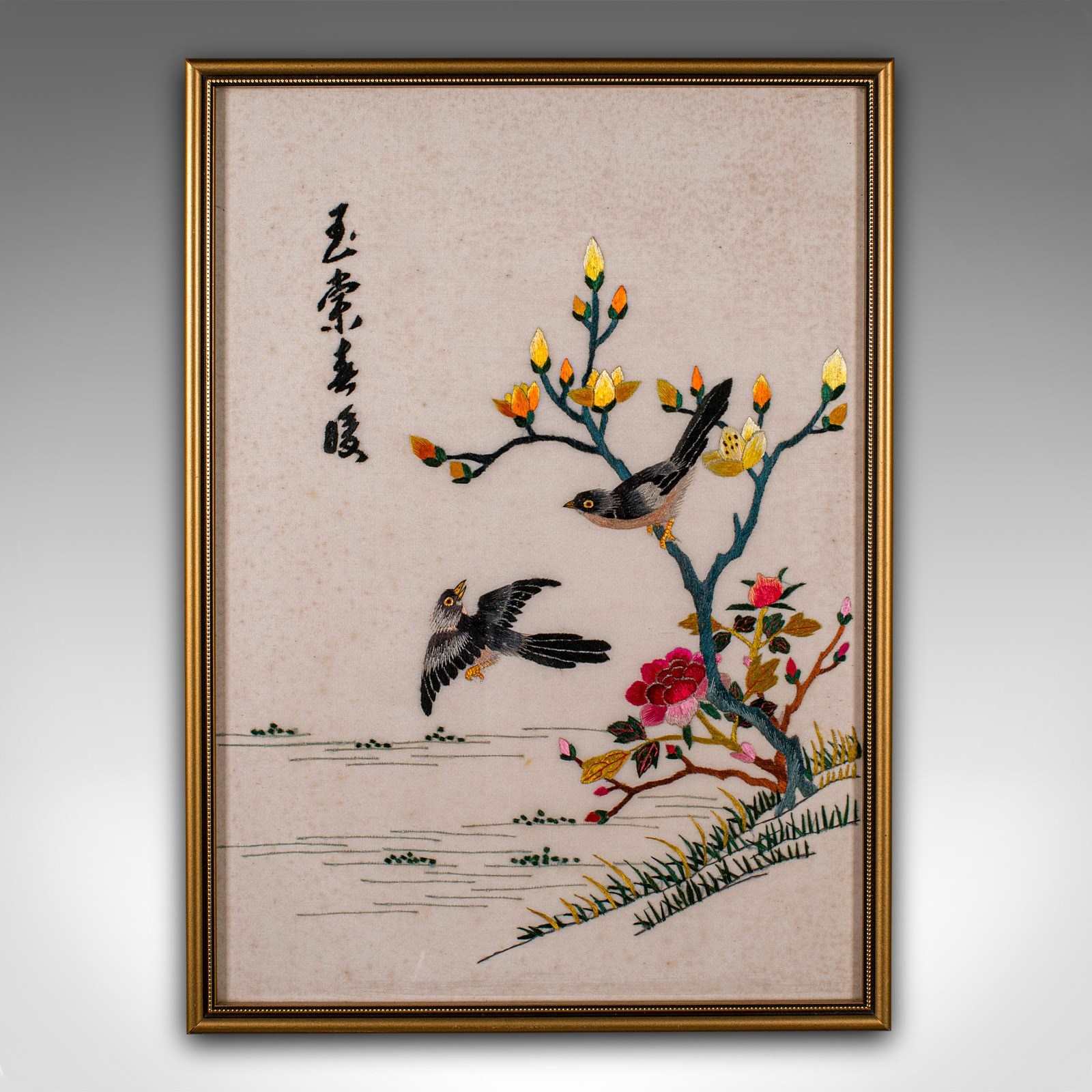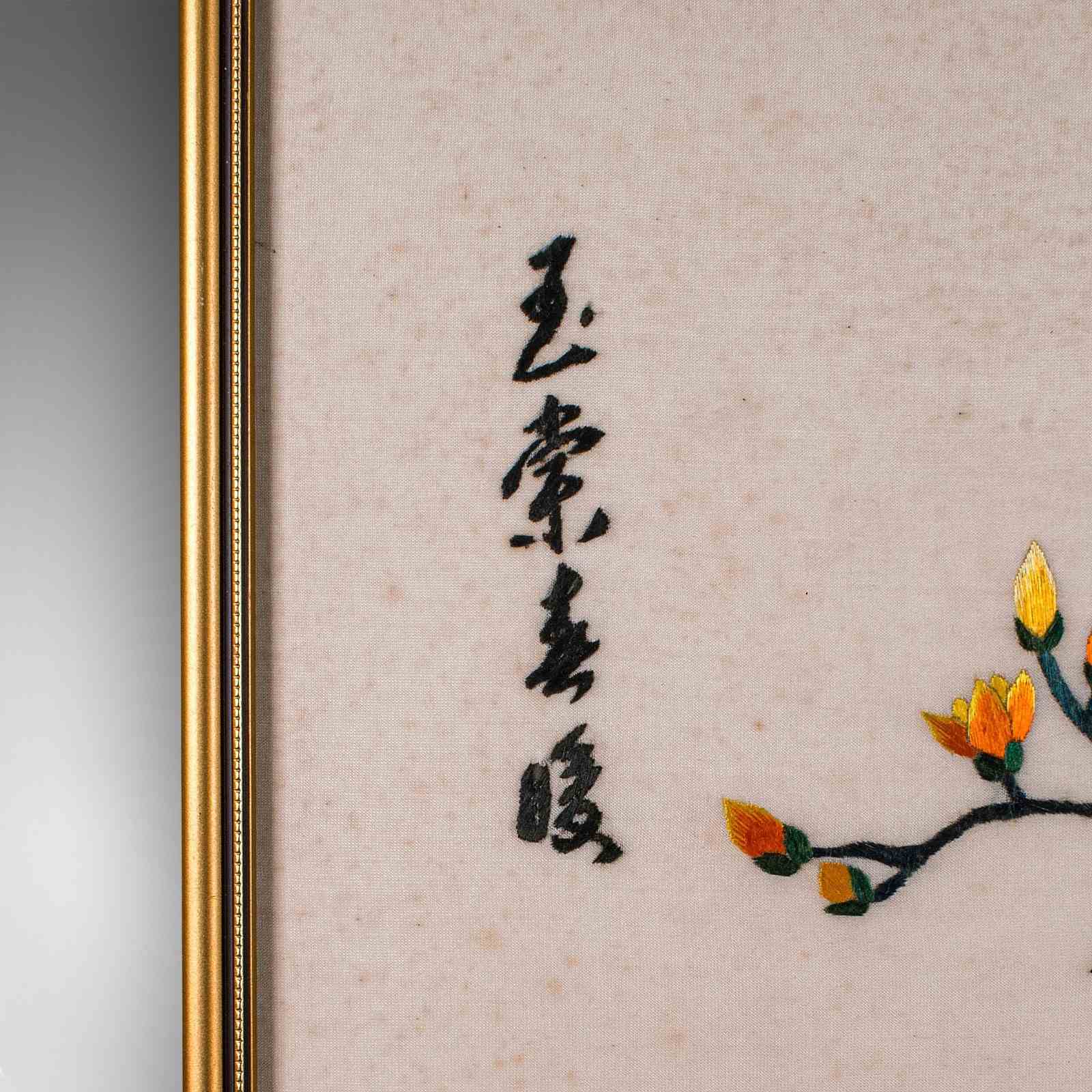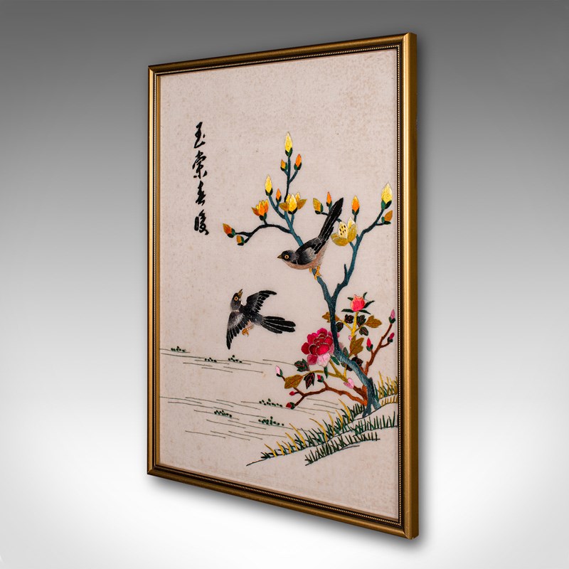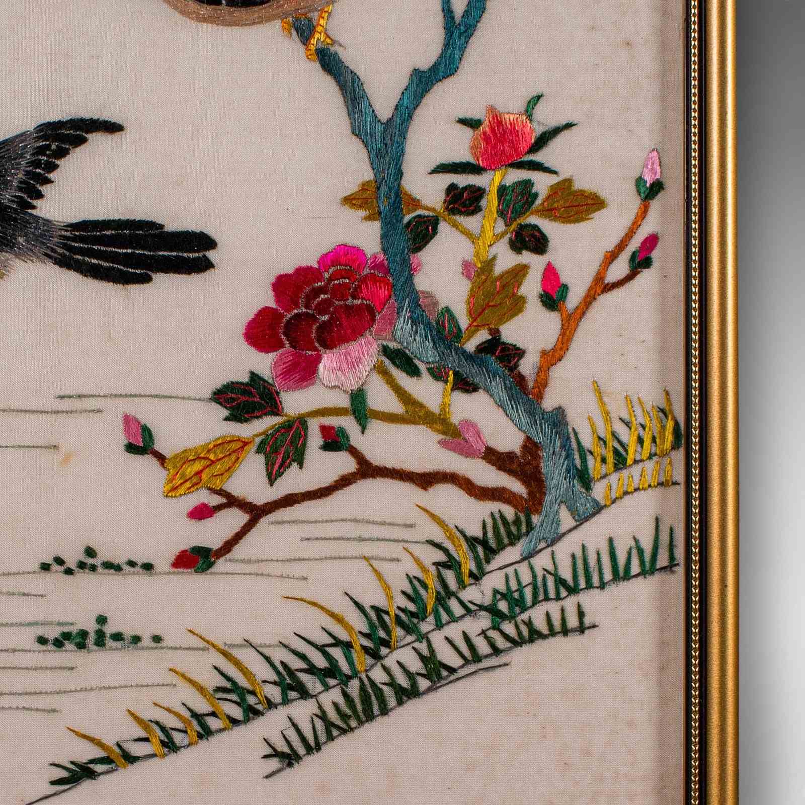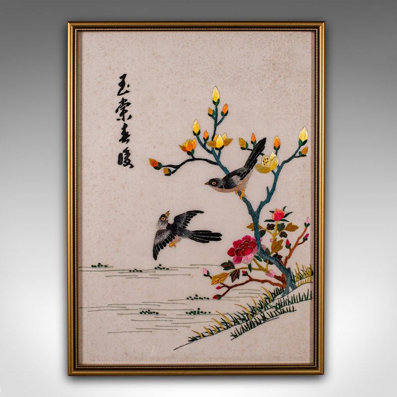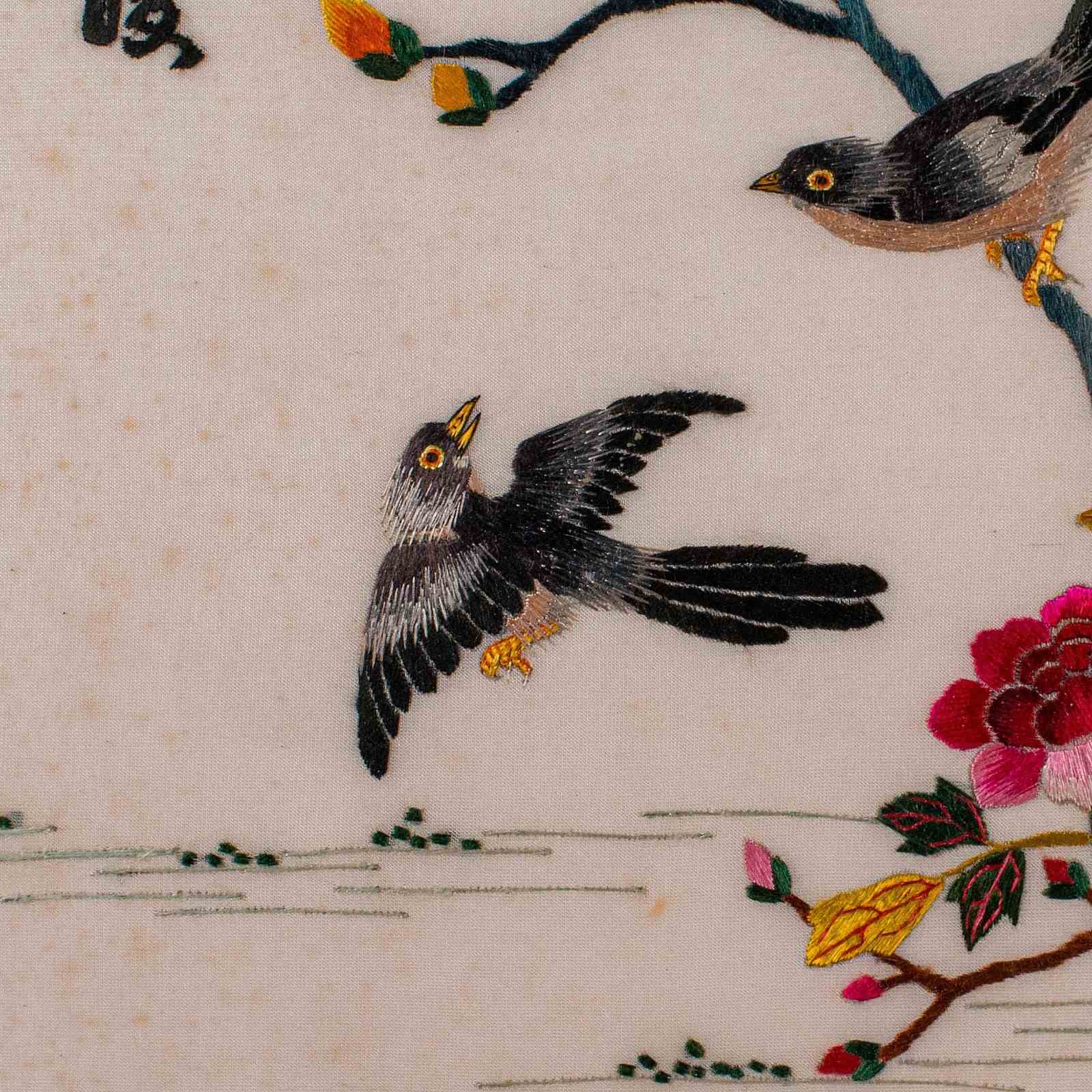 This is a vintage display panel. A Korean, framed silk cotton embroidery scene, dating to the Art Deco period, circa 1930.