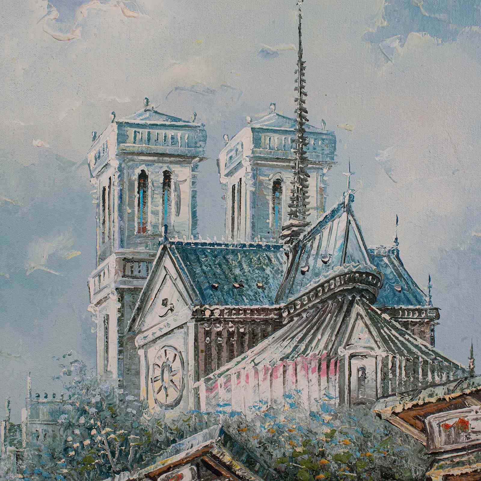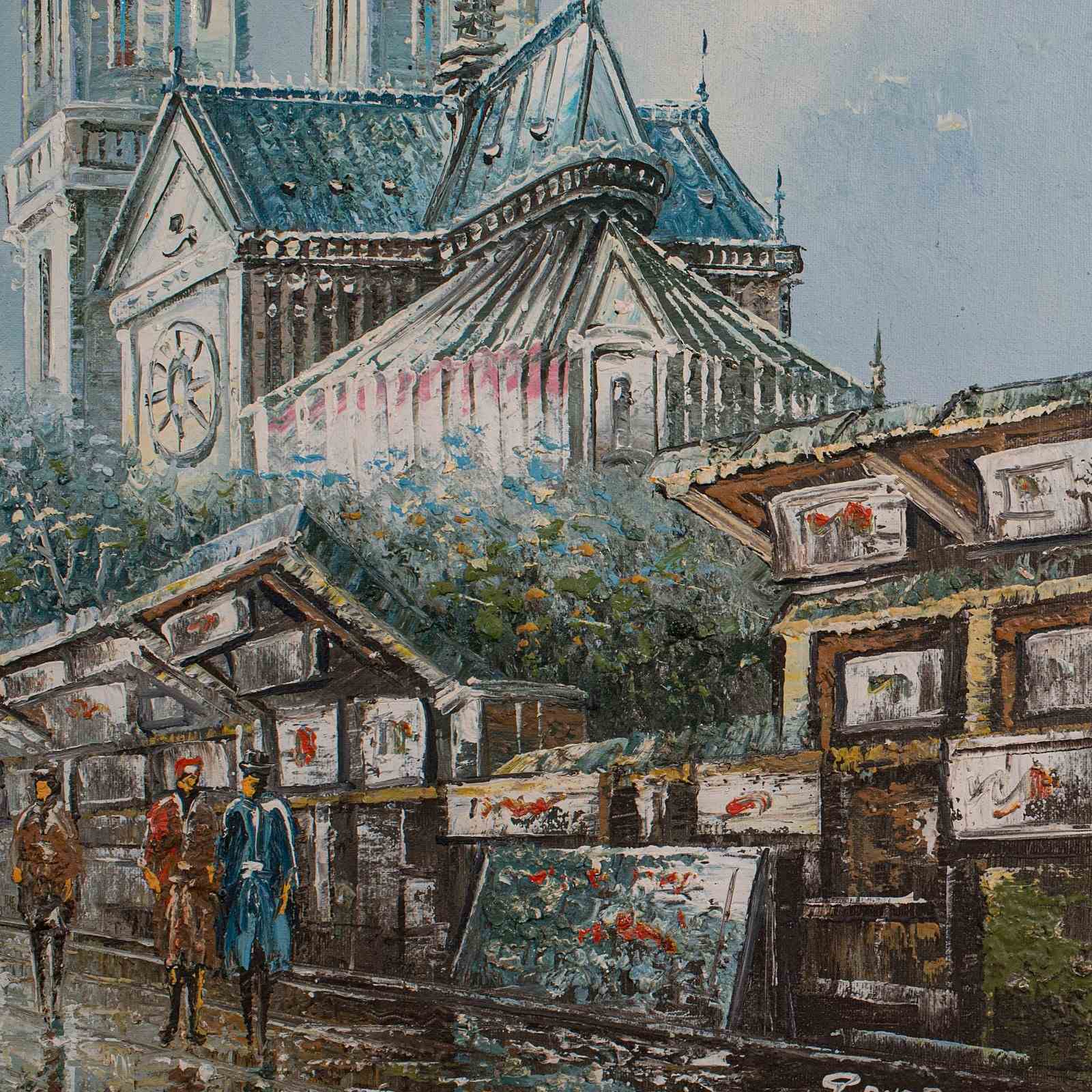 This is a vintage Parisian painting. A French, original oil on canvas picture of Notre Dame, dating to the late 20th century, circa 1980.