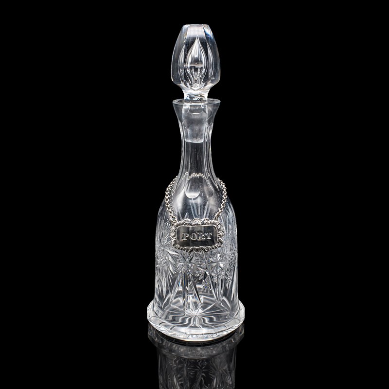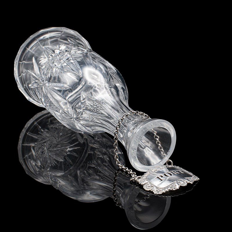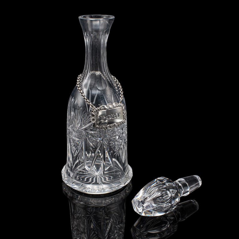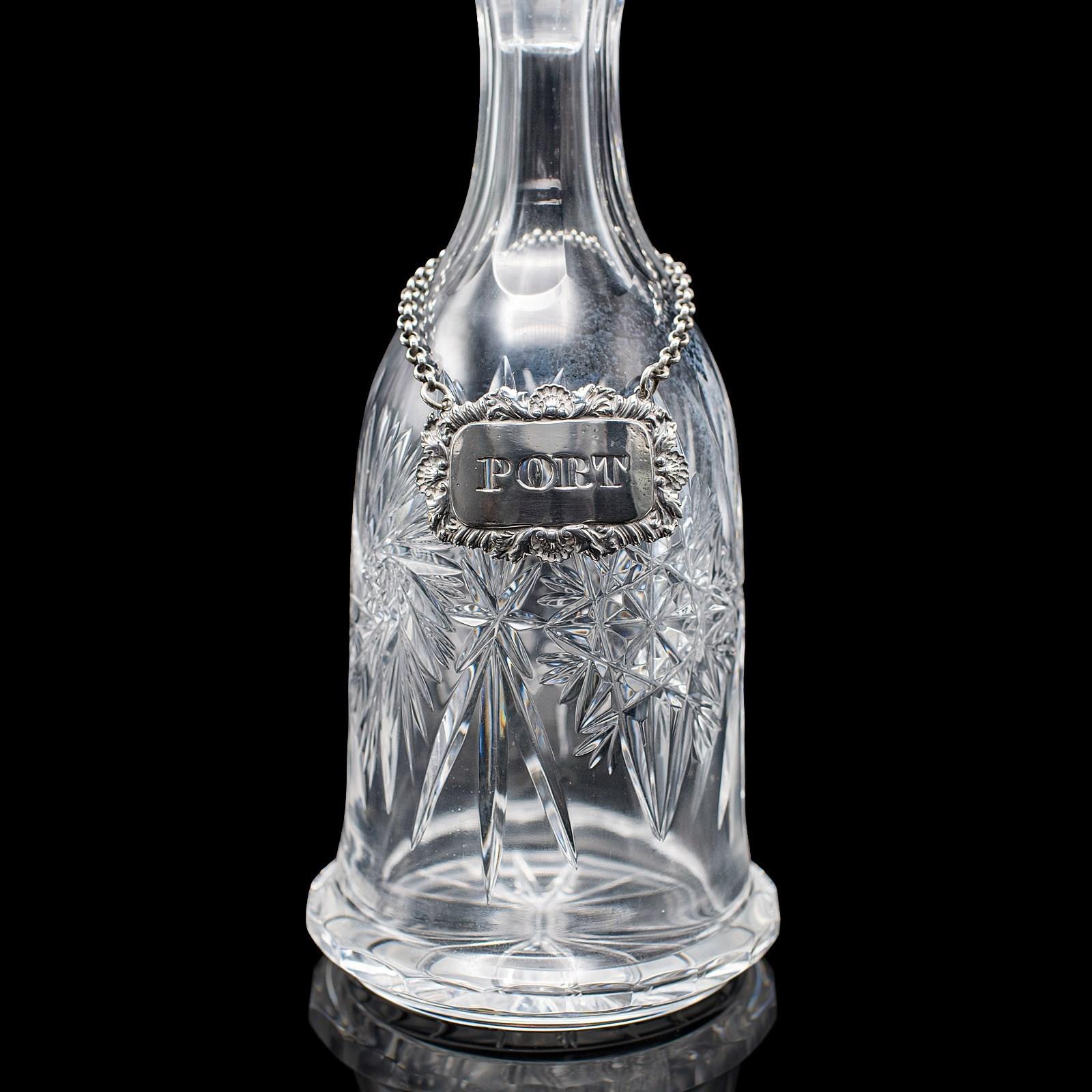This is a vintage port decanter. An English, cut glass and silver spirit bottle, dating to the mid 20th century, circa 1950. A refined and elegant decanter, enhanced with an antique silver label and appealing decorative detail.