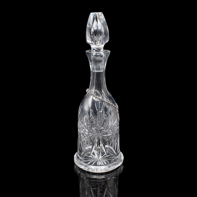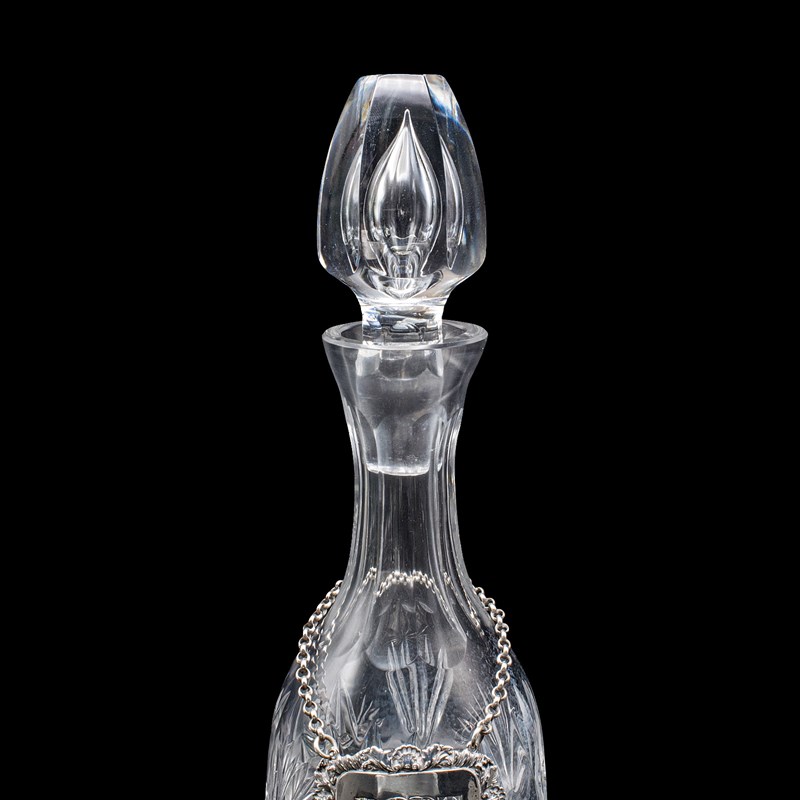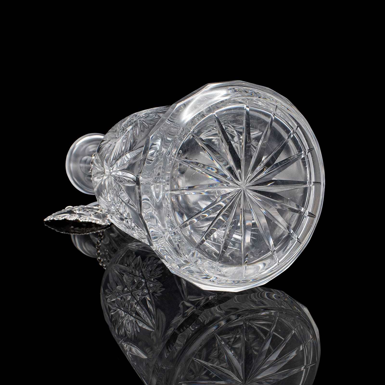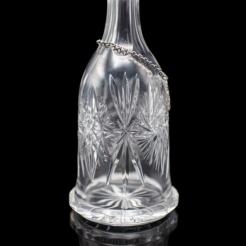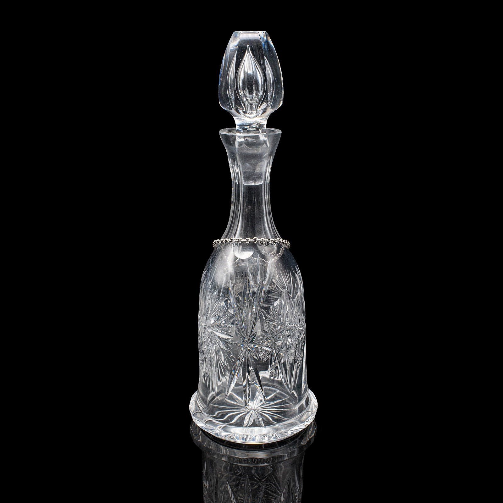 This is a vintage port decanter. An English, cut glass and silver spirit bottle, dating to the mid 20th century, circa 1950. A refined and elegant decanter, enhanced with an antique silver label and appealing decorative detail.