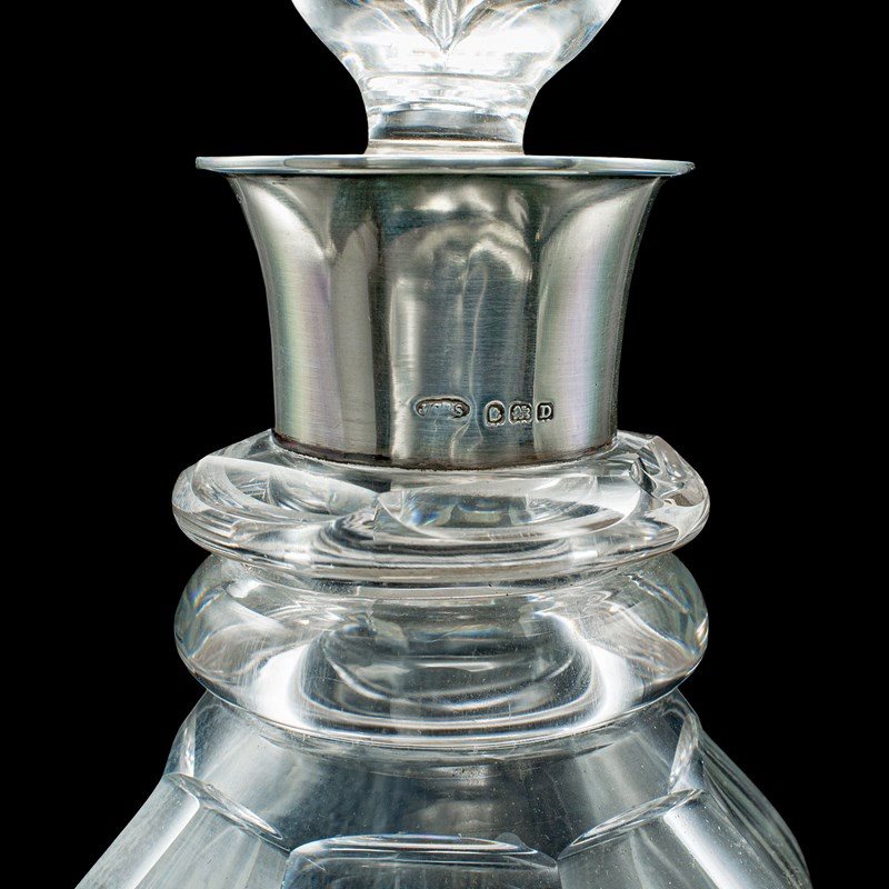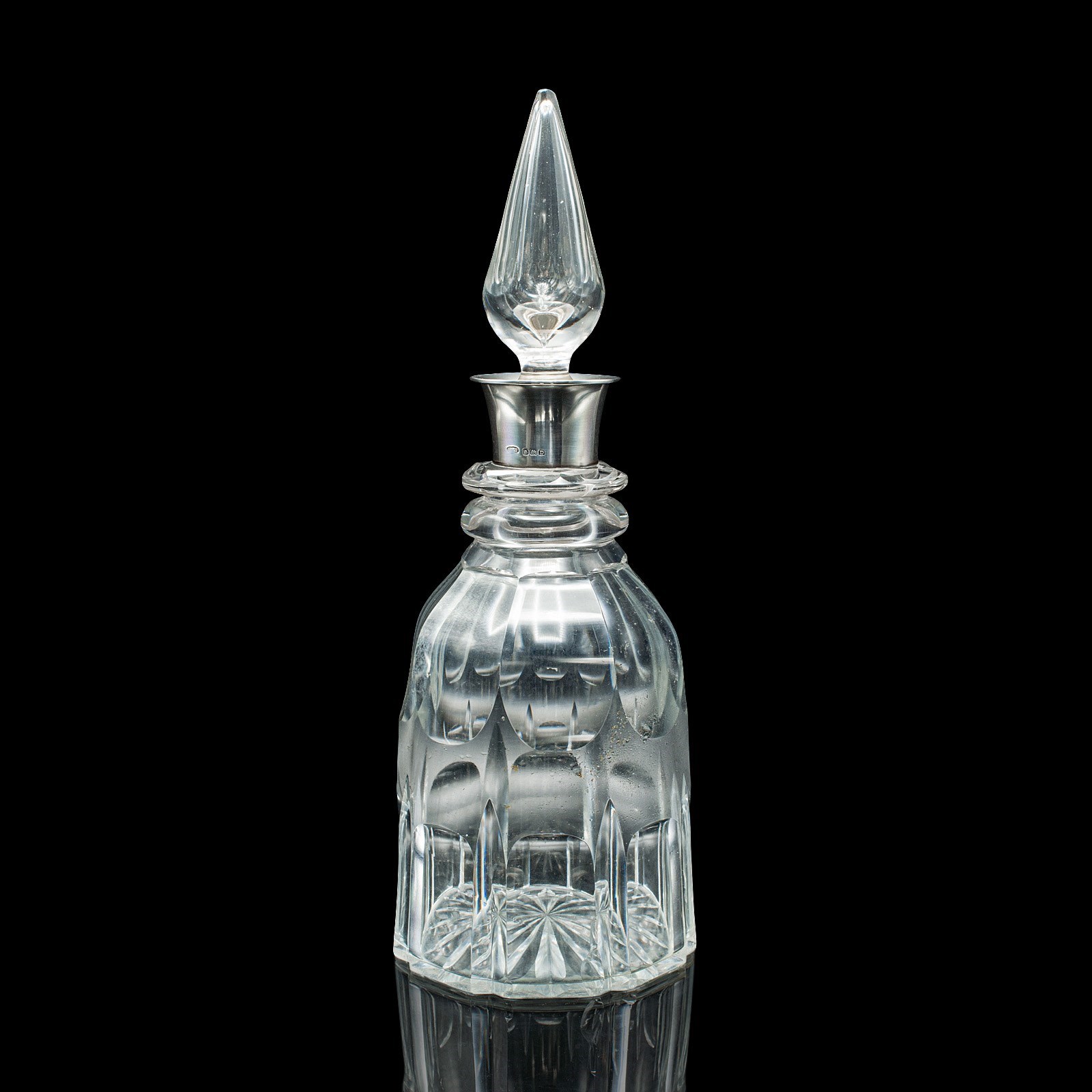 This is a vintage port decanter. An English, cut glass sherry or spirit vessel with a hallmarked silver collar, dating to the early 20th century, circa 1928. An appealing decanter with elegant form, subtle age and fine decorative detail.
