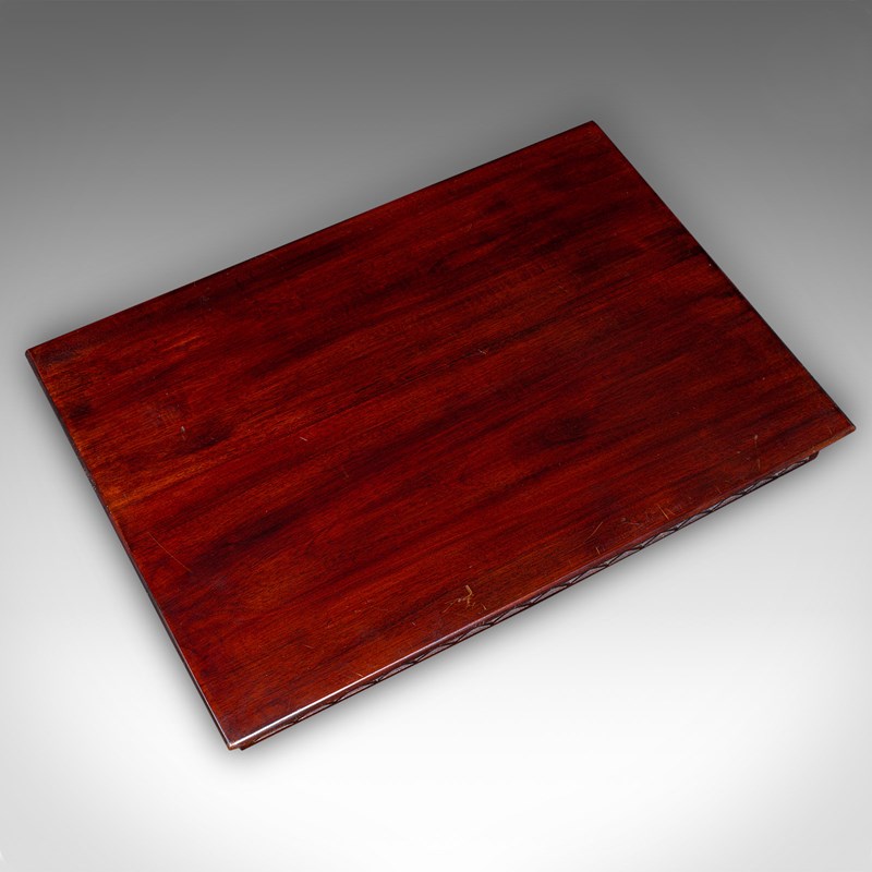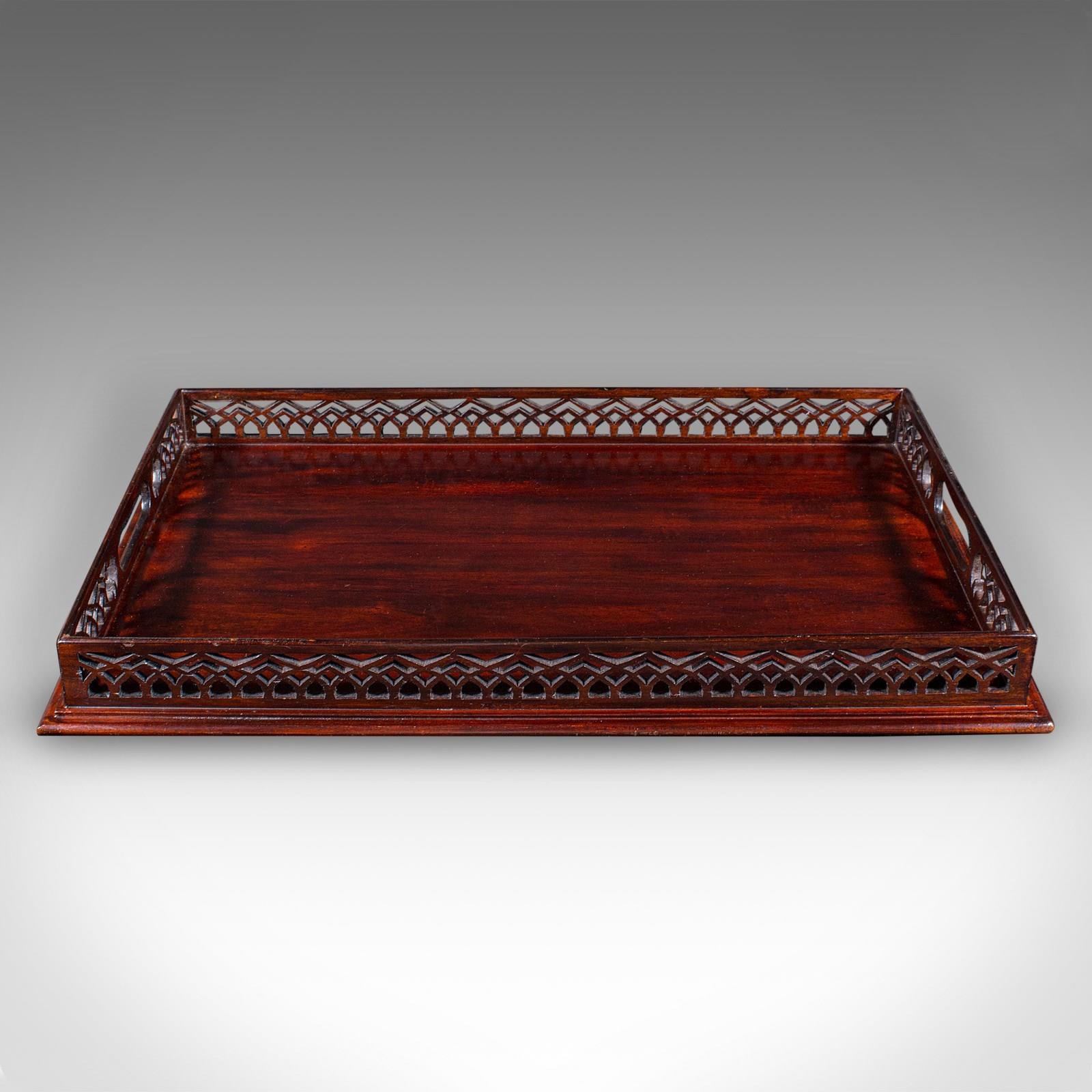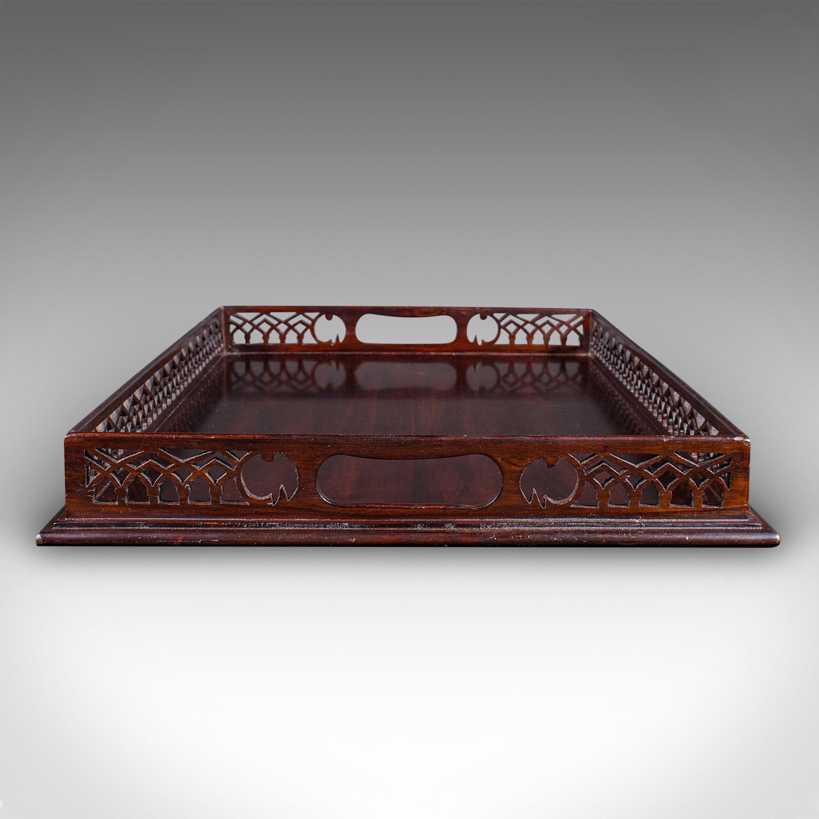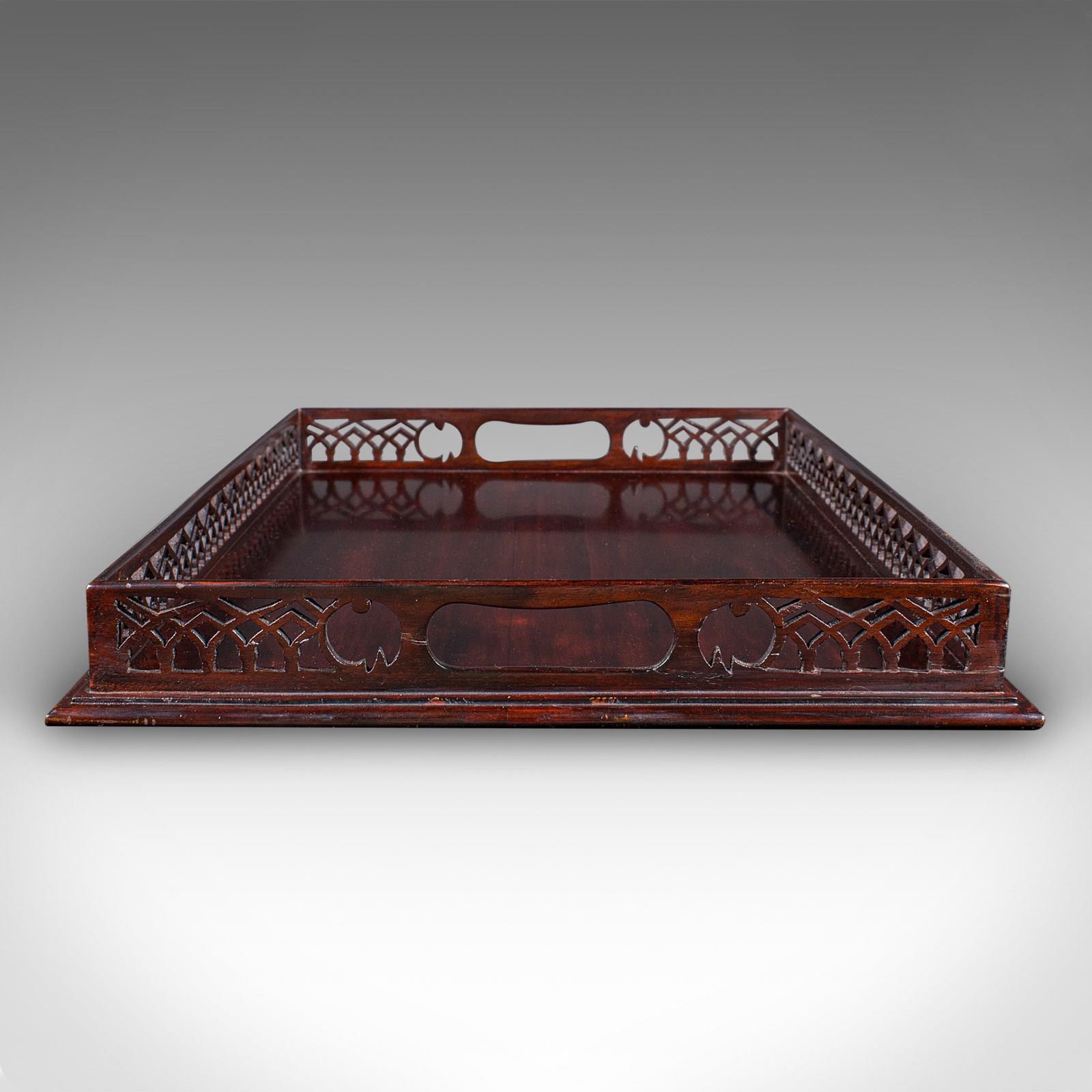 This is a vintage presentation serving tray. An English, mahogany afternoon tea or aperitif server in Regency revival taste, dating to the late 20th century, circa 1980. Handsome in proportion with elegant craftsmanship, ideal for entertaining with timeless style.