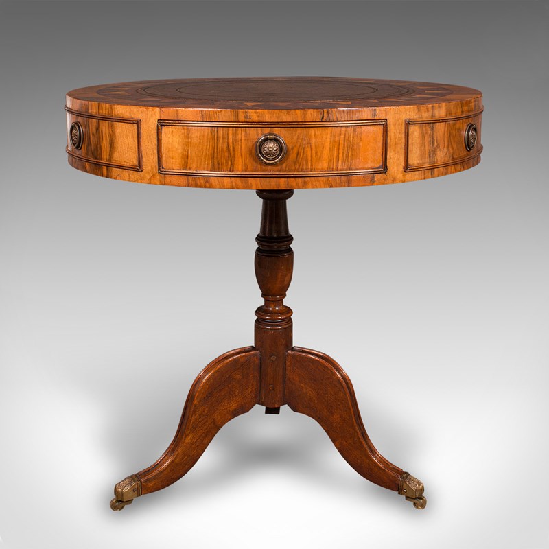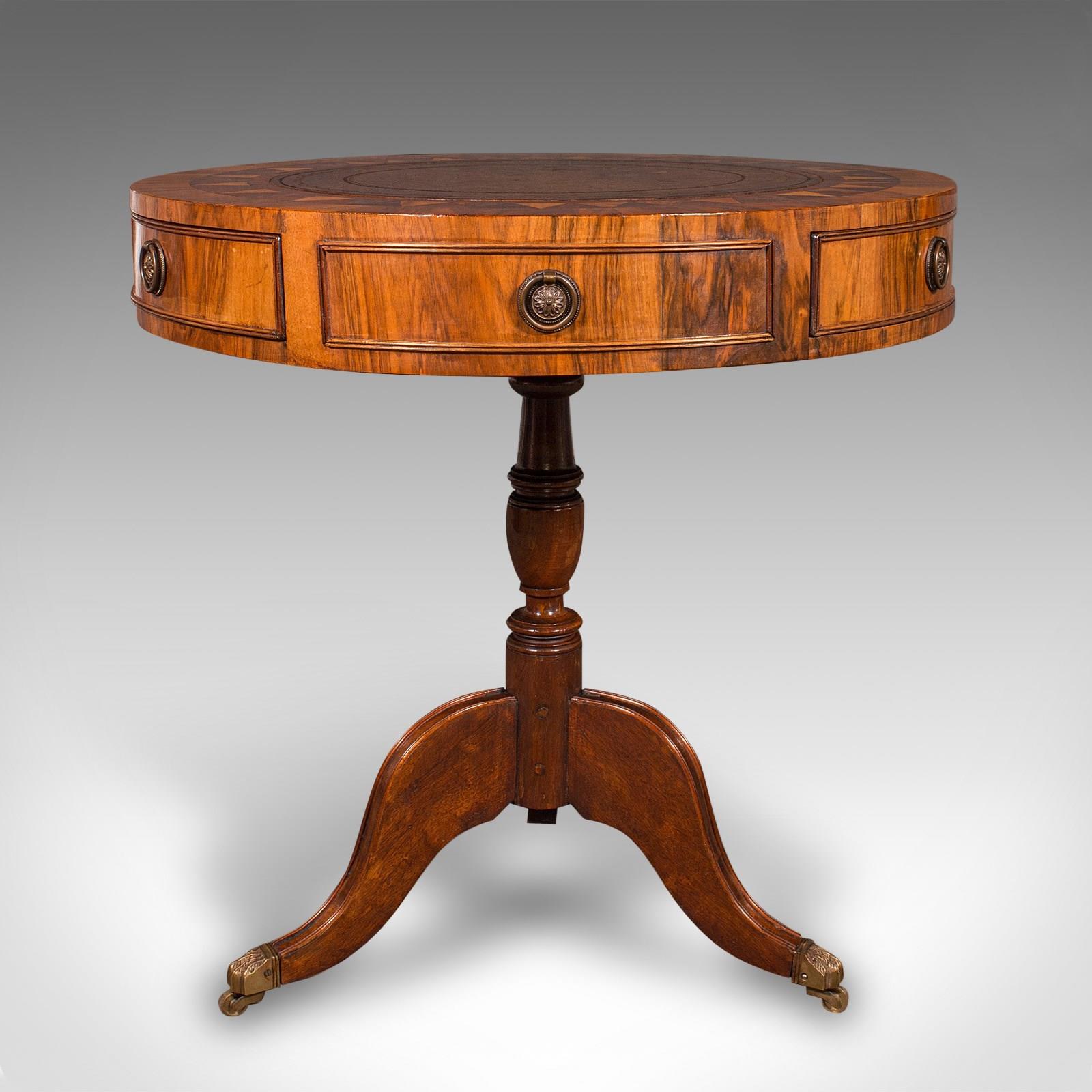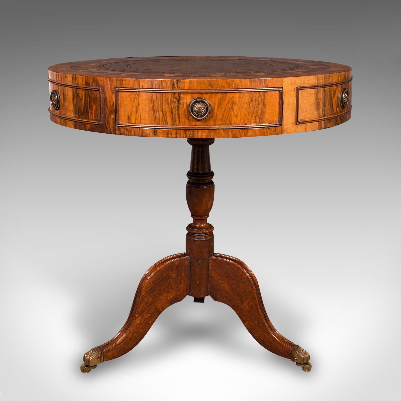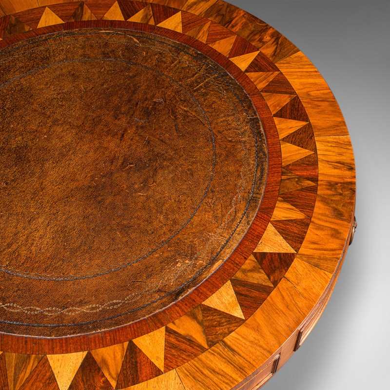 Vintage Rotary Centre Table, English, Walnut, Leather, Games, Regency Revival