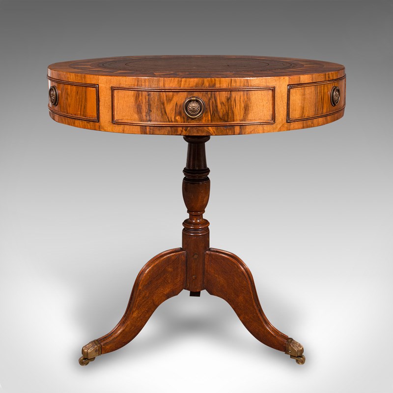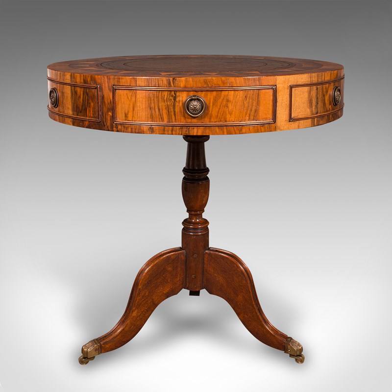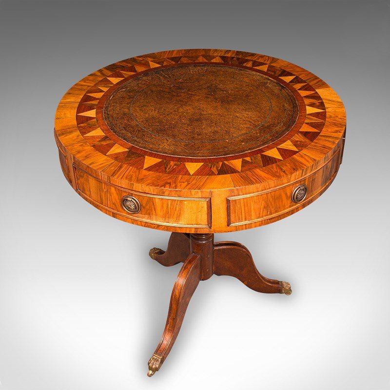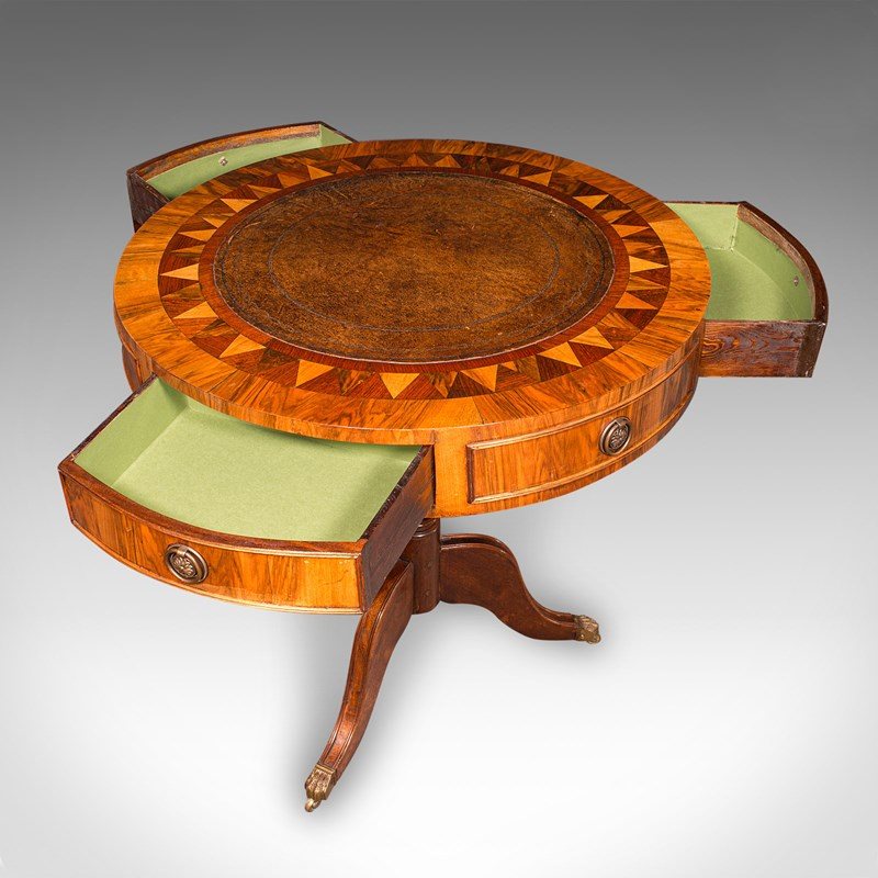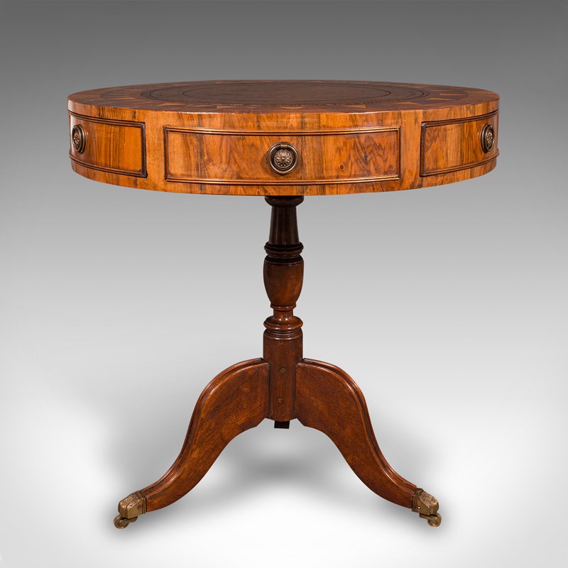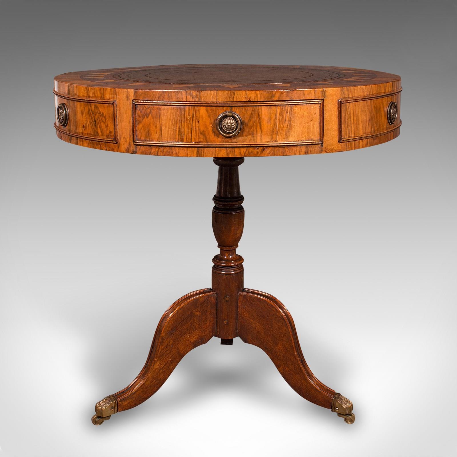Vintage Rotary Centre Table, English, Walnut, Leather, Games, Regency Revival