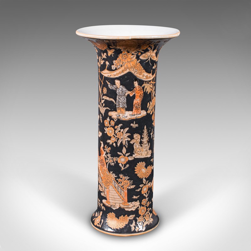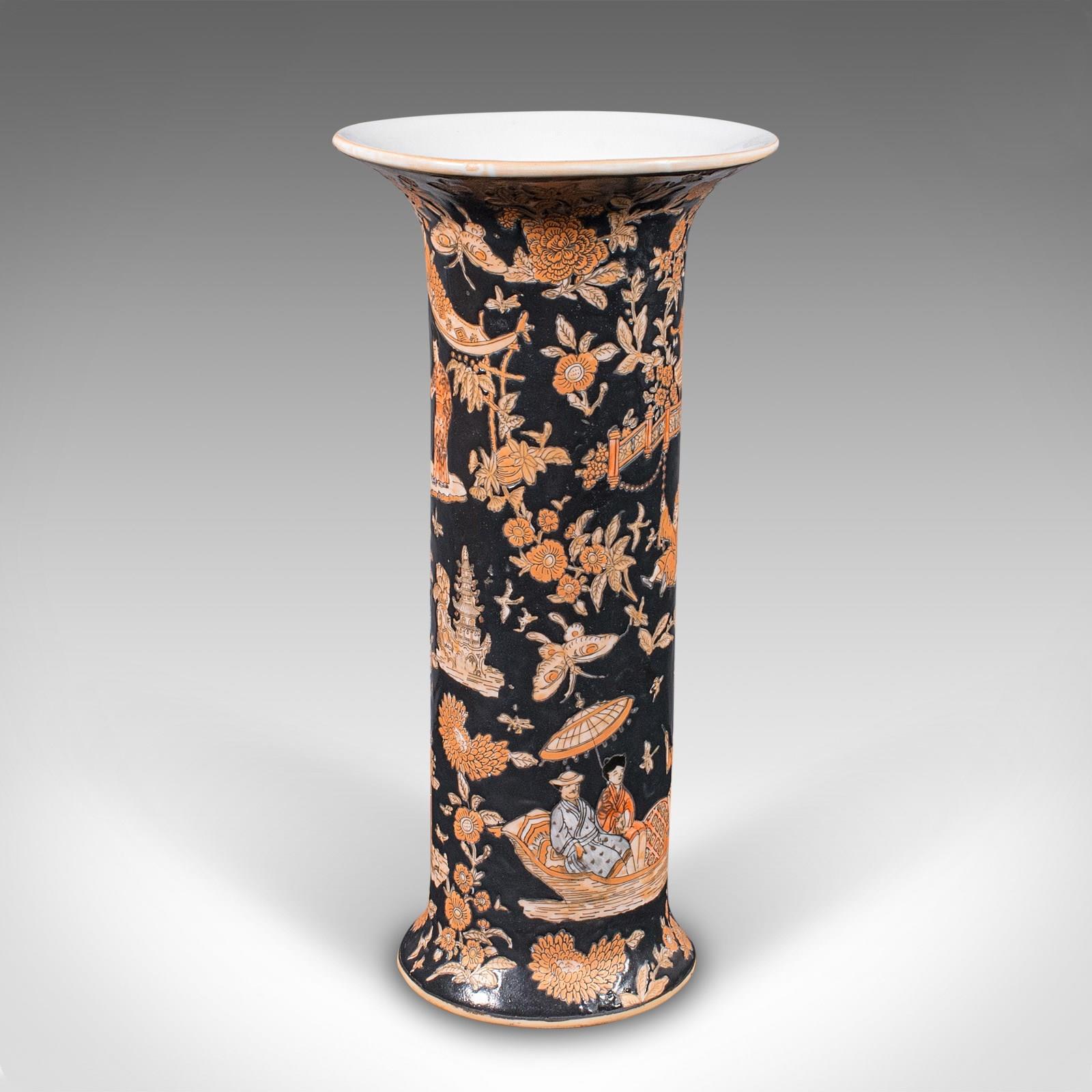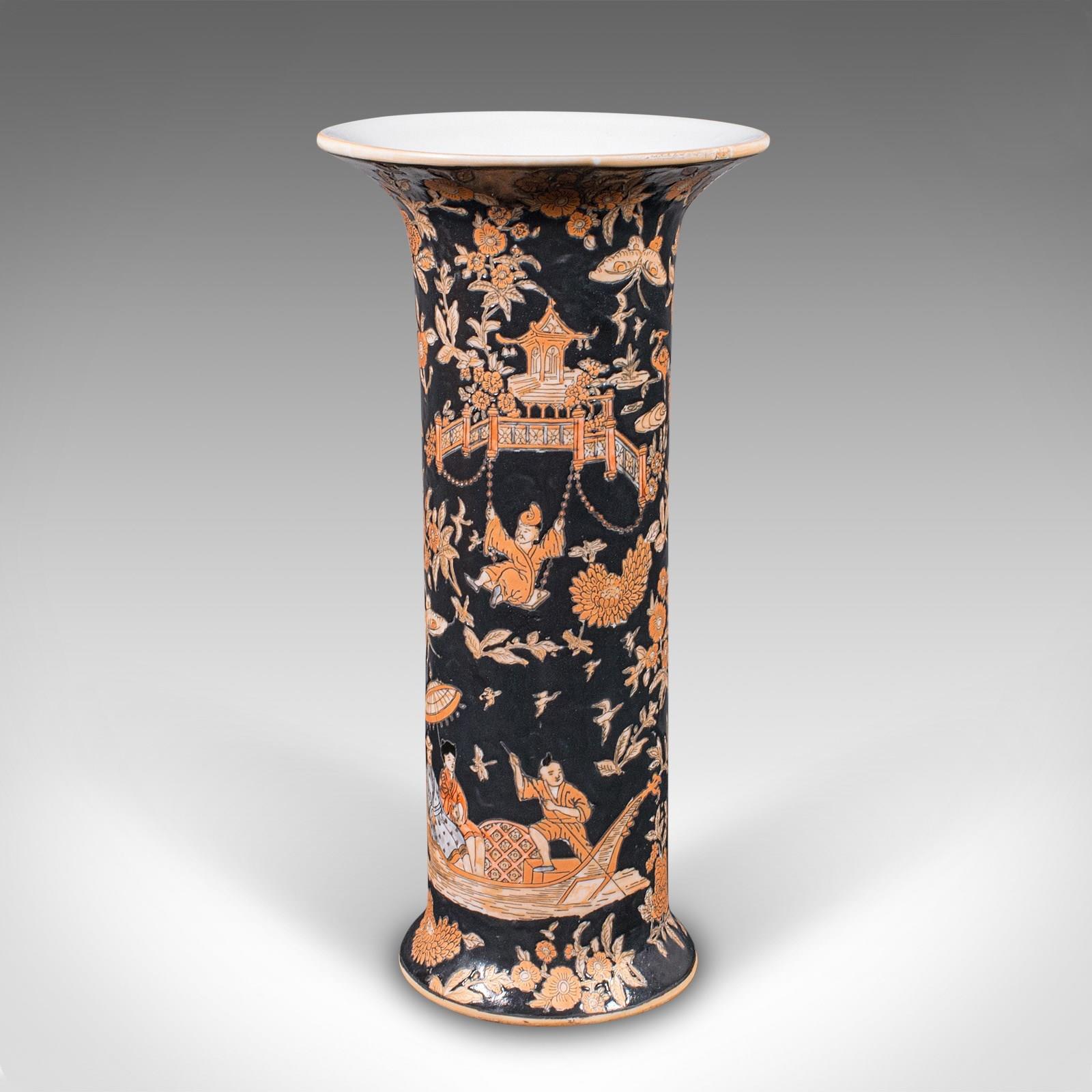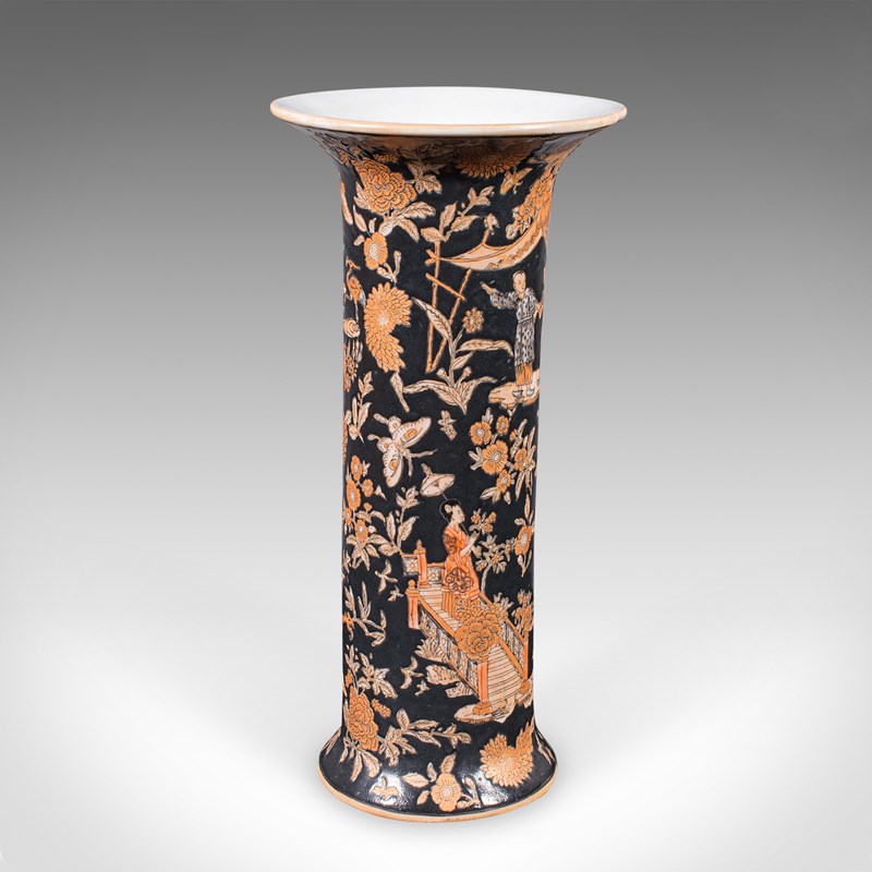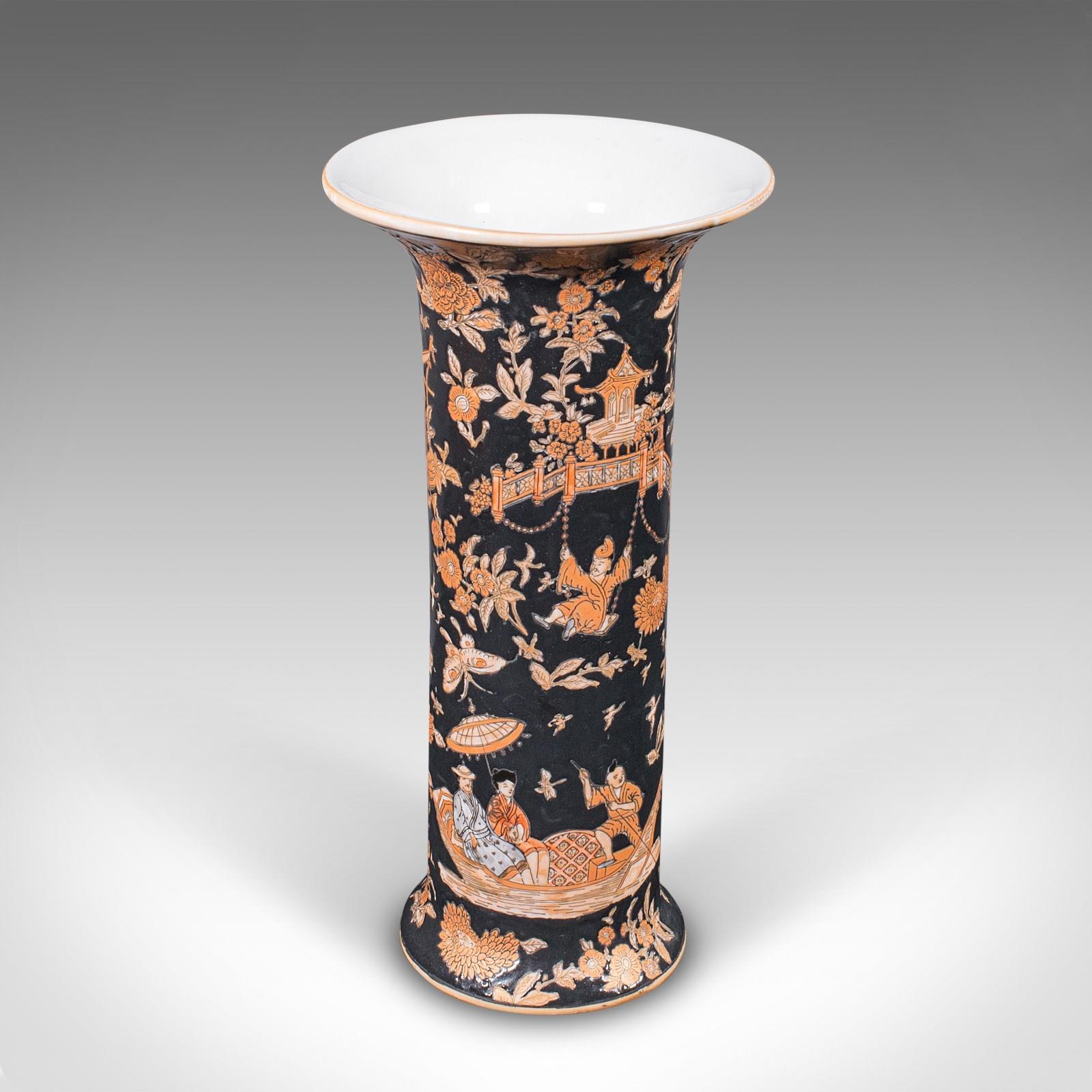 This is an attractive vintage trumpet vase, with a distinctive slimline form and eye-catching Chinese decor. Delivered ready to display.