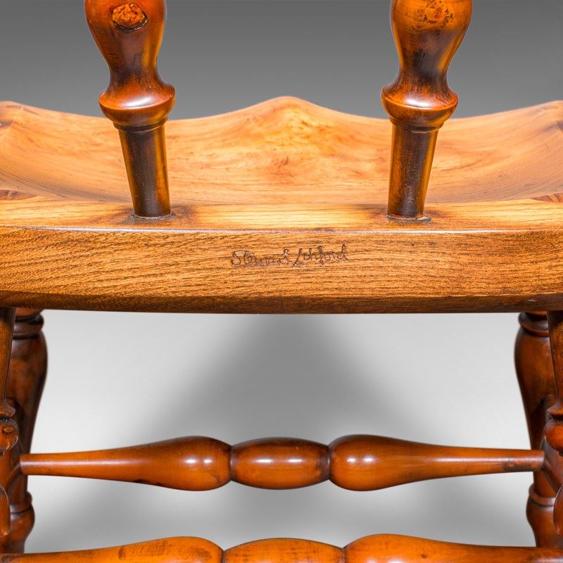 This is a fine vintage smoker’s bow chair. An English, ash captain's elbow seat, dating to the late 20th century, circa 1980. A high-quality Victorian revival piece by renowned craftsman Stewart Linford, it presents superb traditional form, excellent comfort, and rich natural colour.