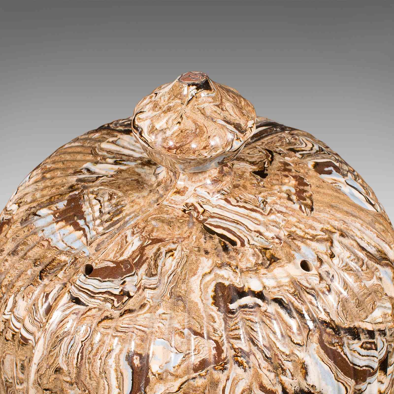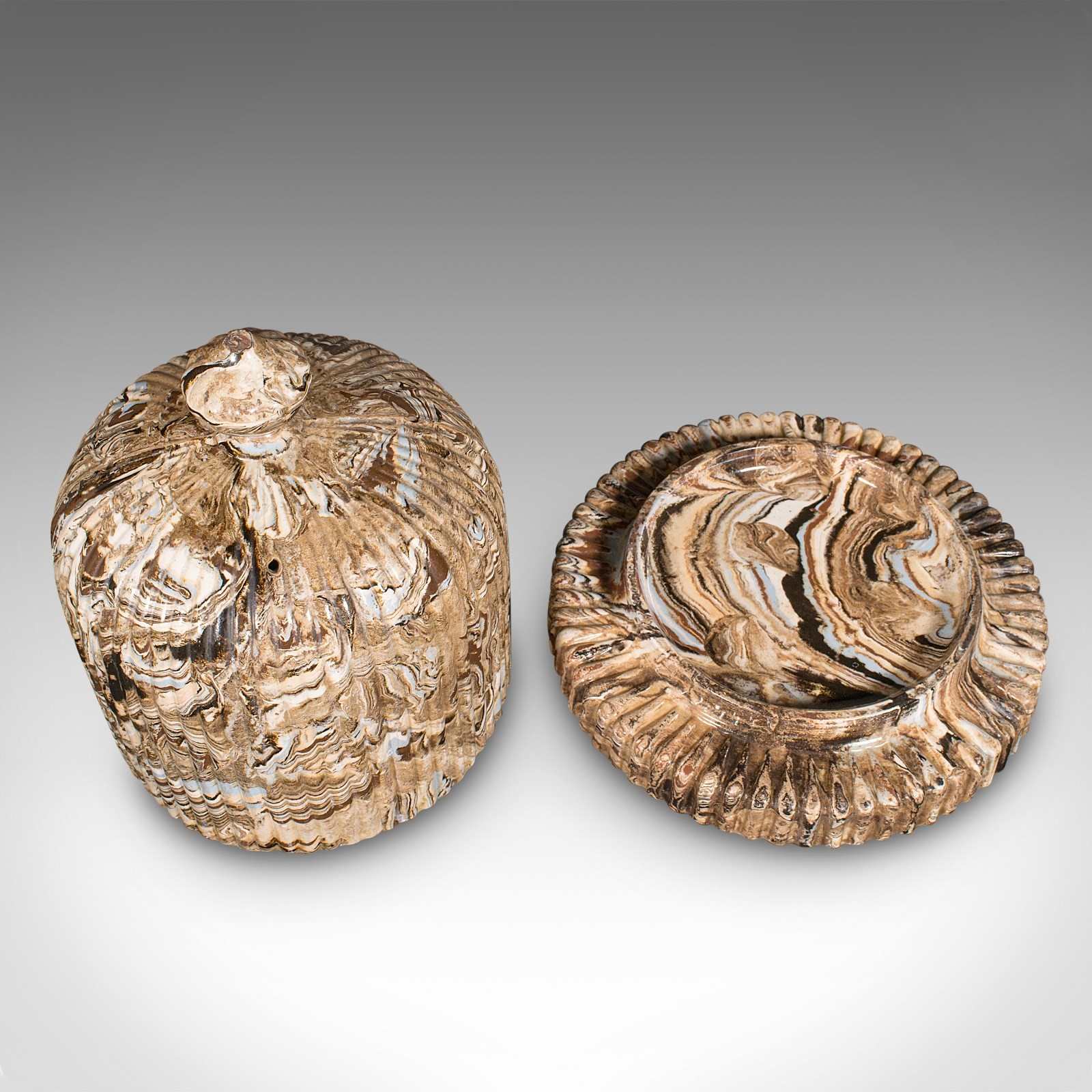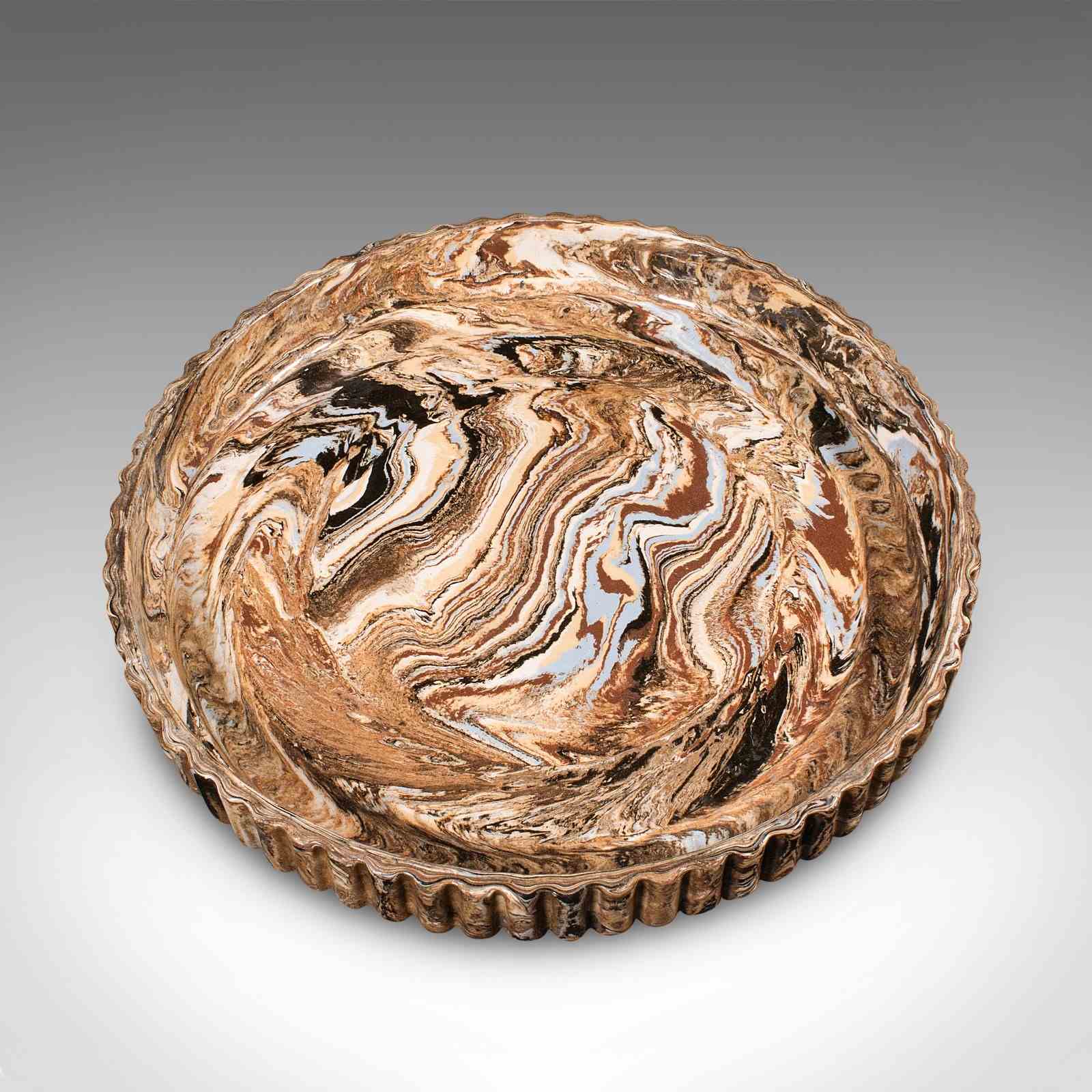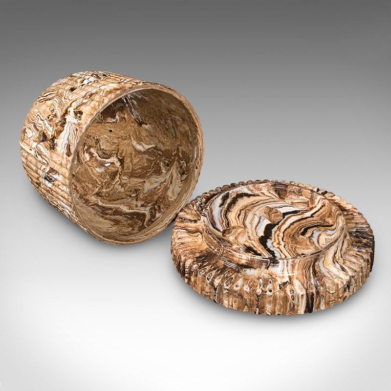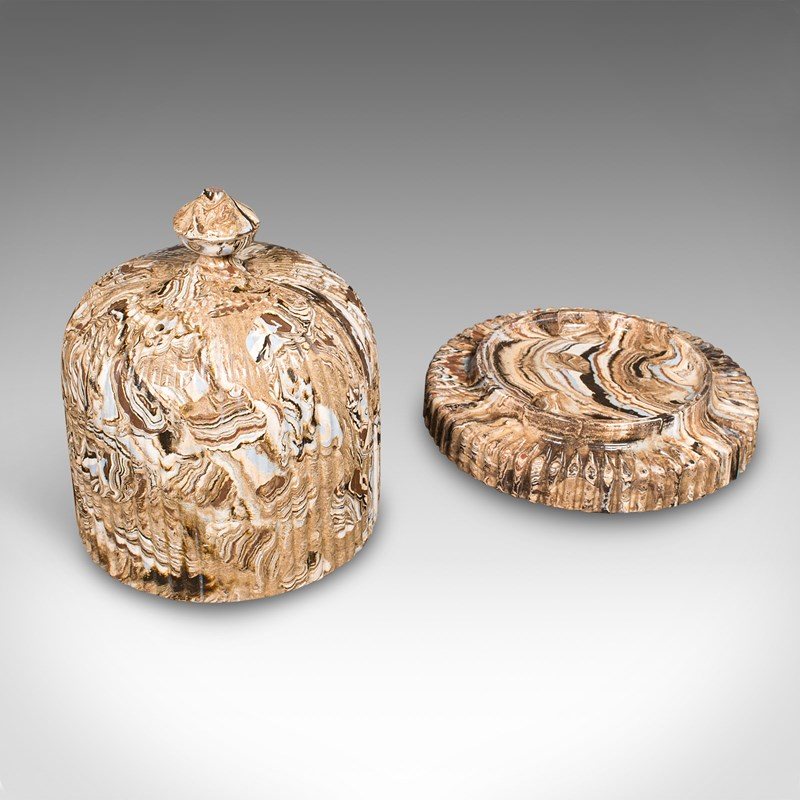 This is a superb mid 20th century Georgian Revival Stilton cheese keeper, exquisitely crafted with a marbled ceramic finish in the manner of Copeland's Agateware. This vintage truckle dome, dating to circa 1950, embodies the refined artistry of traditional English tableware.