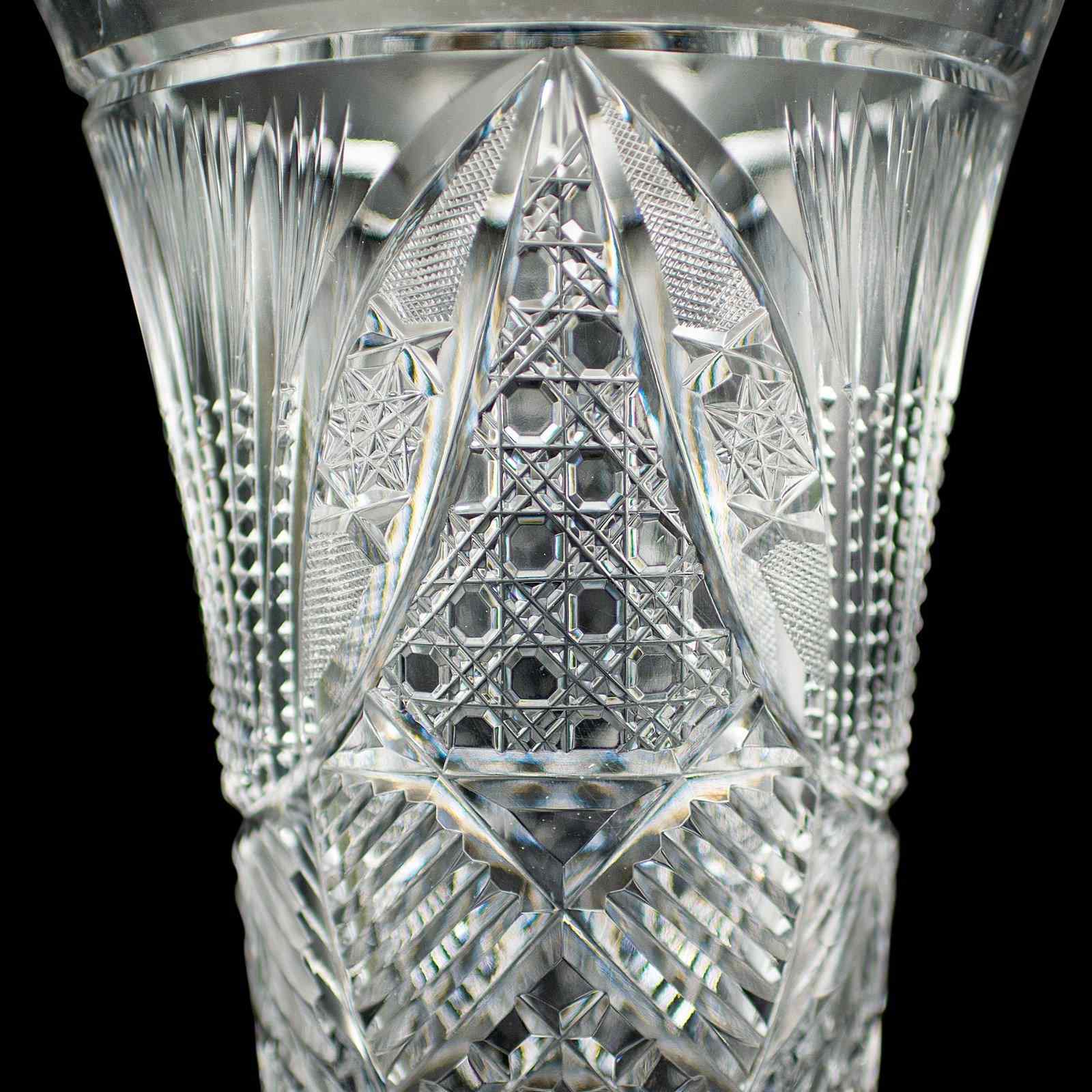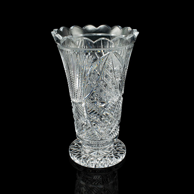 This is a striking vintage trumpet vase, with an ornate cut glass finish and desirable spectral tonality.