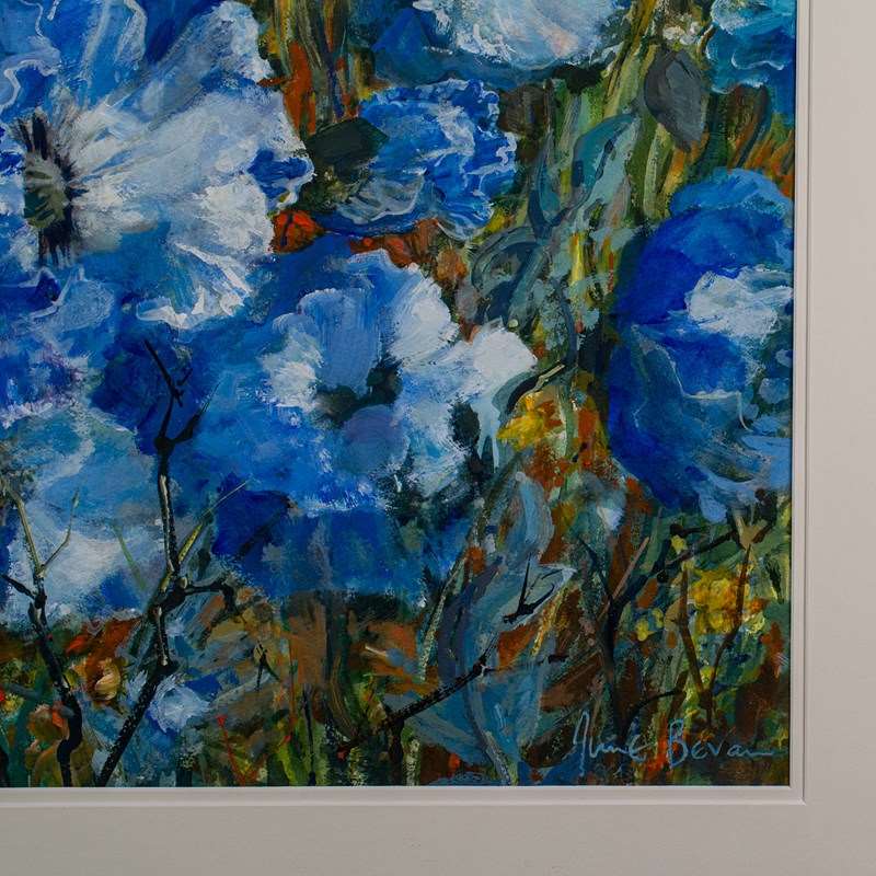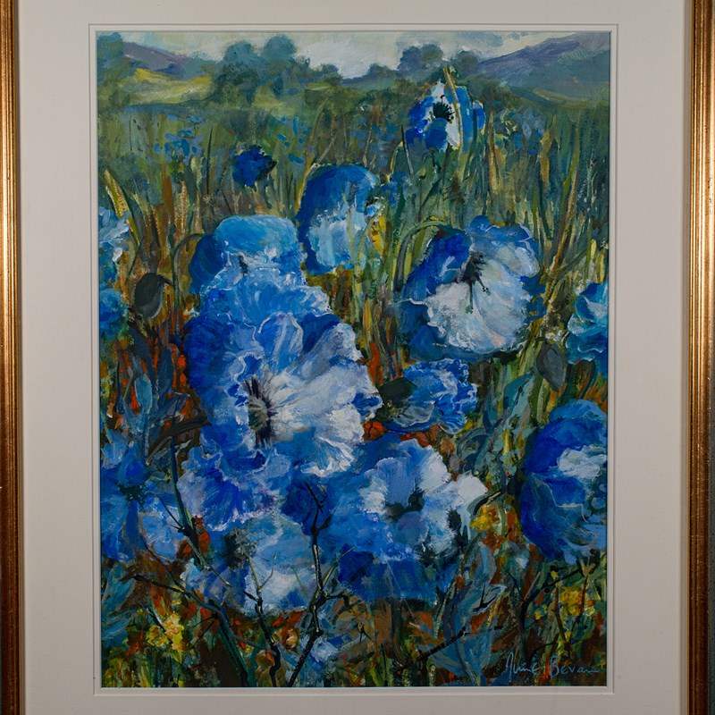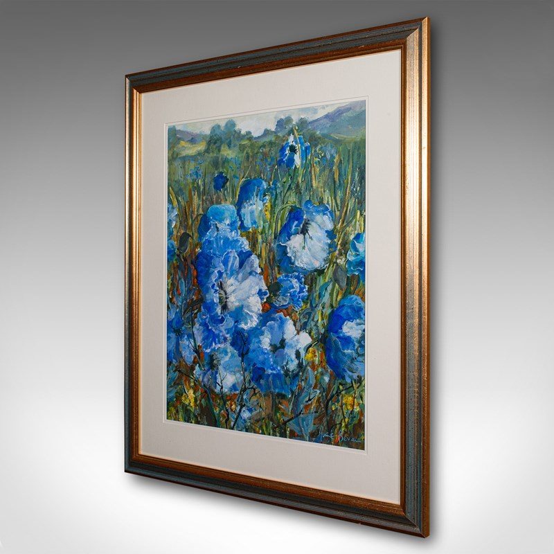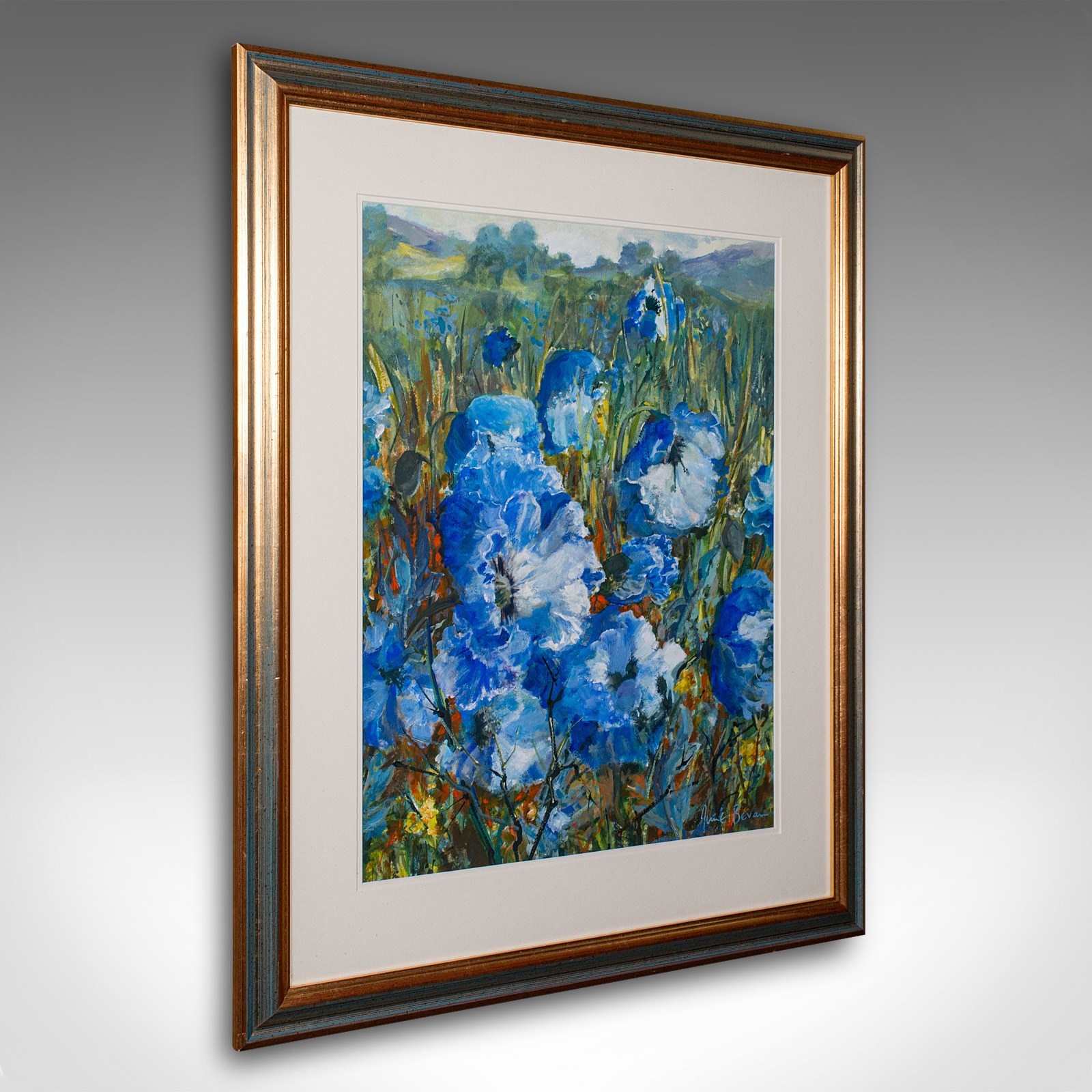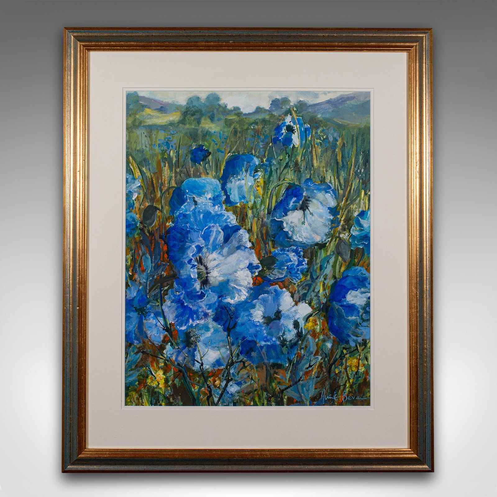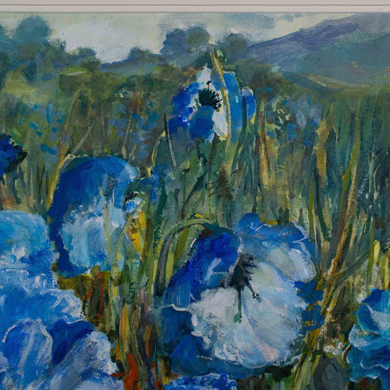 This is a vintage watercolour painting 'Blue Poppies.' An English, field landscape signed by the artist, dating to the late 20th century, circa 1990.