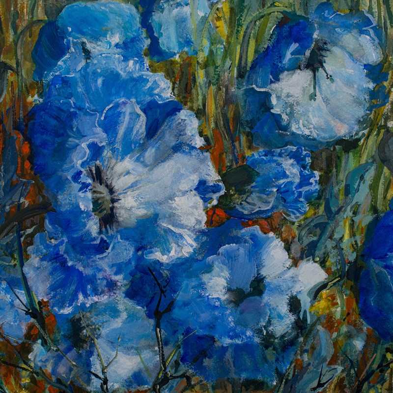 - Wonderful rendition of blue poppies in a blooming field