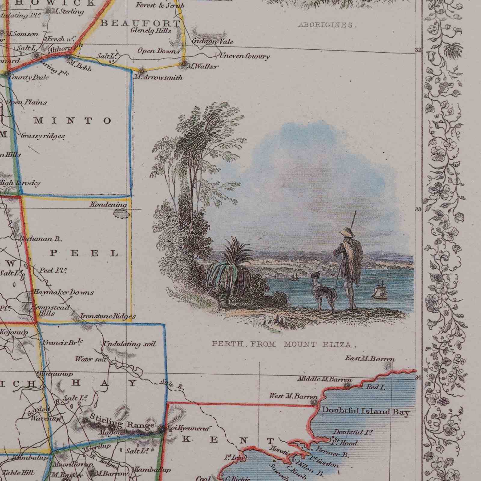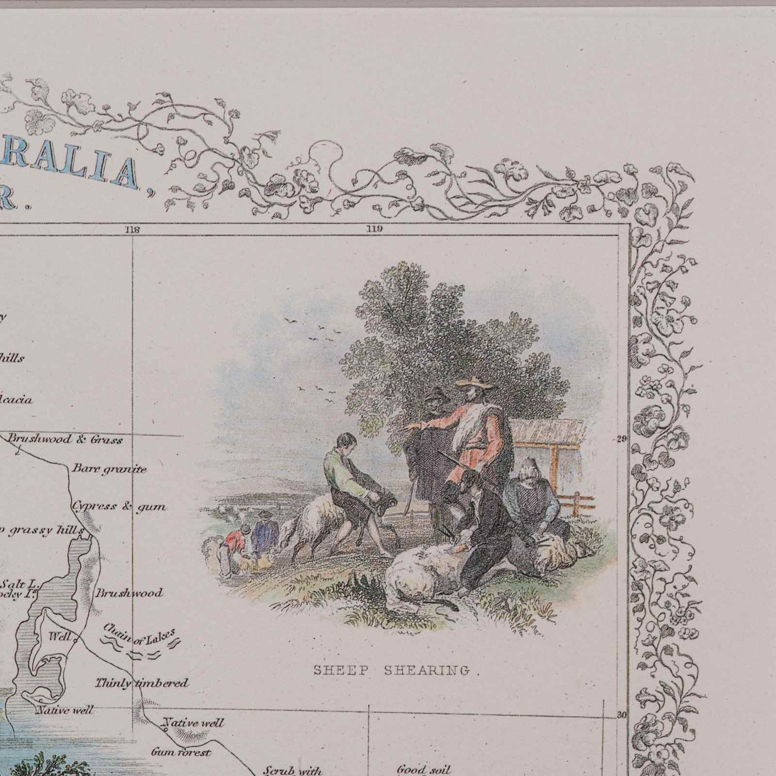 This is a vintage Western Australia map. A late 20th century reproduction of John Tallis’ original 1850 steel engravings, dating to the late 20th century, circa 1990.