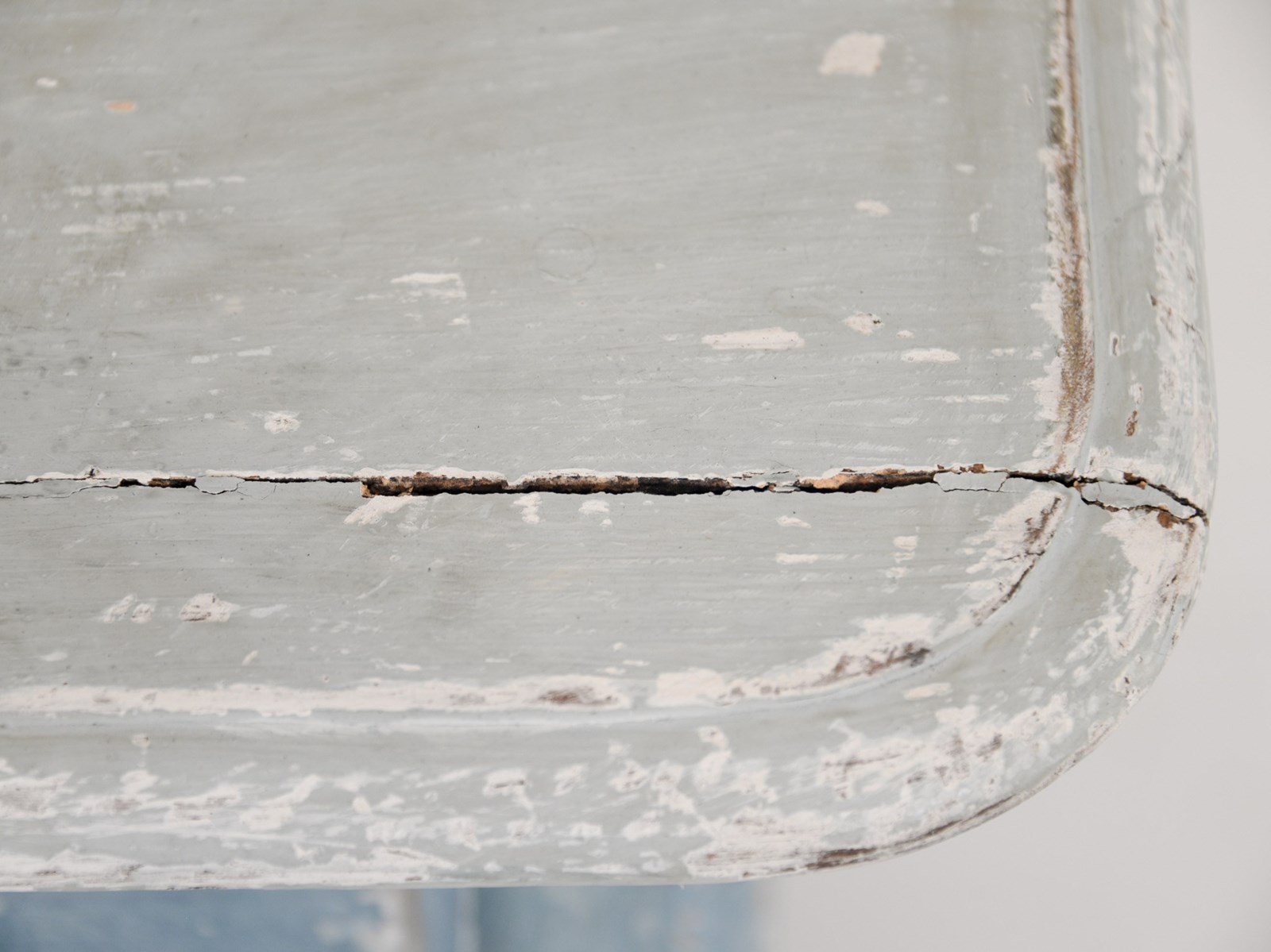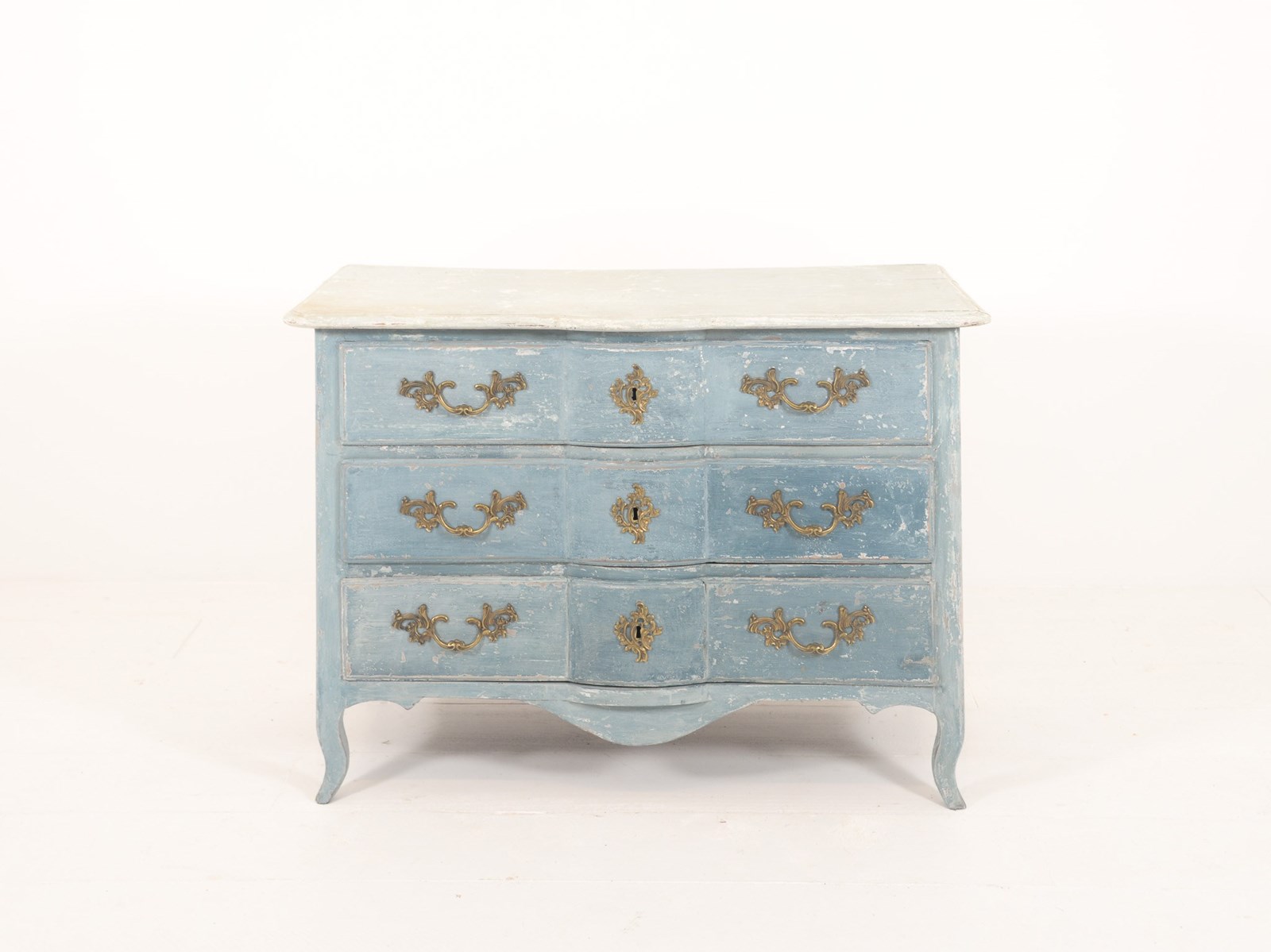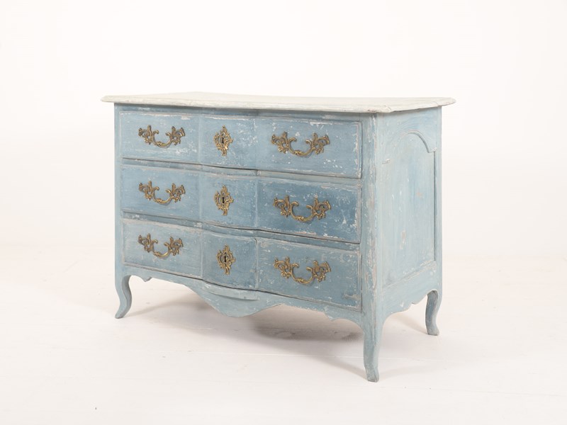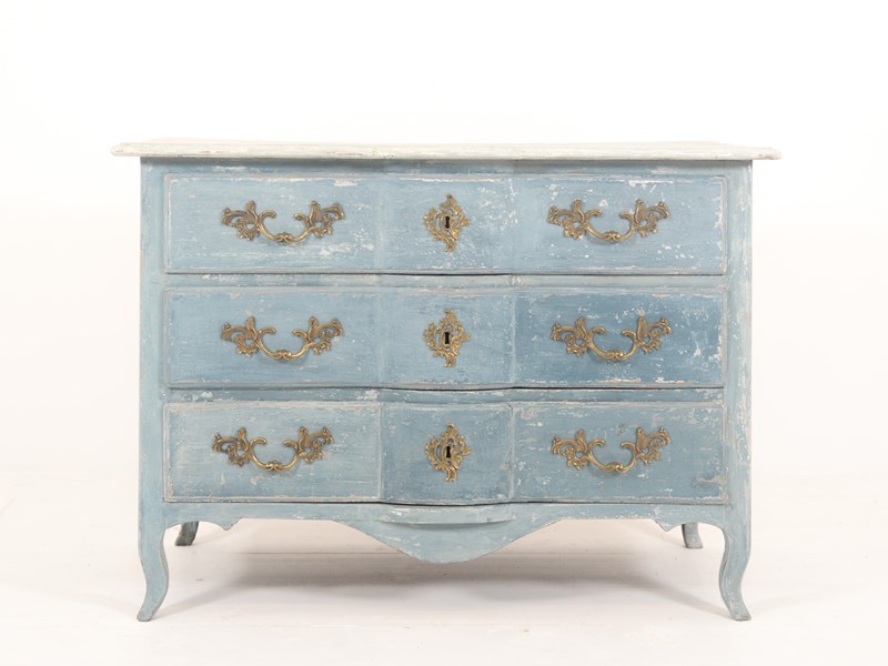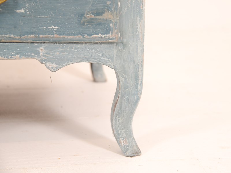 Pretty 18th Century French Commode in a lovely shade of blue scraped paint.  Three drawers.  Very sturdy and in excellent condition.