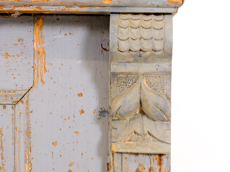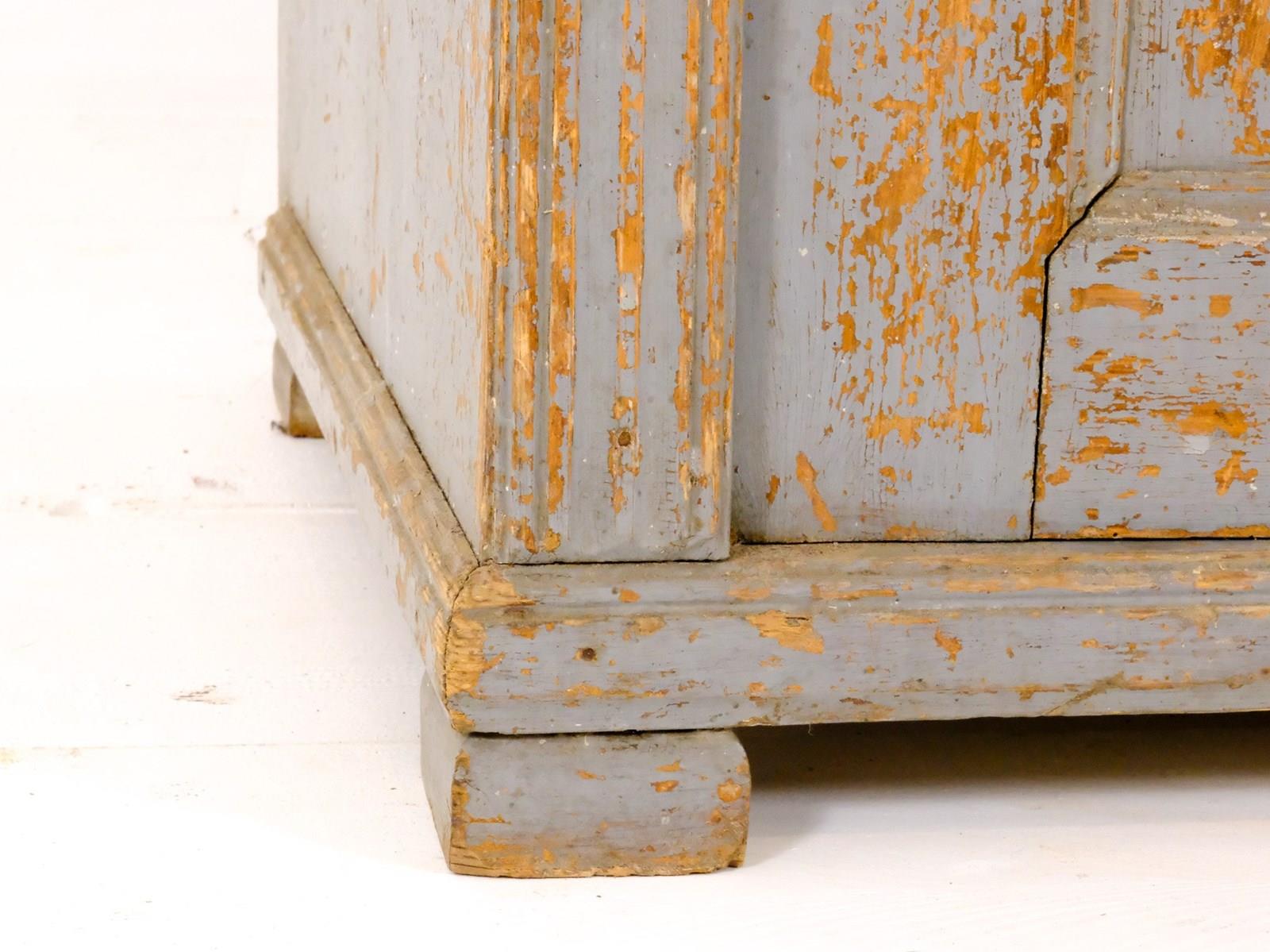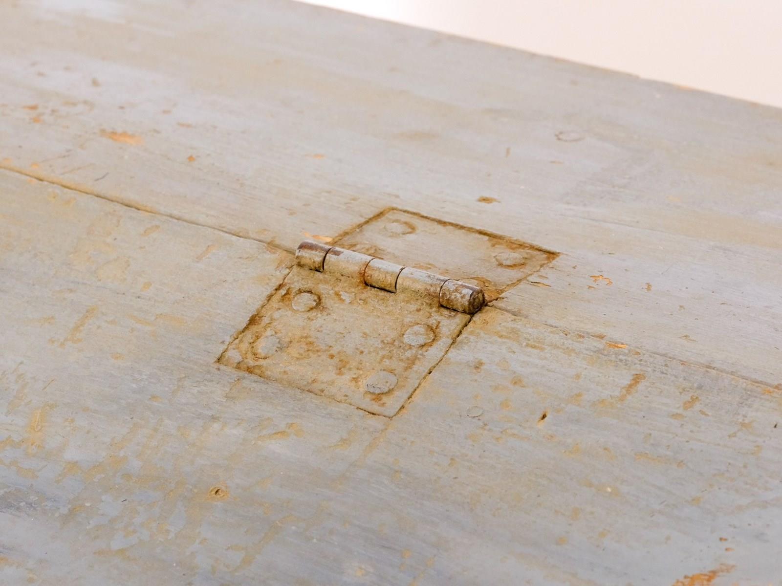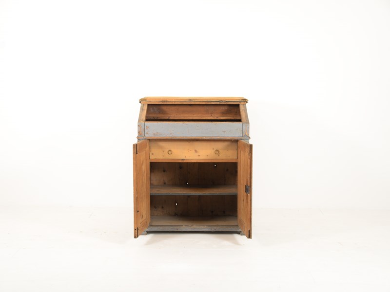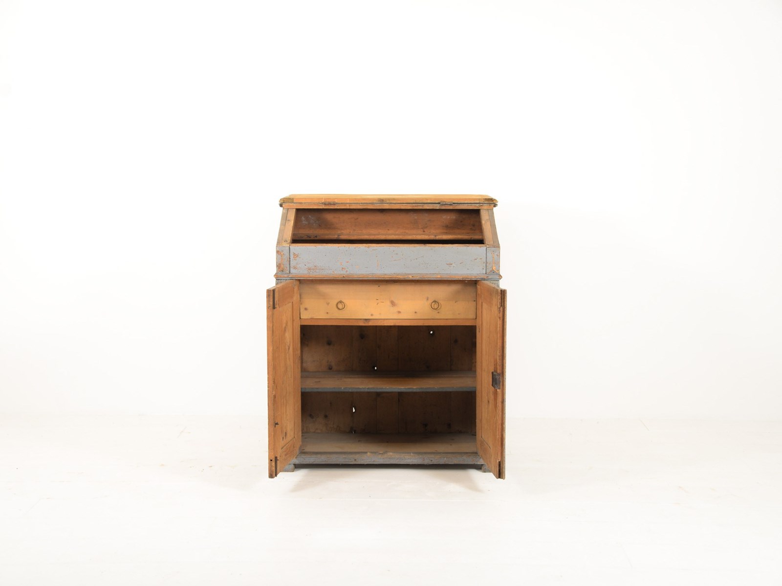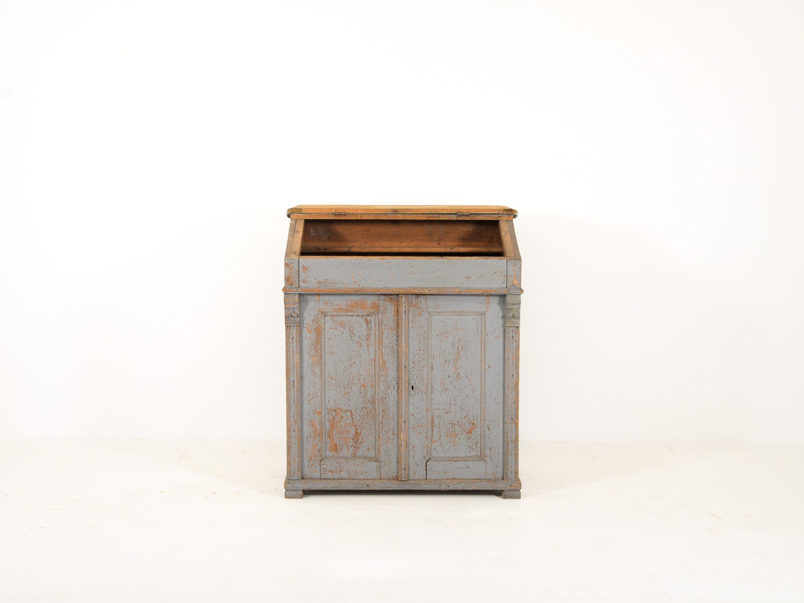Very pretty little French desk with opening top and cupboard underneath with single shelf and drawer. Original scraped paint in grey blue shade.
