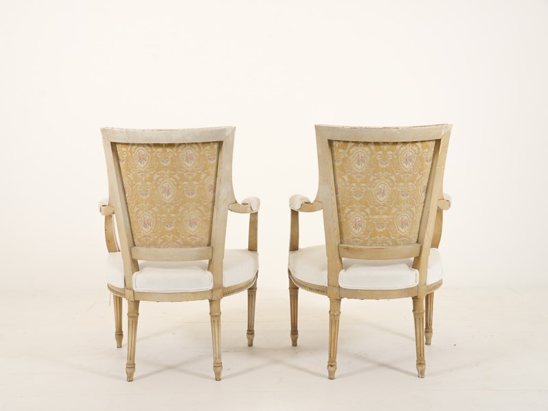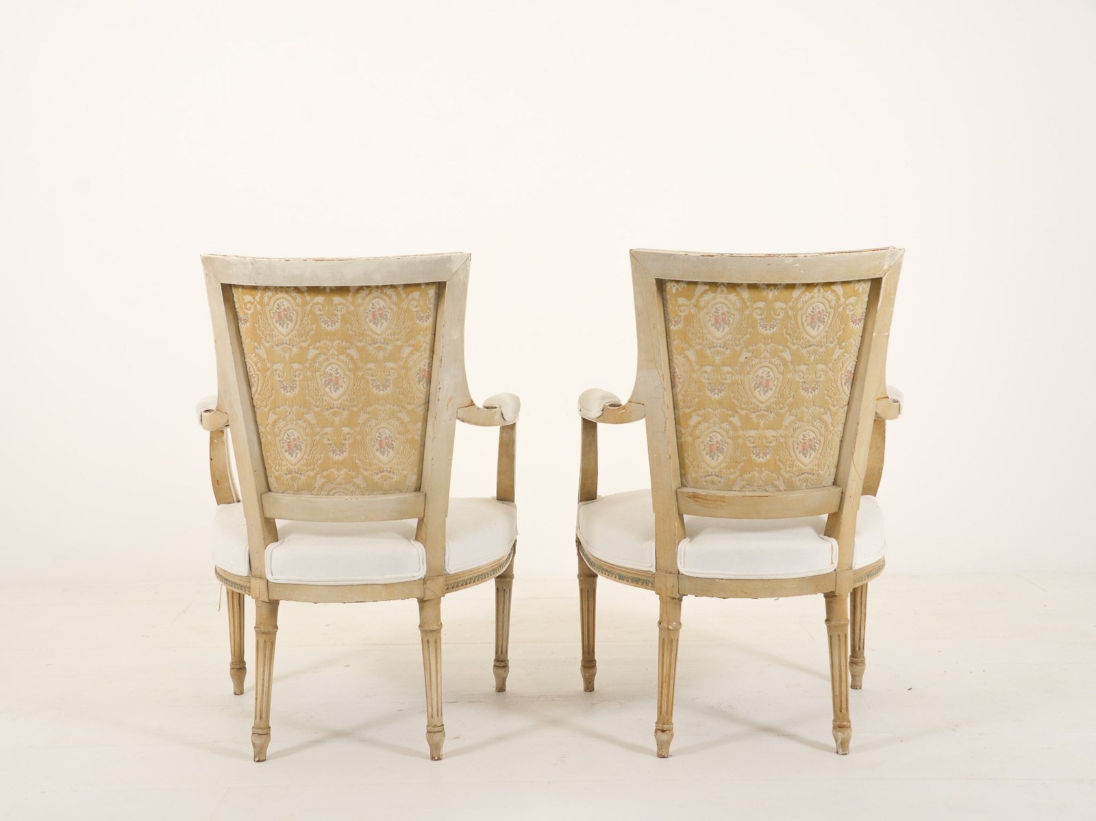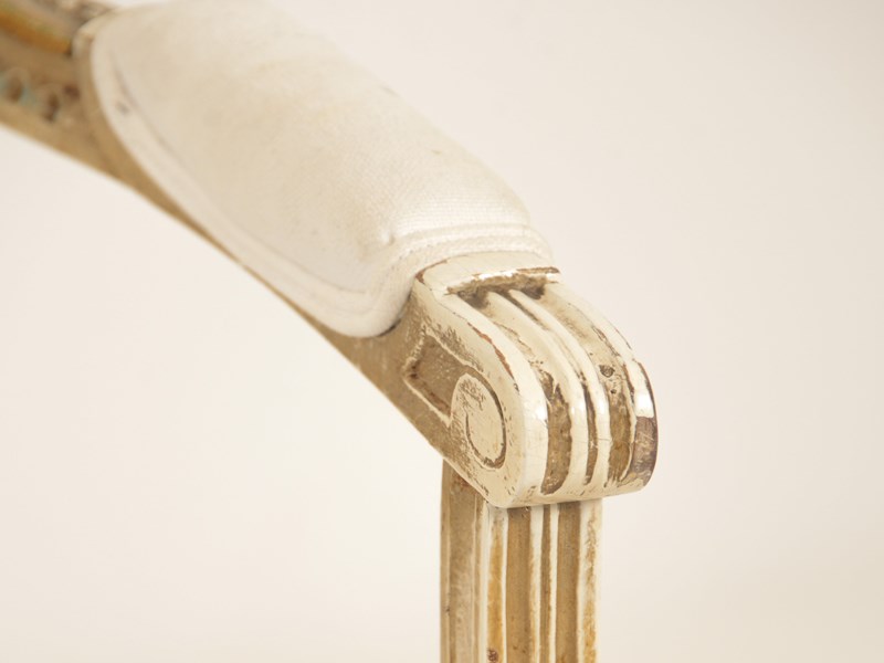 Beautiful pair of occasional chairs from France,  re-upholstered in a soft shade of white calico/cotton ready to cover in the material of your choice.  The backs have original fabric intact. Pretty detailing to the woodwork with shades of pale green and gold. Seat height 42cm.