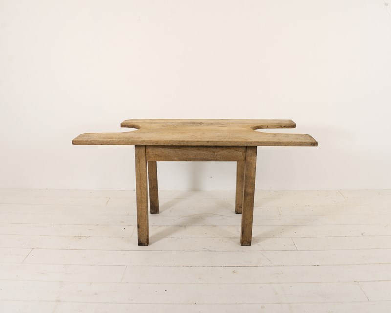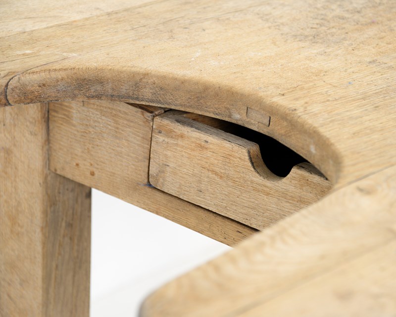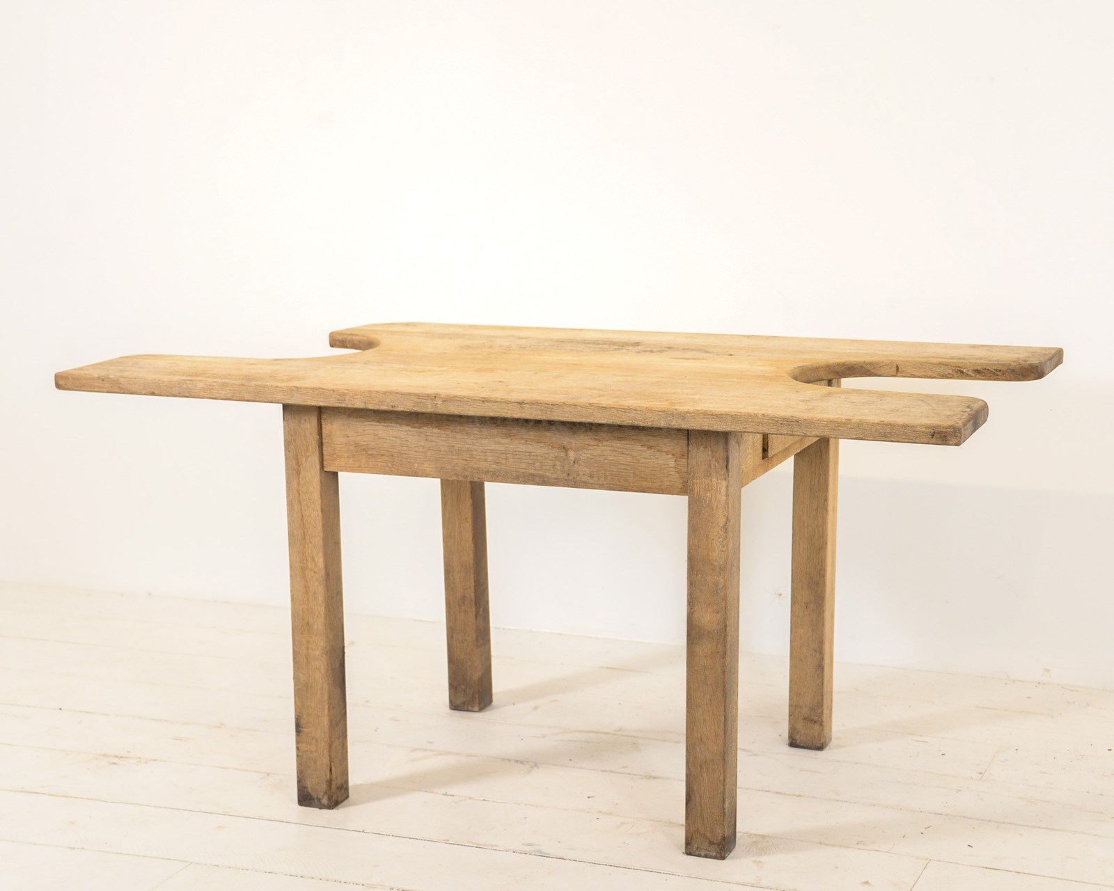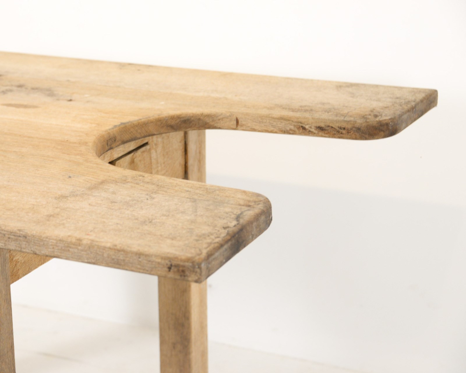 A pine jewellery maker's table from France. These tables have curved sides cut out of them so the maker can sit on a stool to make their creation. Under each of these curves are a single drawer on each side for tools. This table has been stripped back. The top sits on the separate base. A lovely piece for a jewellery maker or another creative form of craft, or as a quirky display table. Two widths 168cm and 147cm.