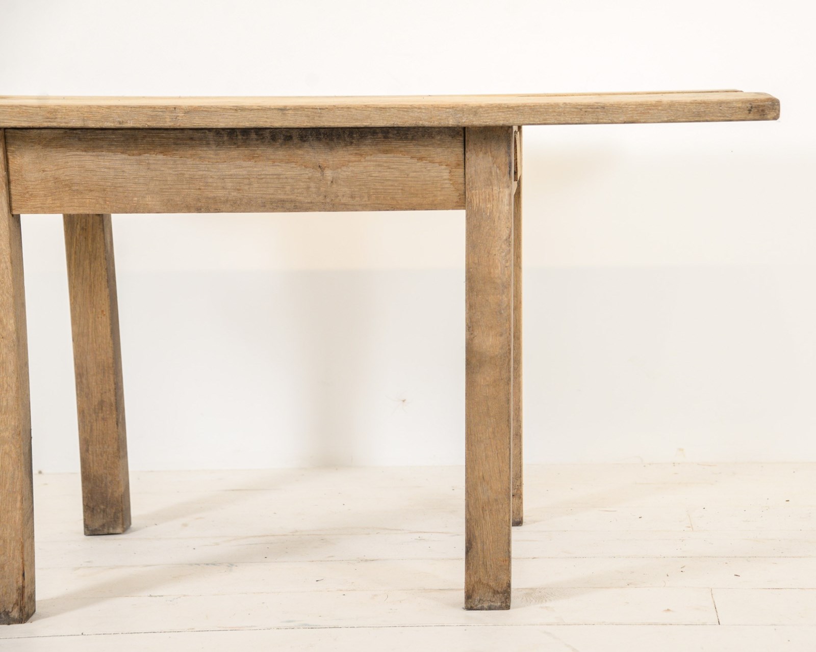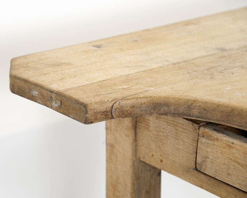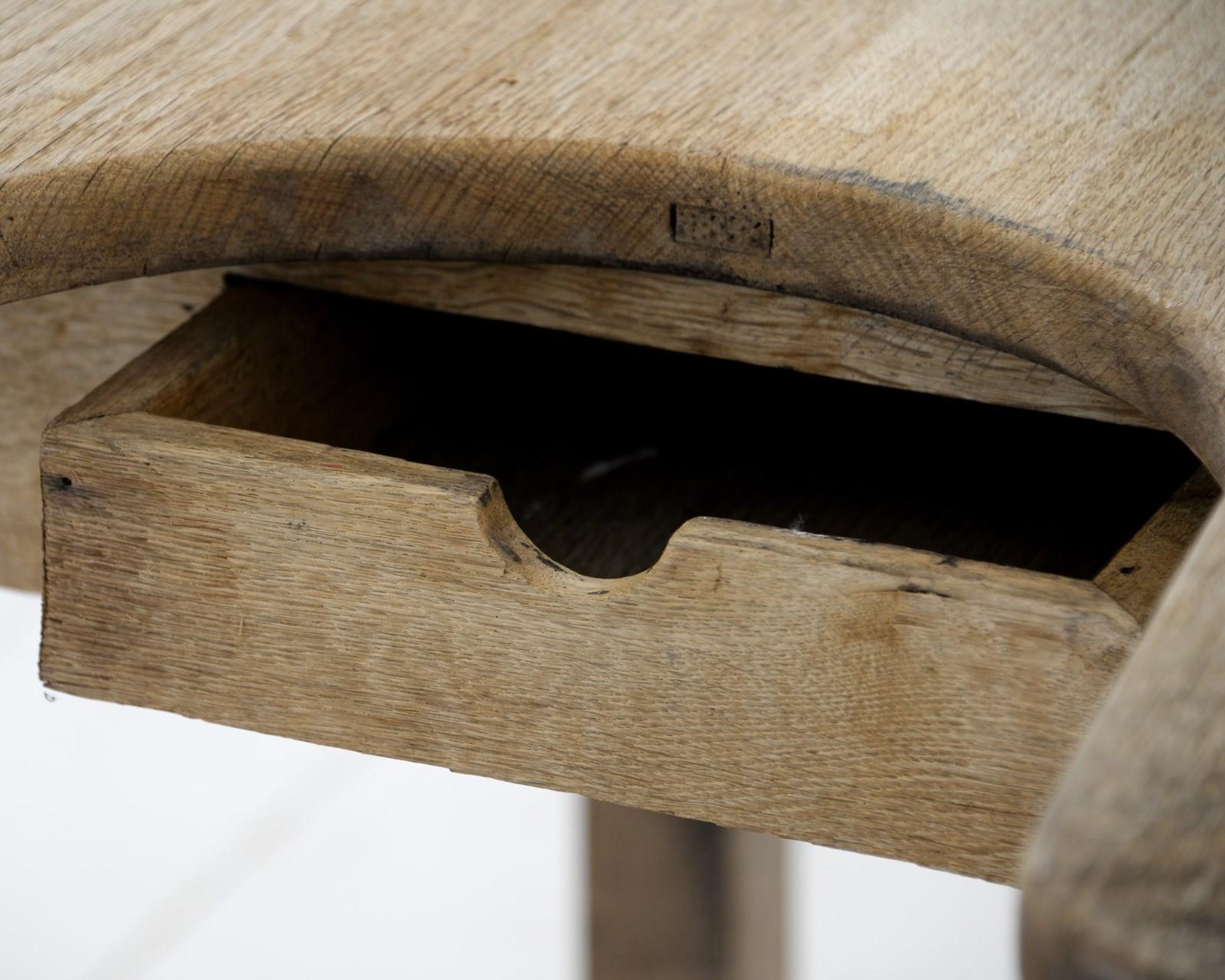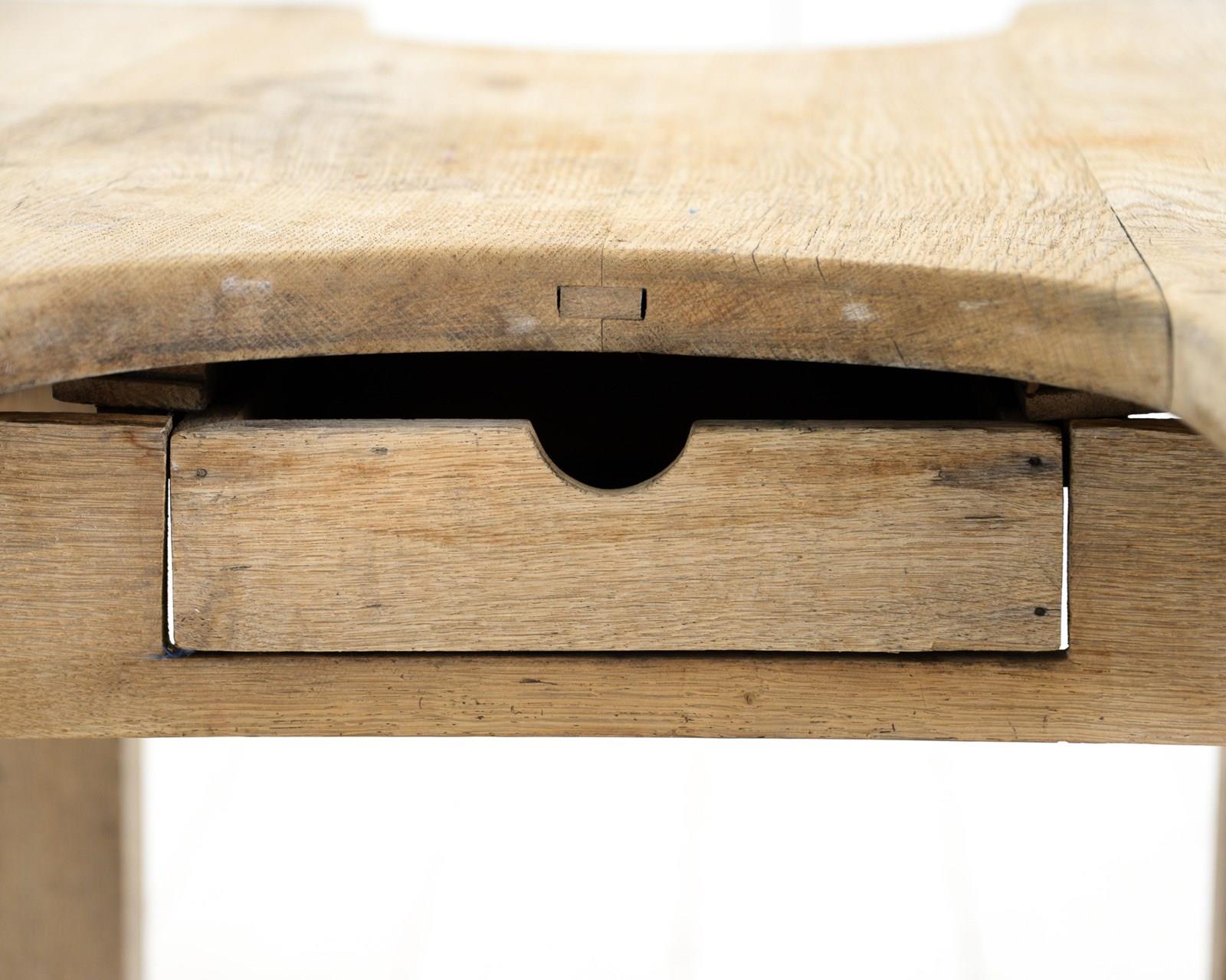 A pine jewellery maker's table from France. These tables have curved sides cut out of them so the maker can sit on a stool to make their creation. Under each of these curves are a single drawer on each side for tools. This table has been stripped back. The top sits on the separate base. A lovely piece for a jewellery maker or another creative form of craft, or as a quirky display table. Two widths 168cm and 147cm.