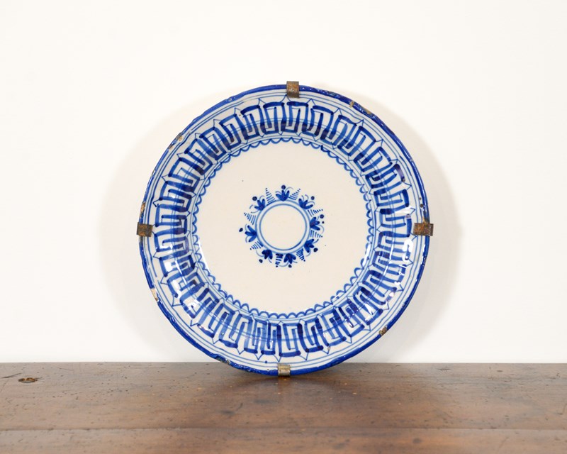 Spanish 19th century blue and white glazed plate. Valencia, Spain. Wear and tear commensurate with age. Currently with a wire plate hanger on the back.