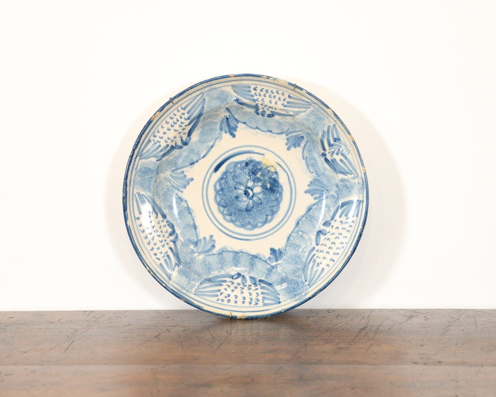 Spanish 19th century blue and white glazed plate. Valencia, Spain. Wear and tear commensurate with age. Currently with a wire plate hanger on the back.