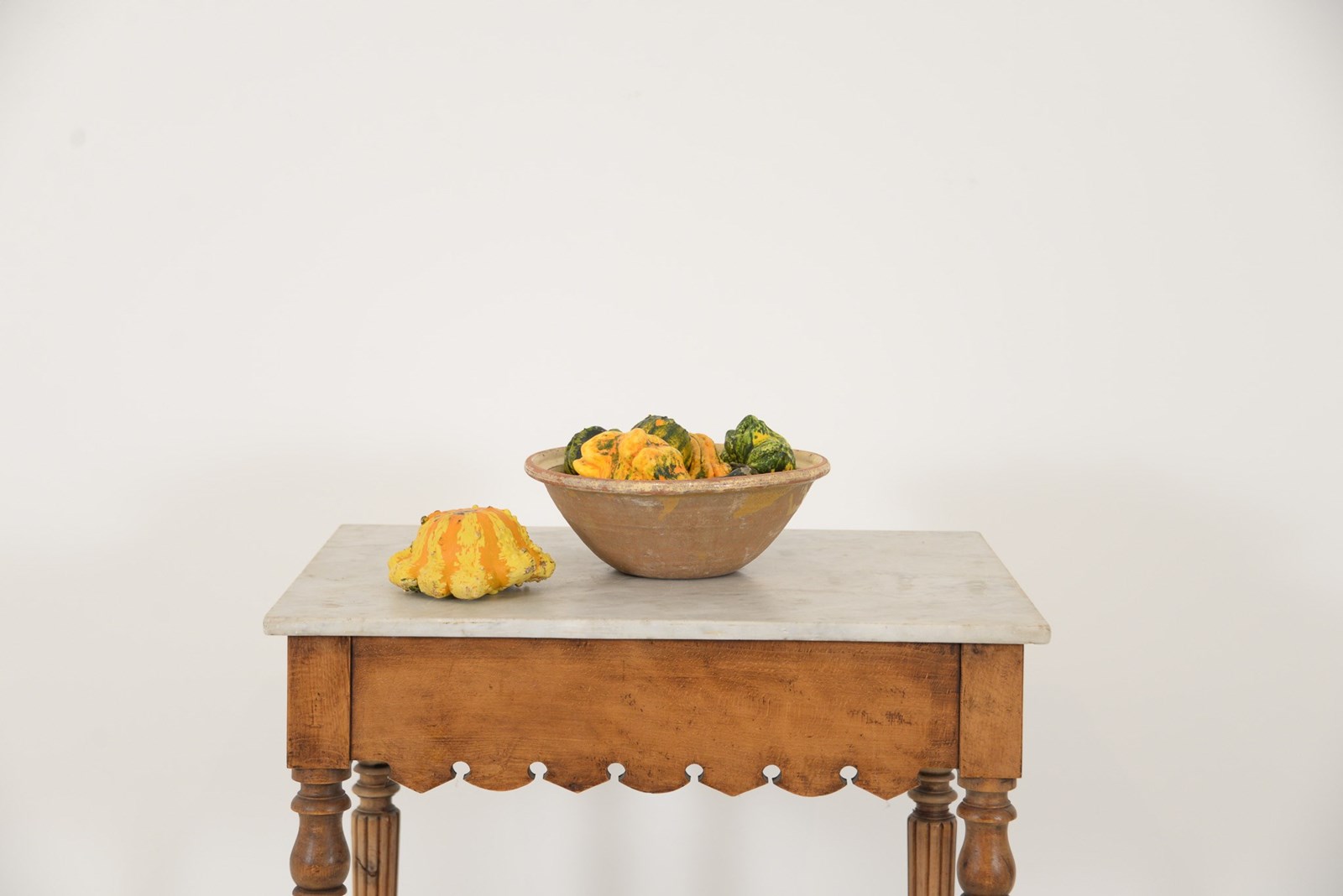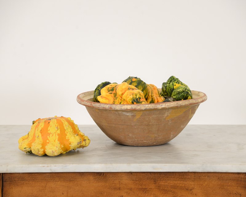 19th century Spanish terracotta bowl with ochre glaze and umber pattern.