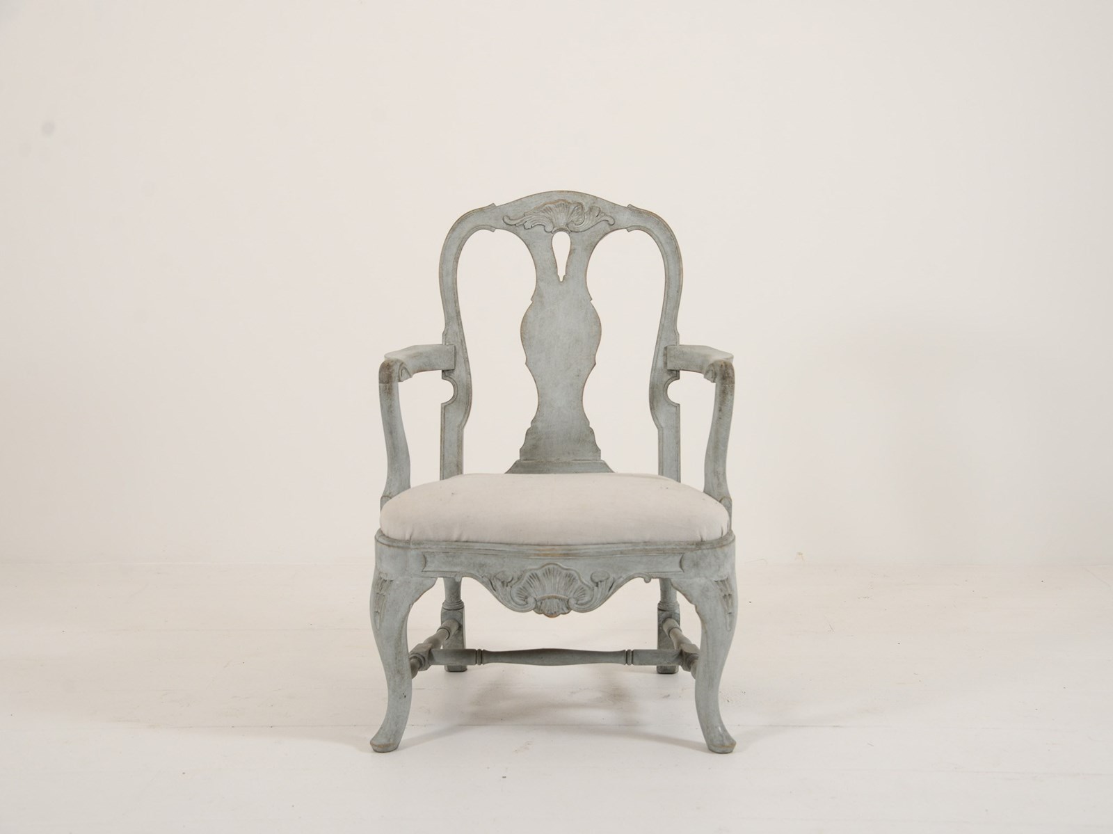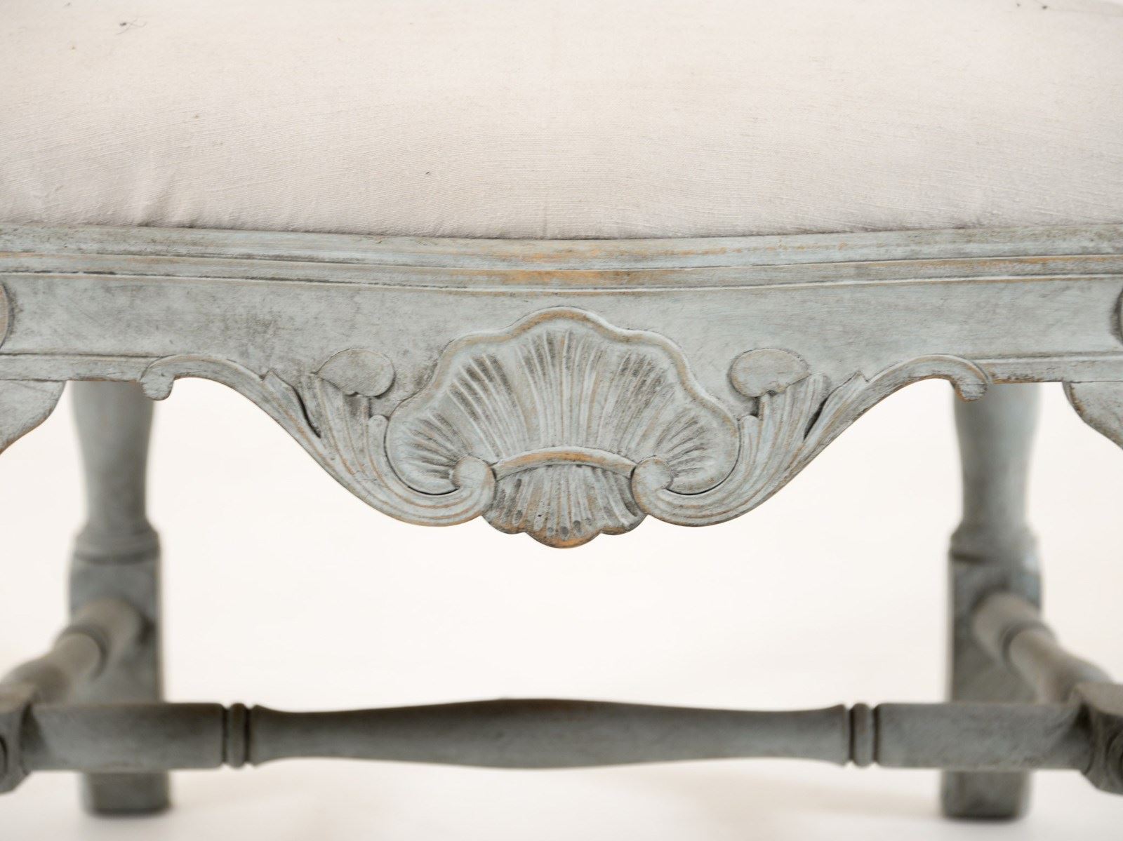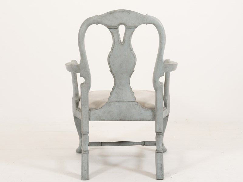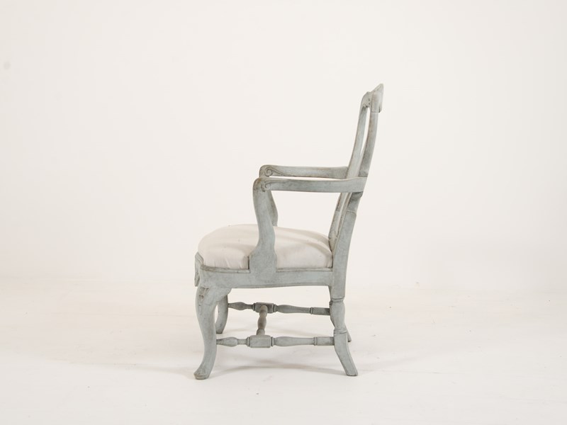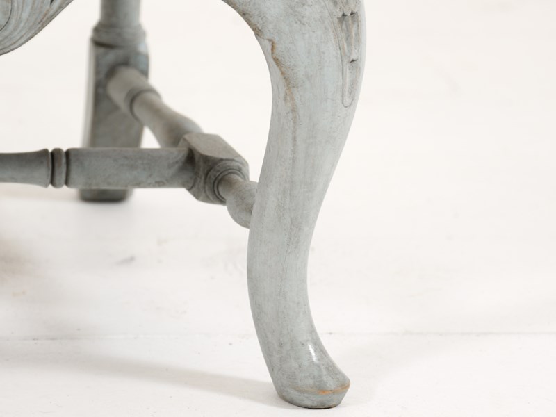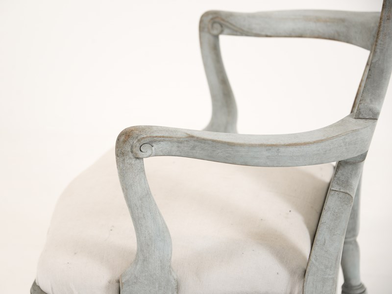 Swedish Rococo Carver chair from the 1890s. Scraped and painted to a blue-grey paint hue on the frame with typical Rococo motif design. Seat covered in lovely pale off-white linen. Seat height 40cm.