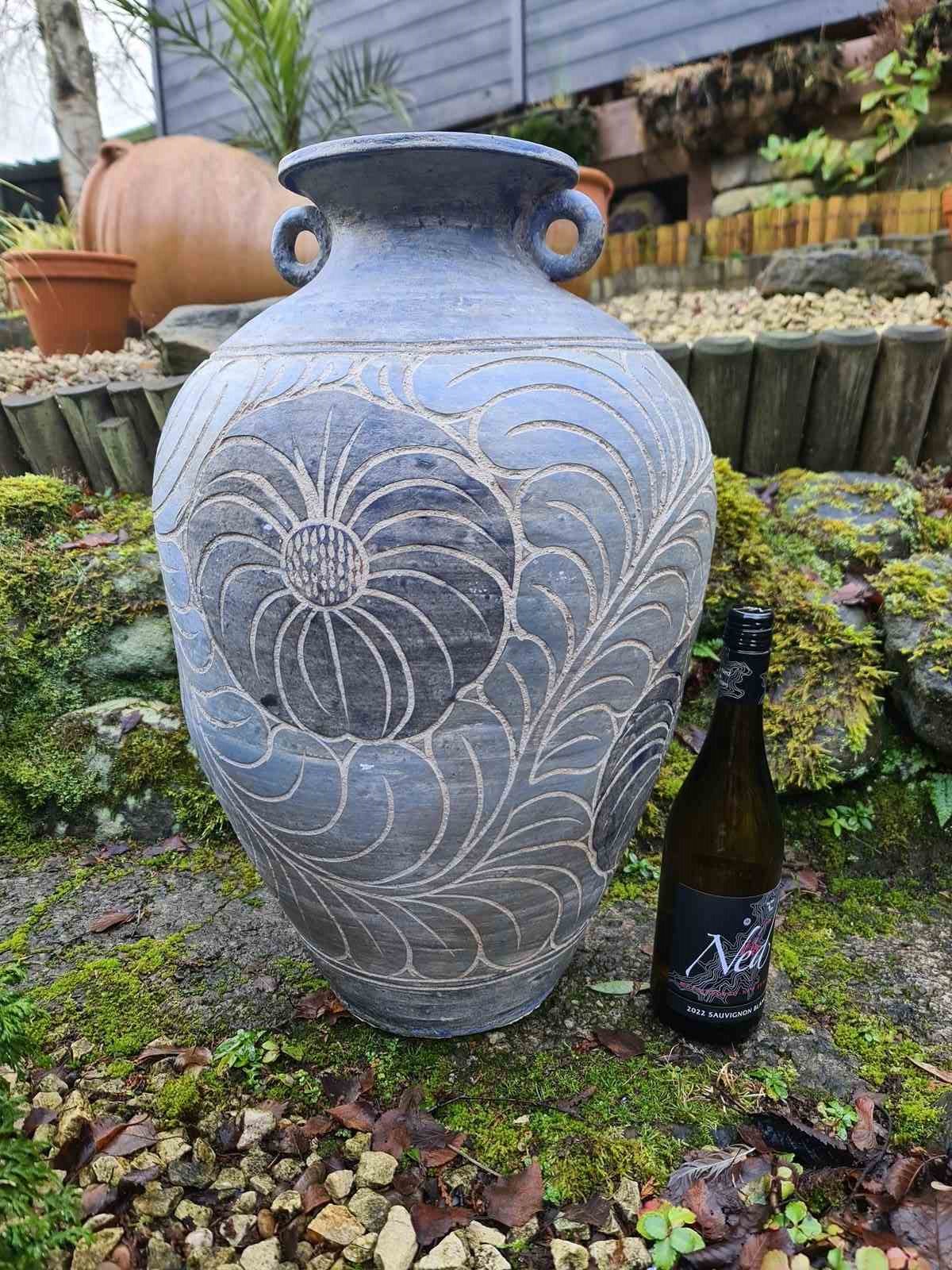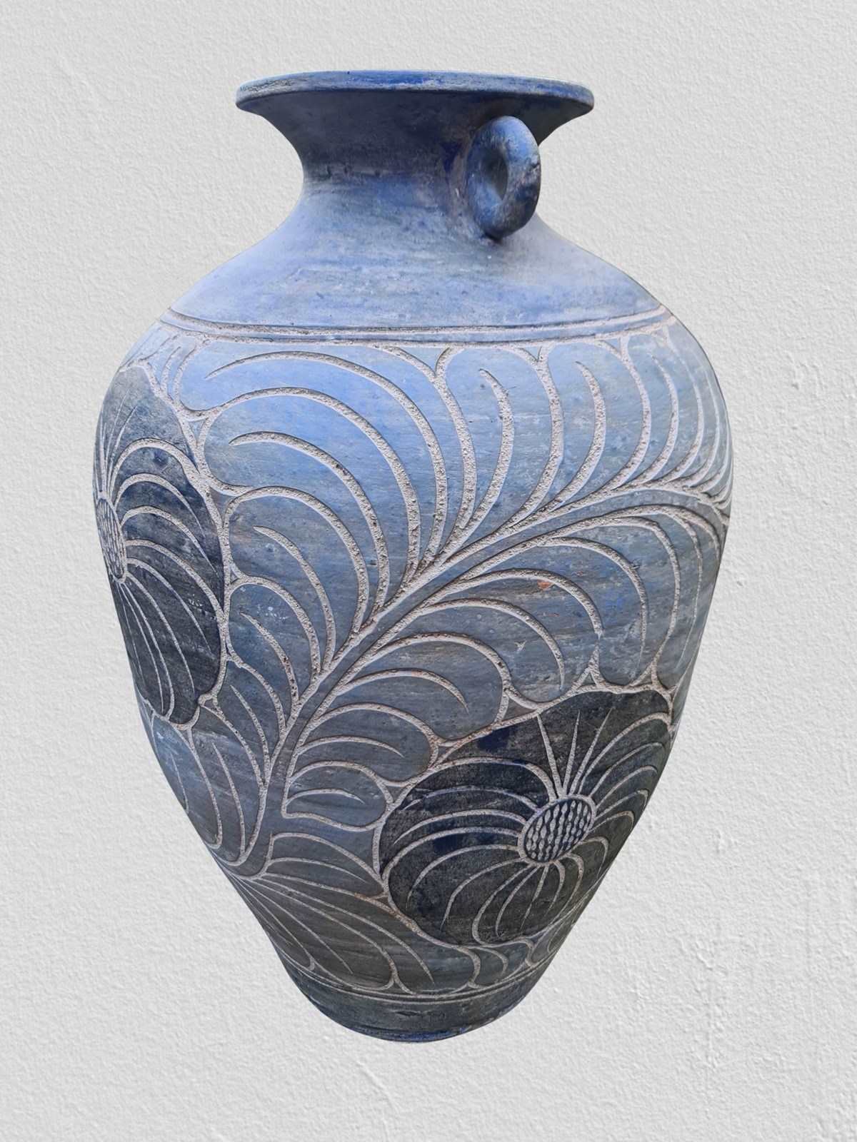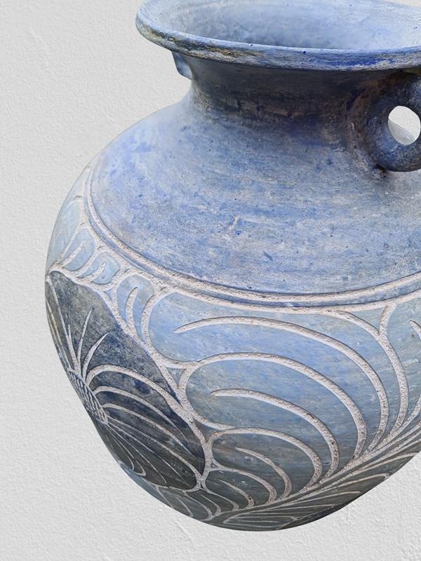 Very large pottery vase/urn with flared rim and moulded ring handles. Beautiful pale blue and grey colouring, with padded soft base fitted for safe interior display.