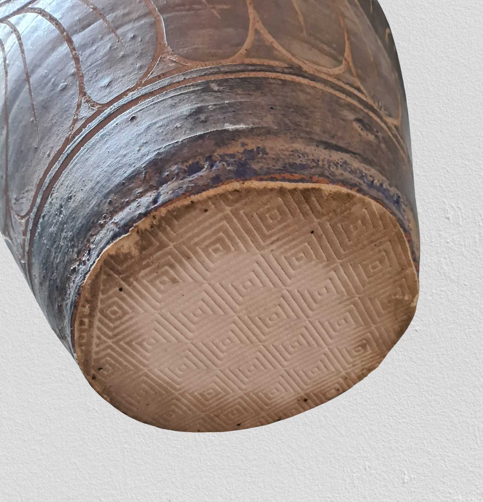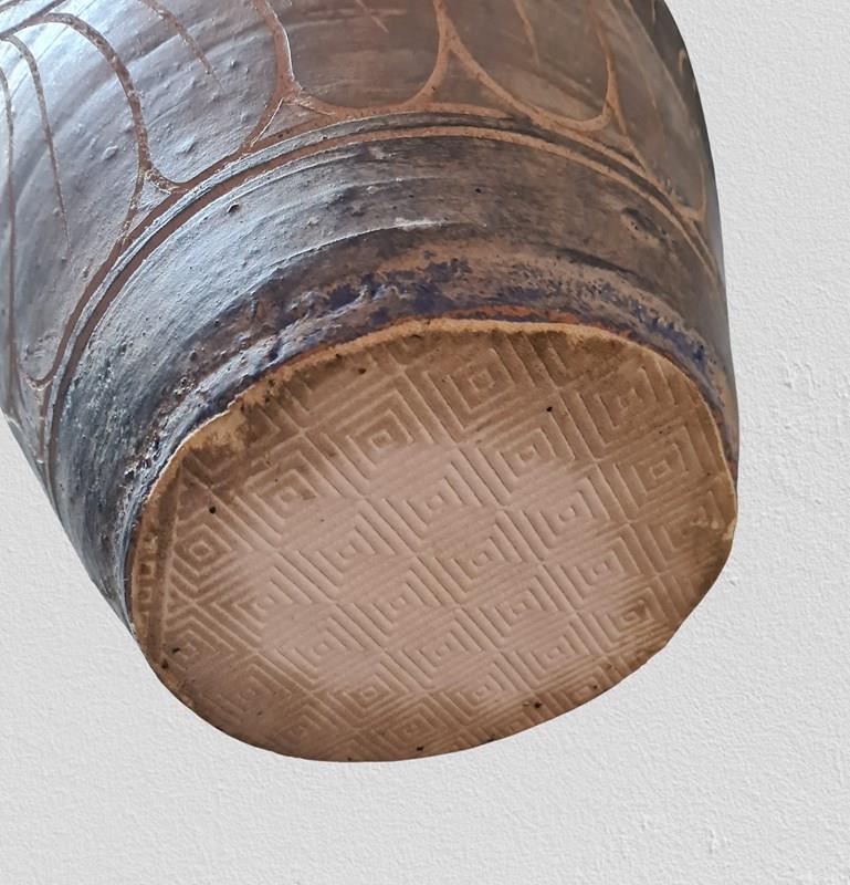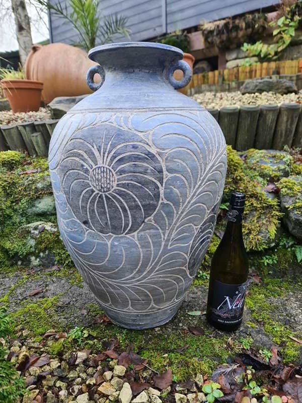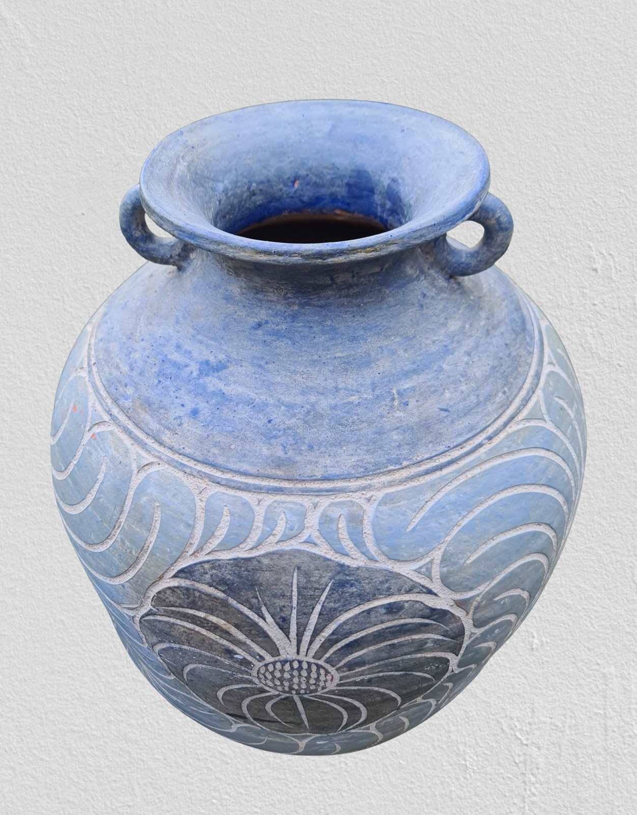 Very large pottery vase/urn with flared rim and moulded ring handles. Beautiful pale blue and grey colouring, with padded soft base fitted for safe interior display.