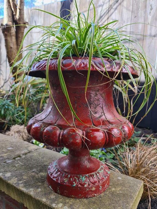 Wonderful, well shaped French painted urn which would make an attractive garden feature. Faded maroon paint as seen on the photographs giving it a really good distressed look, but in very good condition. With lobed and waisted design, standing on circular base.