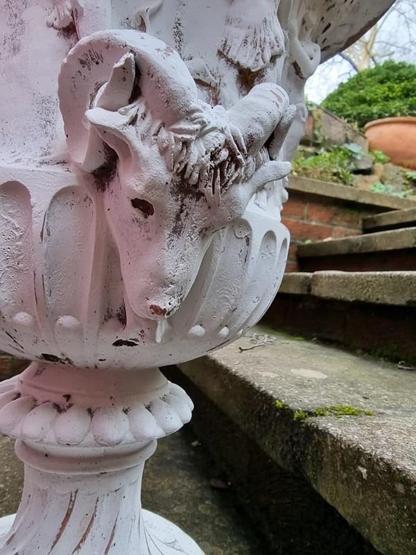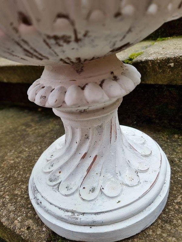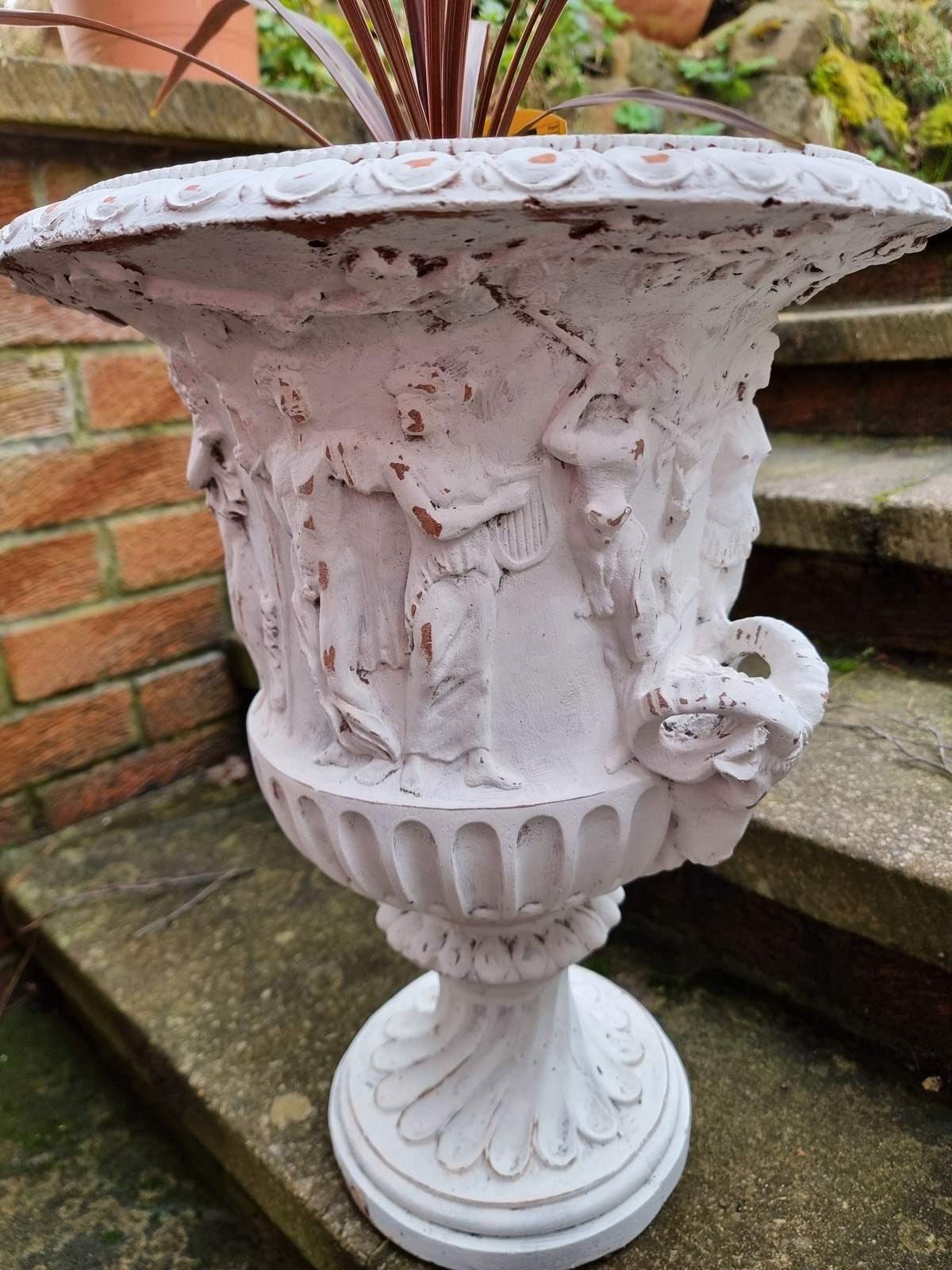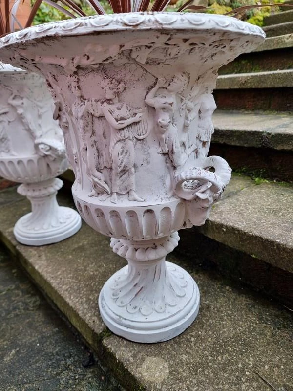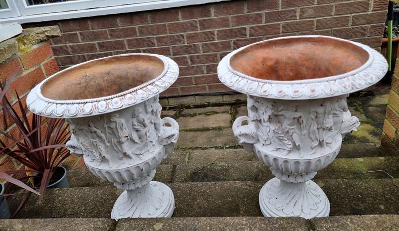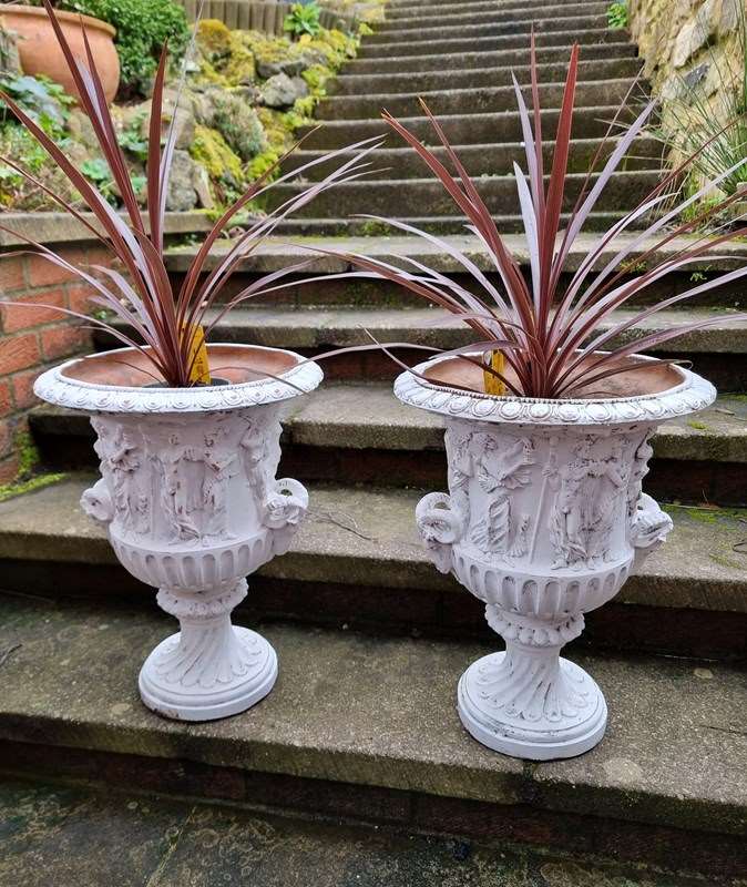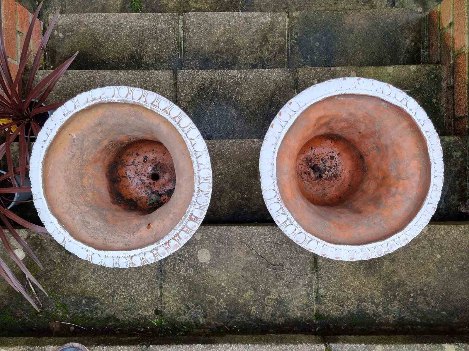 A pair of handsome mid 20th Century terracotta urns, great condition, chalky white patina. Ready for the garden or conservatory. Very decorative.