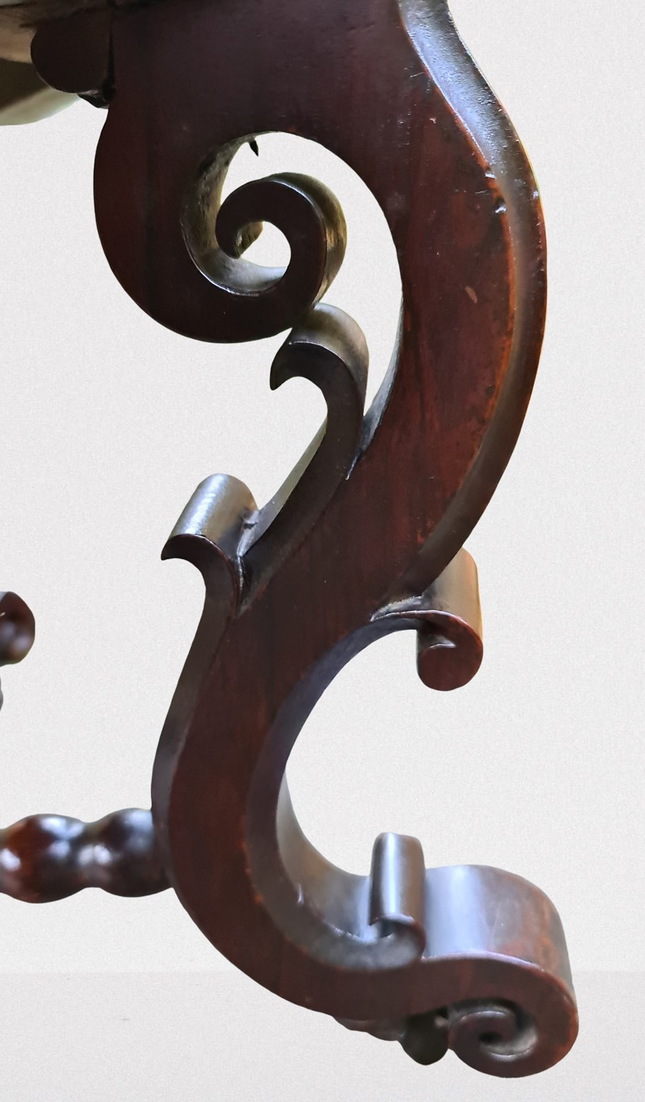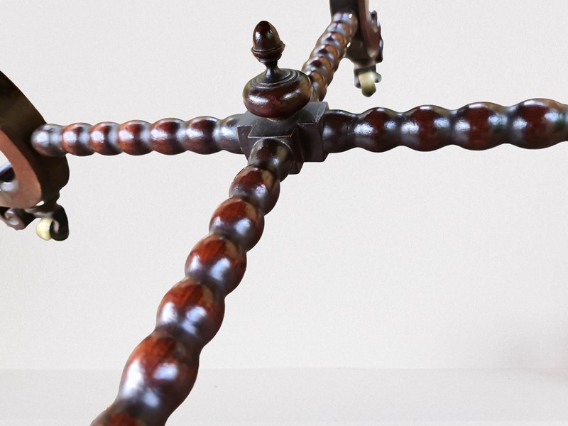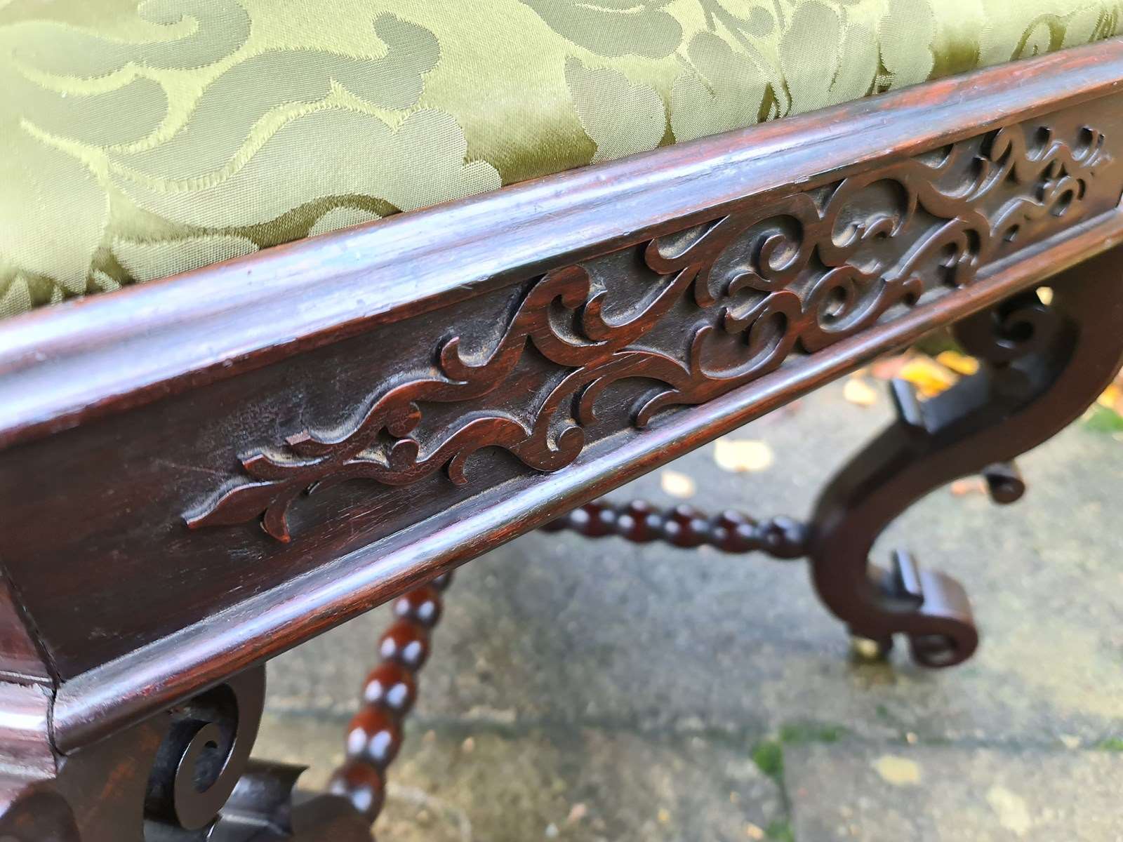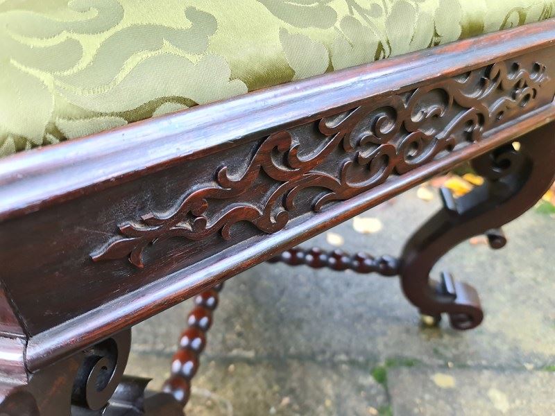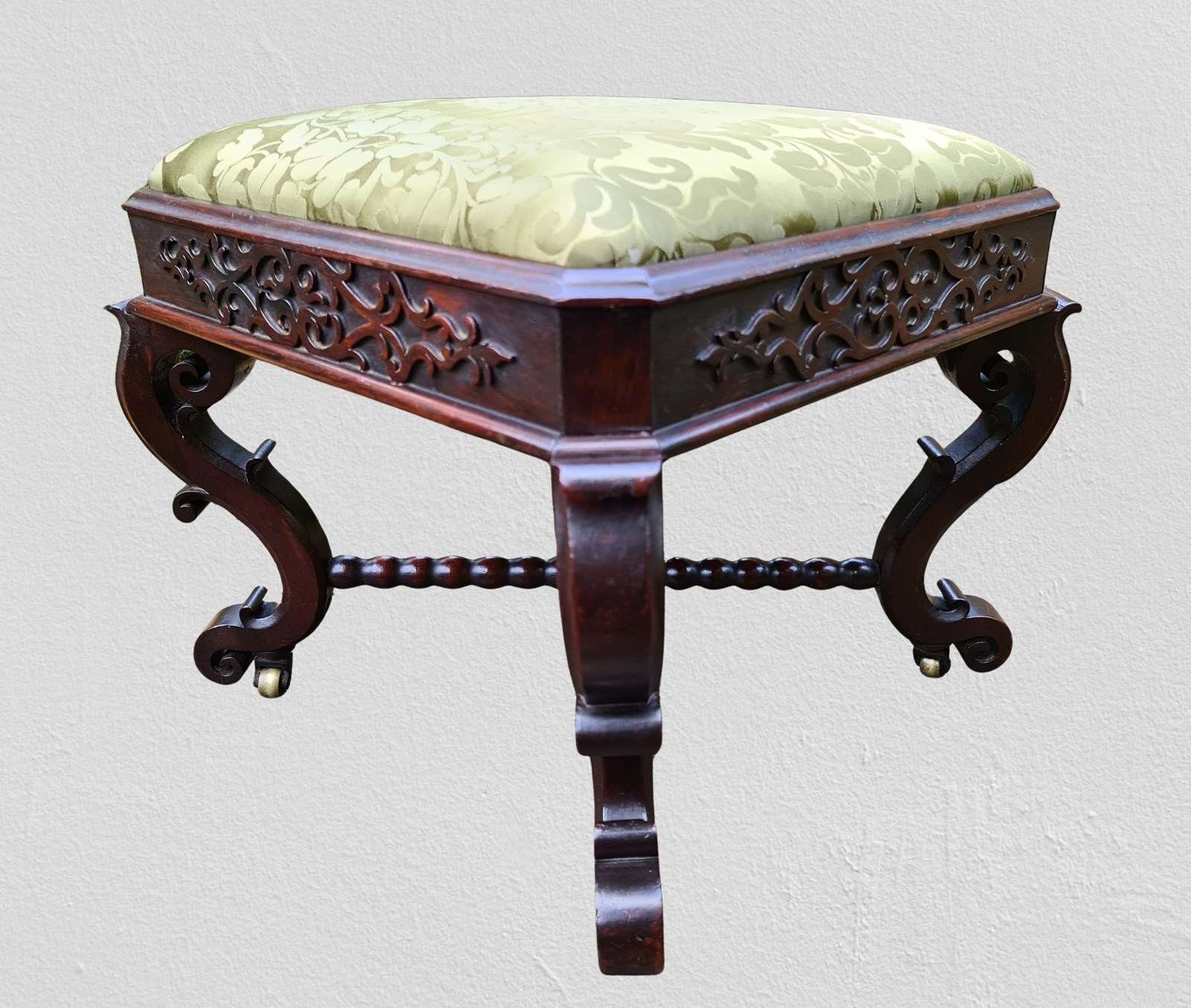 A rare example of a stool upholstered in French brocade. Wonderful patina and rich colour in the Chippendale taste. Stylish blind fret frieze around the stool with intricately carved and shaped legs and feet and bobbin turned cross stretchers with finial to the centre. It stands on original small brass castors which are virtually hidden from view.