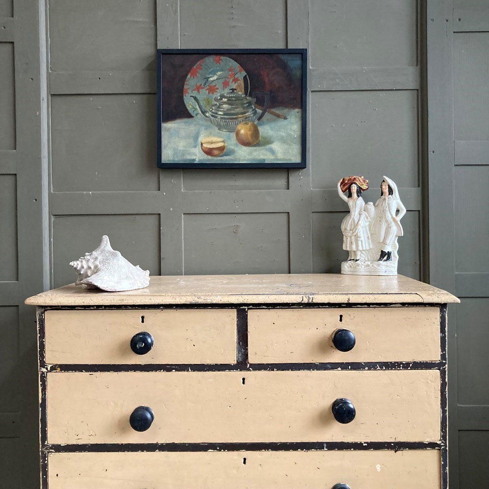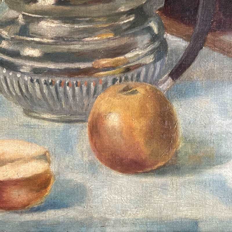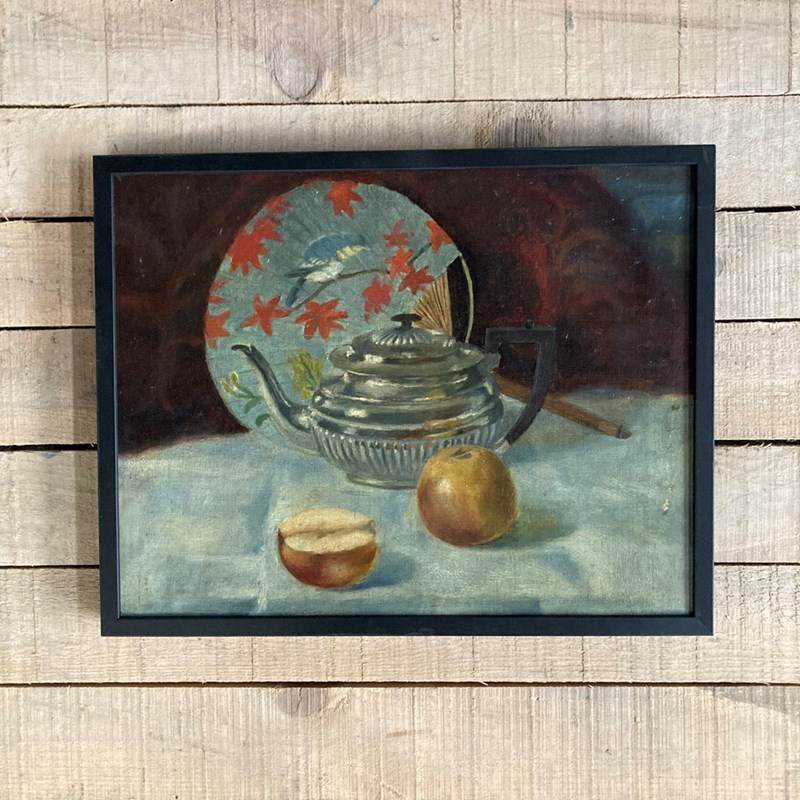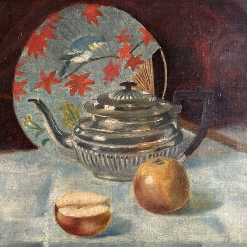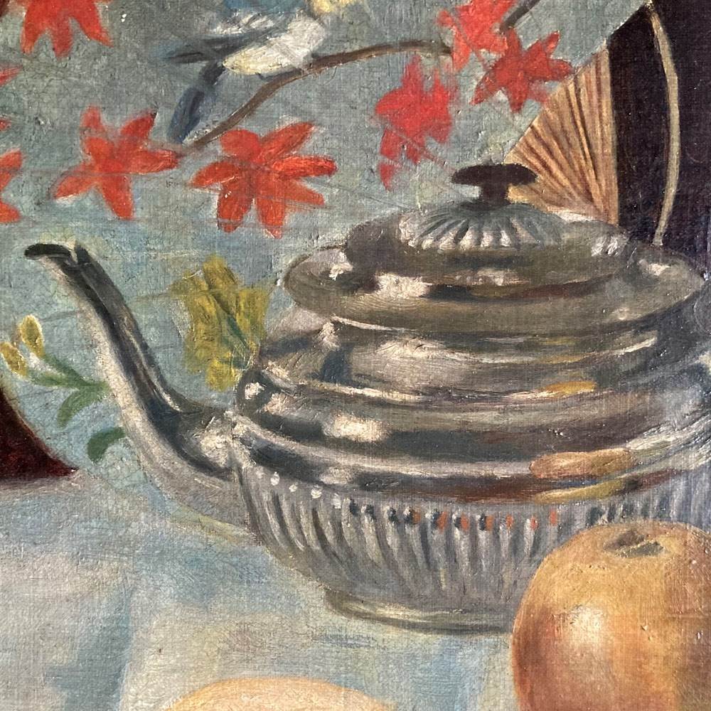 An Aesthetic period still life painting featuring a plated teapot and a Japanese style fan. Unsigned.