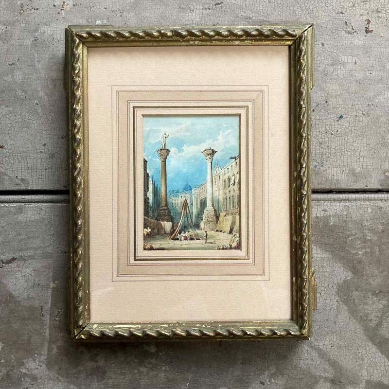 A small, early 19th century watercolour of the market in Piazza Del Signori, Vicenza. Possibly painted by an artist on the 'Grand Tour' or bought as a tourist souvenir at the time. In excellent condition with strong unfaded colours, and mounted in original gilded gesso frame.