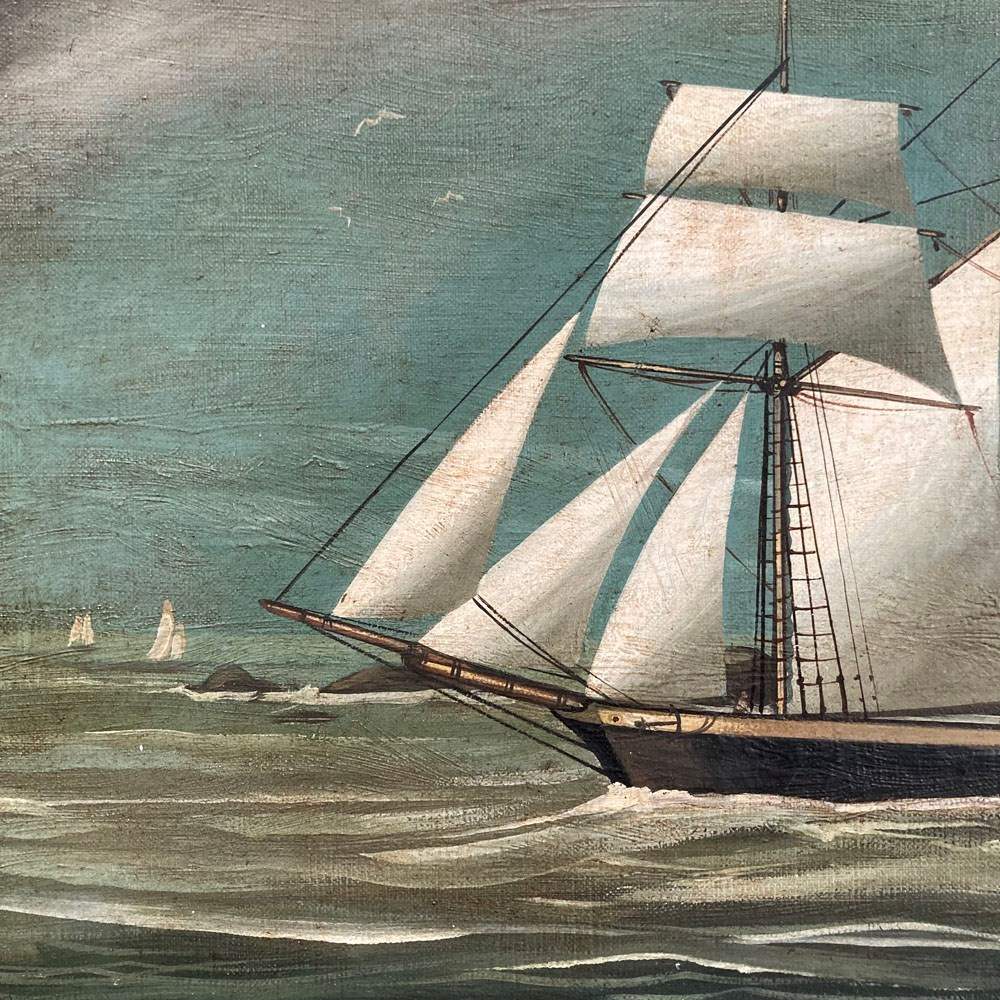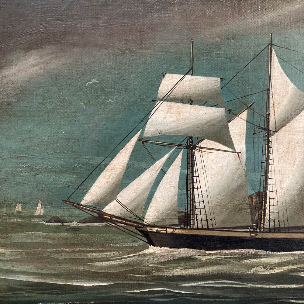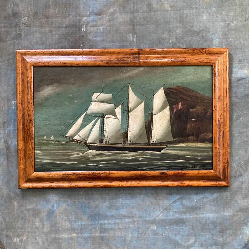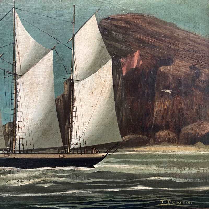 A 19th century oil on canvas painting of a three-masted barkentine vessel, sailing out to sea. It is portrayed flying a Red Ensign signifying it is a British merchant of passenger ship. Signed 'T. Pearson' to lower right. There are a couple of small dents to the canvas surface, but otherwise in very good condition, with bright colour. Original period maple frame.