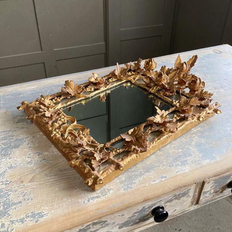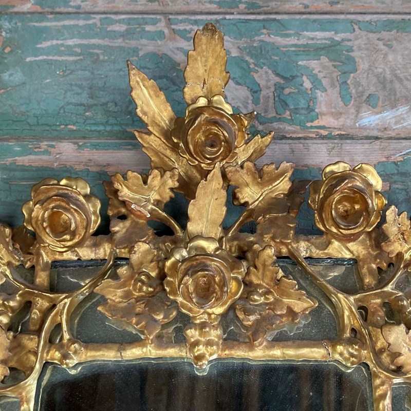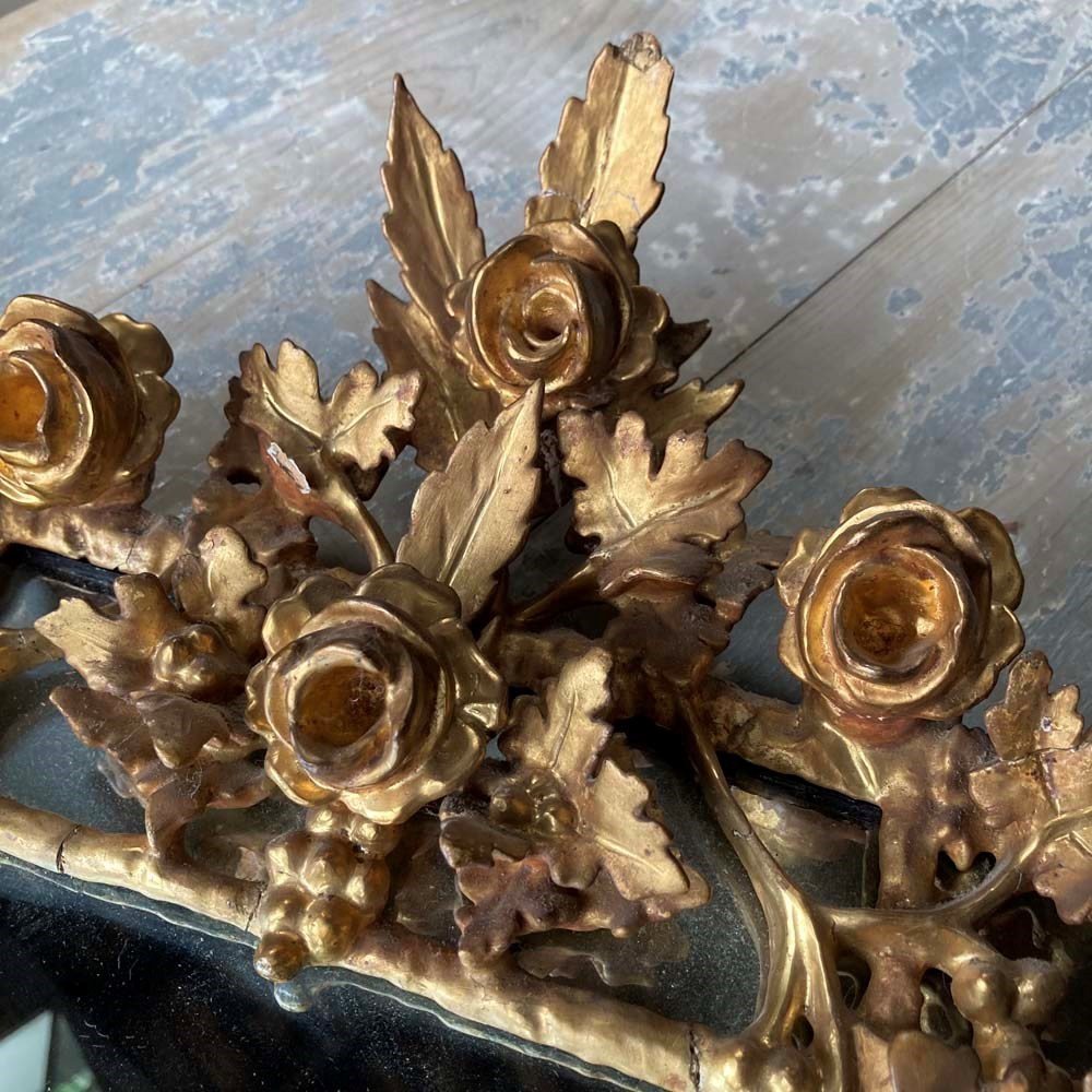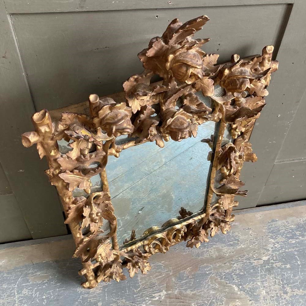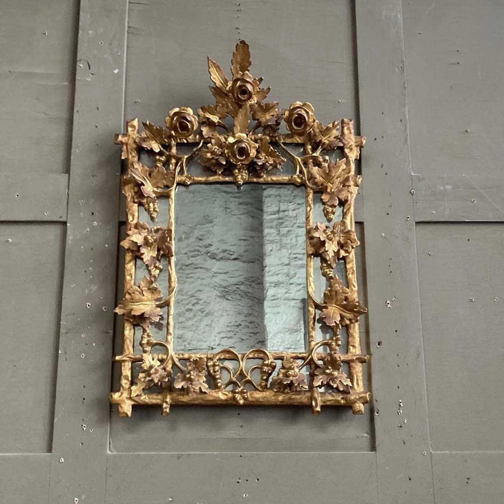 A particularly pretty mirror of compact size. The frame is composed of carved wood, with a thick gesso coating which has then been water gilded, and made to represent branch stems, vine leaves and rose flowerheads. Incredibly intricate and delicate, hence it has had some breaks and losses over its lifetime. Nonethless this is a highly decorative piece that would make a statement in any room.