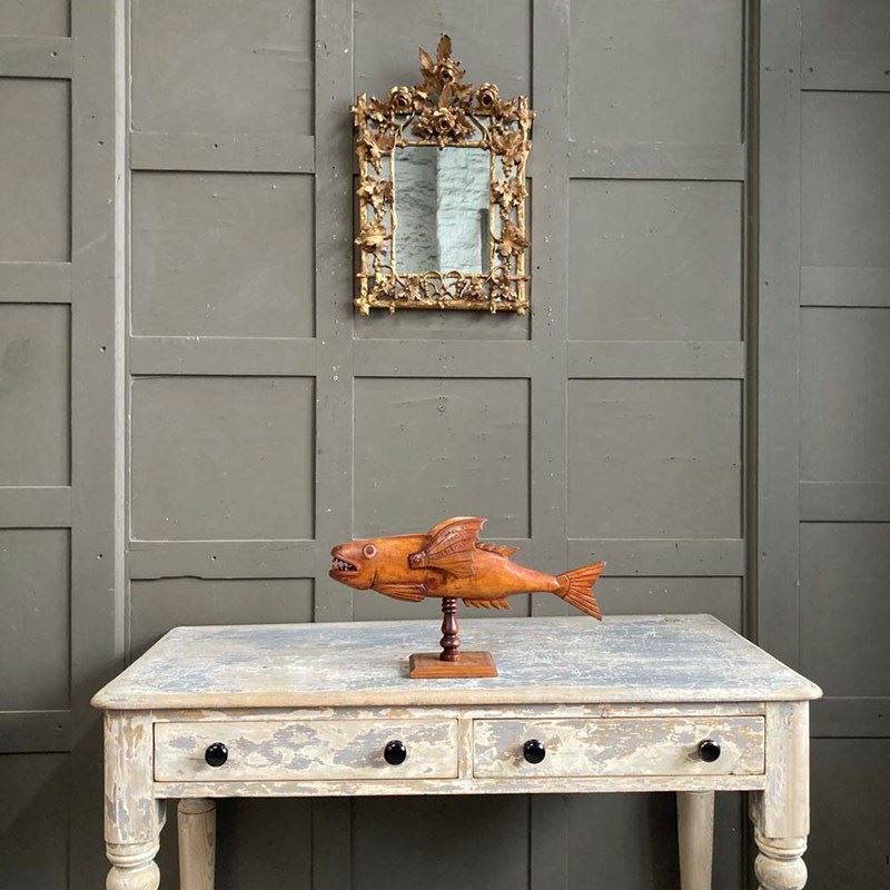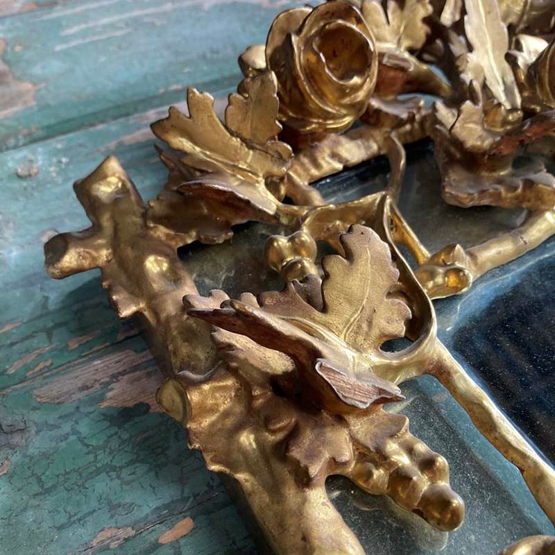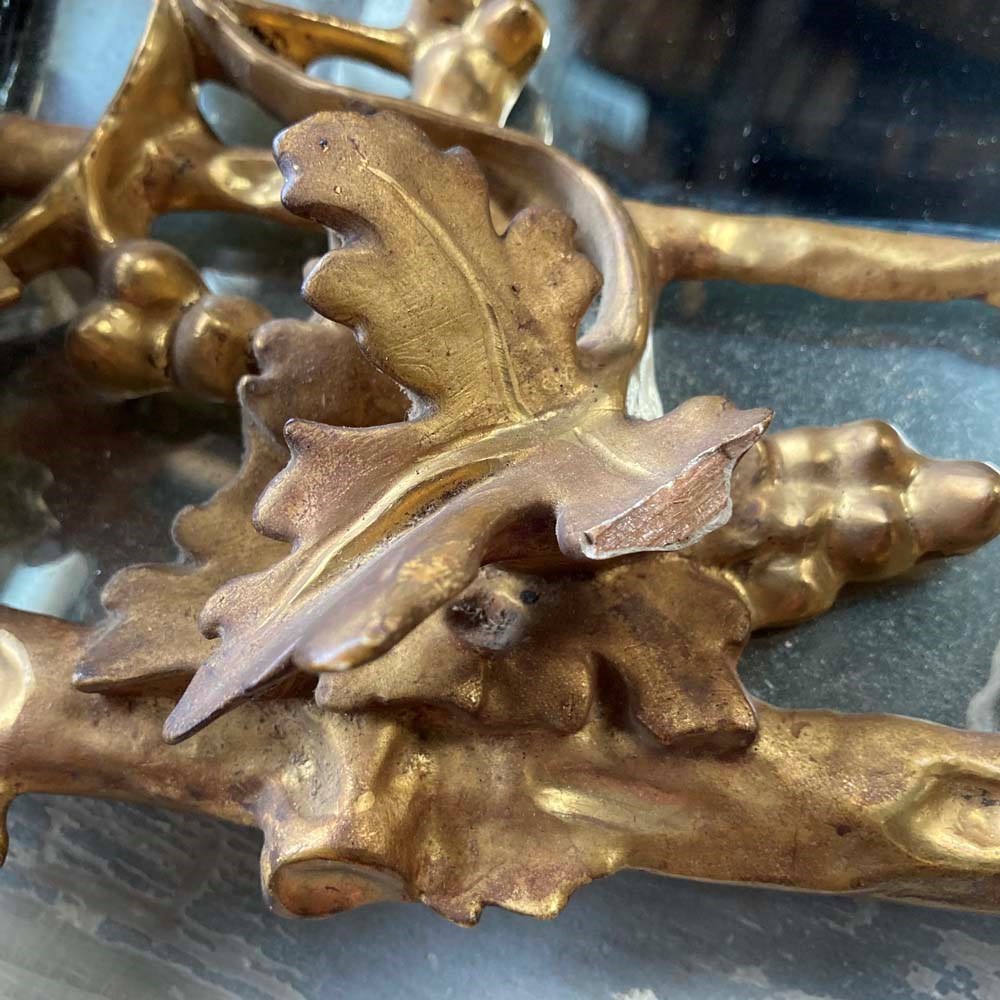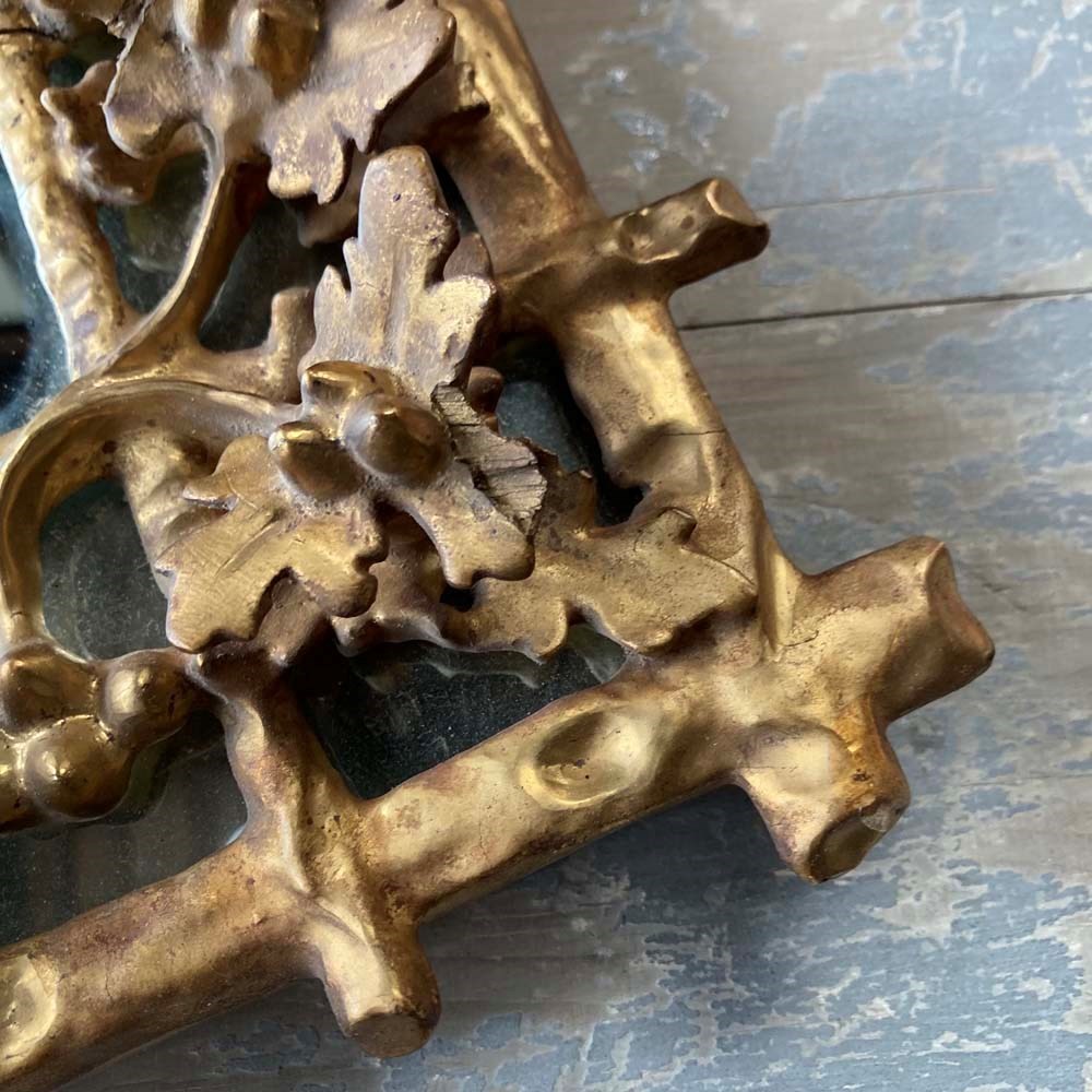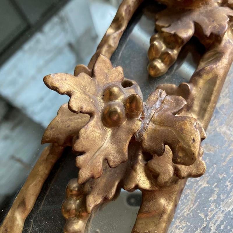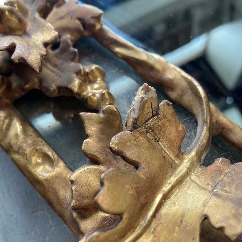 A particularly pretty mirror of compact size. The frame is composed of carved wood, with a thick gesso coating which has then been water gilded, and made to represent branch stems, vine leaves and rose flowerheads. Incredibly intricate and delicate, hence it has had some breaks and losses over its lifetime. Nonethless this is a highly decorative piece that would make a statement in any room.