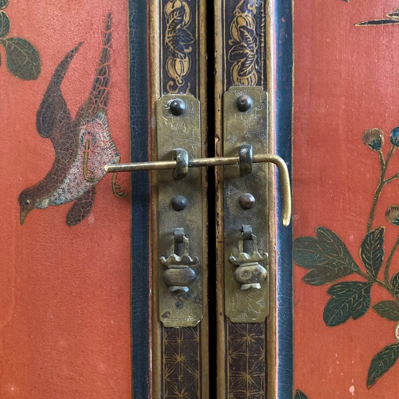 An early 20th century chinoiserie lacquered and painted cabinet, comprising of a pair of drawers over a shelved two-door cupboard. Some chips and losses to surface, as to be expected, but these do not detract from the overall bold decorative effect. The top has watermarks and stains to it, possibly where vases of flowers have been placed upon it. The portrayals of birds and insects amongst branches of blossom do however make this piece particularly attractive.