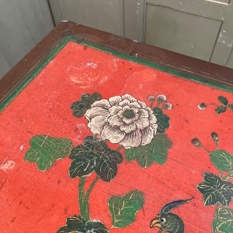 An early 20th century chinoiserie lacquered and painted cabinet, comprising of a pair of drawers over a shelved two-door cupboard. Some chips and losses to surface, as to be expected, but these do not detract from the overall bold decorative effect. The top has watermarks and stains to it, possibly where vases of flowers have been placed upon it. The portrayals of birds and insects amongst branches of blossom do however make this piece particularly attractive.