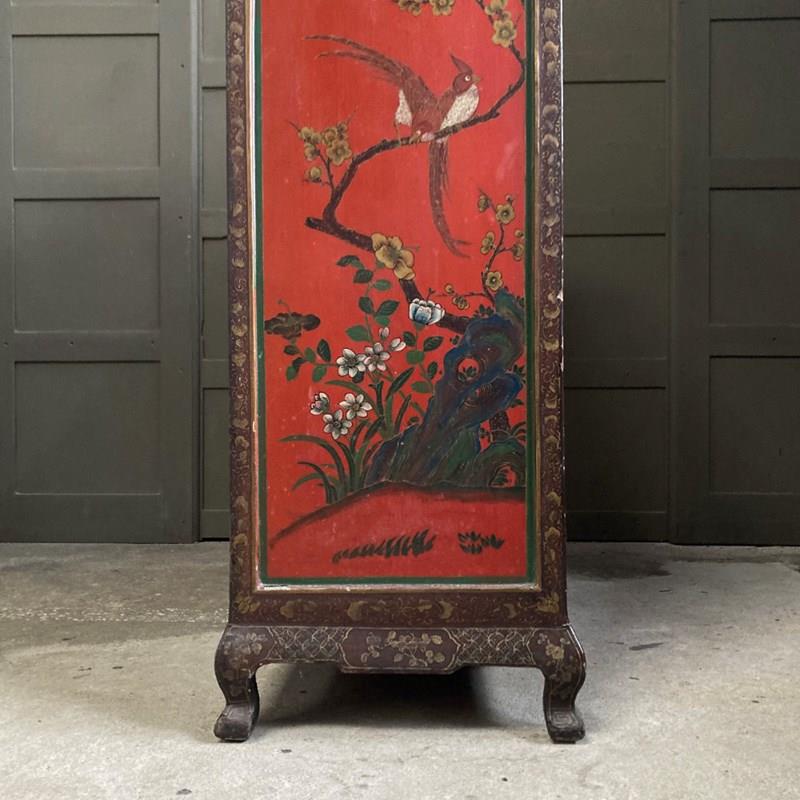 An early 20th century chinoiserie lacquered and painted cabinet, comprising of a pair of drawers over a shelved two-door cupboard. Some chips and losses to surface, as to be expected, but these do not detract from the overall bold decorative effect. The top has watermarks and stains to it, possibly where vases of flowers have been placed upon it. The portrayals of birds and insects amongst branches of blossom do however make this piece particularly attractive.