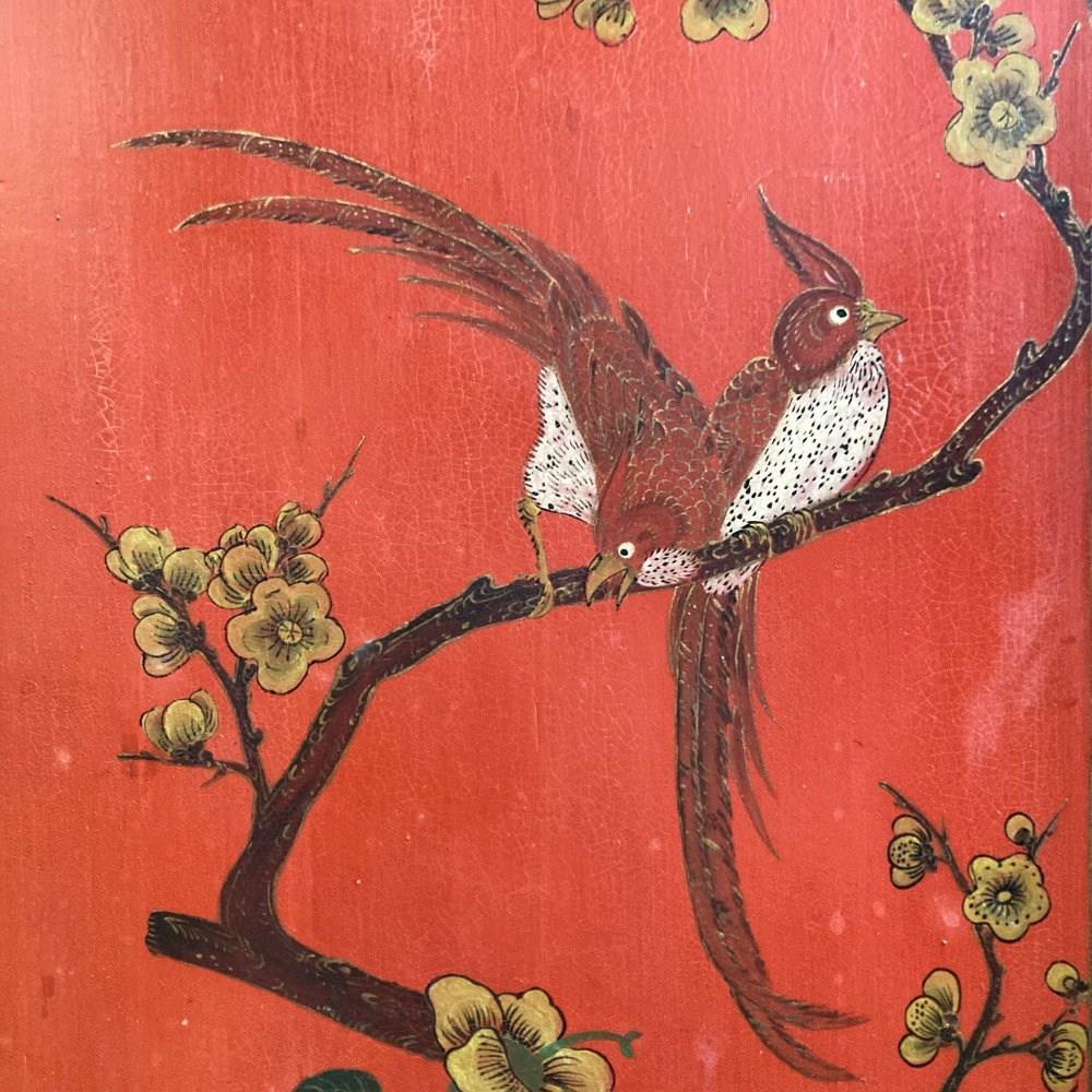 An early 20th century chinoiserie lacquered and painted cabinet, comprising of a pair of drawers over a shelved two-door cupboard. Some chips and losses to surface, as to be expected, but these do not detract from the overall bold decorative effect. The top has watermarks and stains to it, possibly where vases of flowers have been placed upon it. The portrayals of birds and insects amongst branches of blossom do however make this piece particularly attractive.