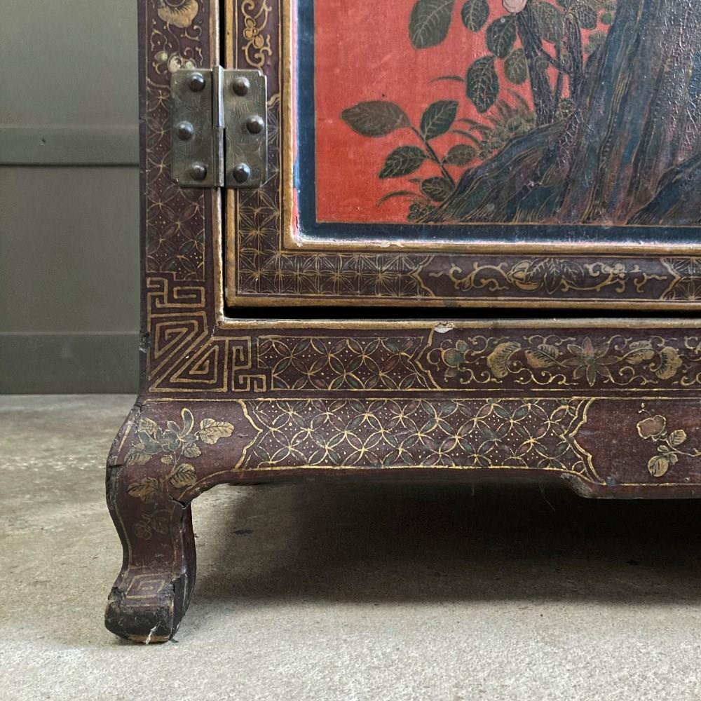 An early 20th century chinoiserie lacquered and painted cabinet, comprising of a pair of drawers over a shelved two-door cupboard. Some chips and losses to surface, as to be expected, but these do not detract from the overall bold decorative effect. The top has watermarks and stains to it, possibly where vases of flowers have been placed upon it. The portrayals of birds and insects amongst branches of blossom do however make this piece particularly attractive.